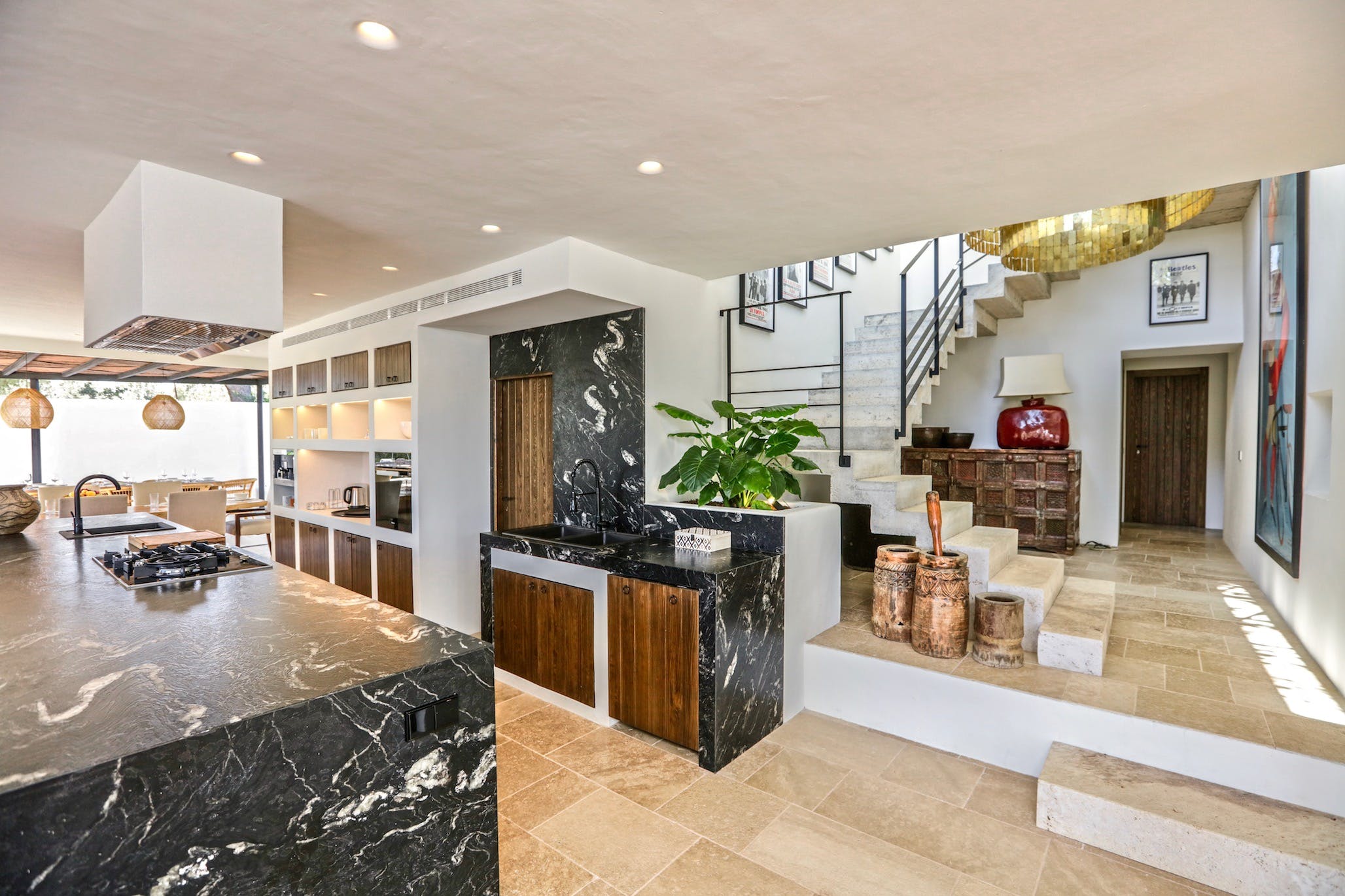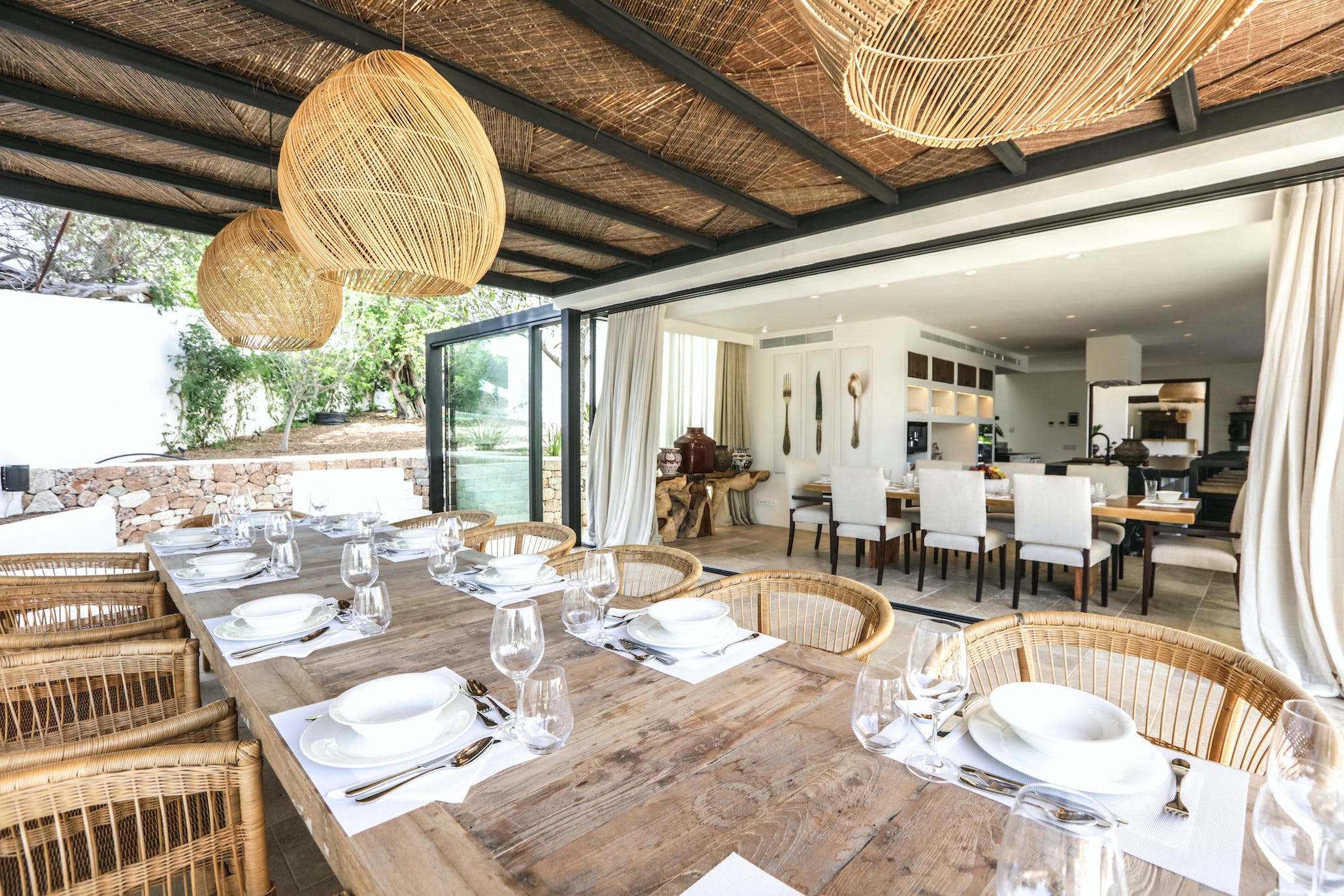 The kitchen is the heart of this villa. It is designed to entertain and cater for large groups or families. Windows slide into the beautiful distant views of the farm on one side and the indoor/outdoor dining patio on the other, leading to a fully equipped outdoor kitchen, beautifully manicured gardens and lawn, swimming pool, tennis court and pavilion.
