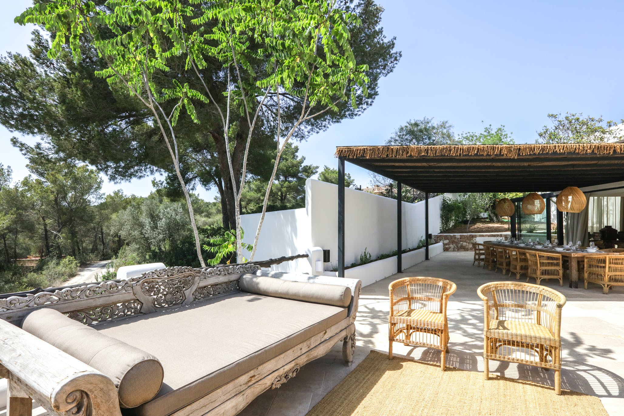 Also off the kitchen in the center of the house is the large covered summer living room with a giant U-shaped sofa facing the beautiful view. Attached to the summer room is the outbuilding with a bar and lounge area. The bar has ice maker, sink and a professional beverage cooler.