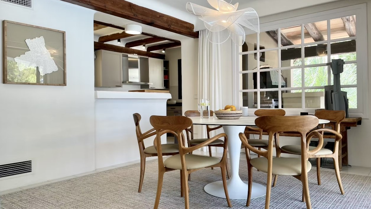 The property is furnished to a high standard colour co-ordinated with the soft furnishings to give the villa a warm modern style. A beautifully designed living room, with a luxuriously comfortable sofa and large flat screen TV opens out onto the pool terrace, while the fully equipped modern kitchen includes a dining area, which also opens out onto the pool terrace by the al fresco dining area.