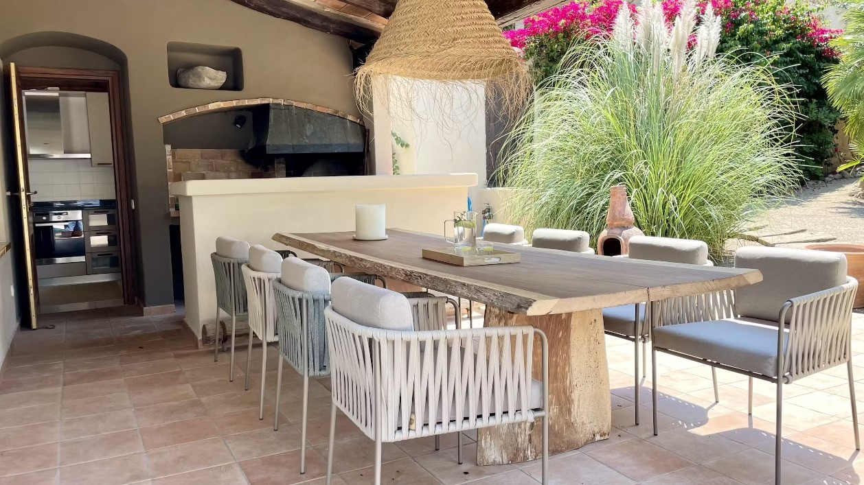 The spacious outdoor areas include a swimming pool with sun loungers, and a charming al fresco dining area with barbecue.