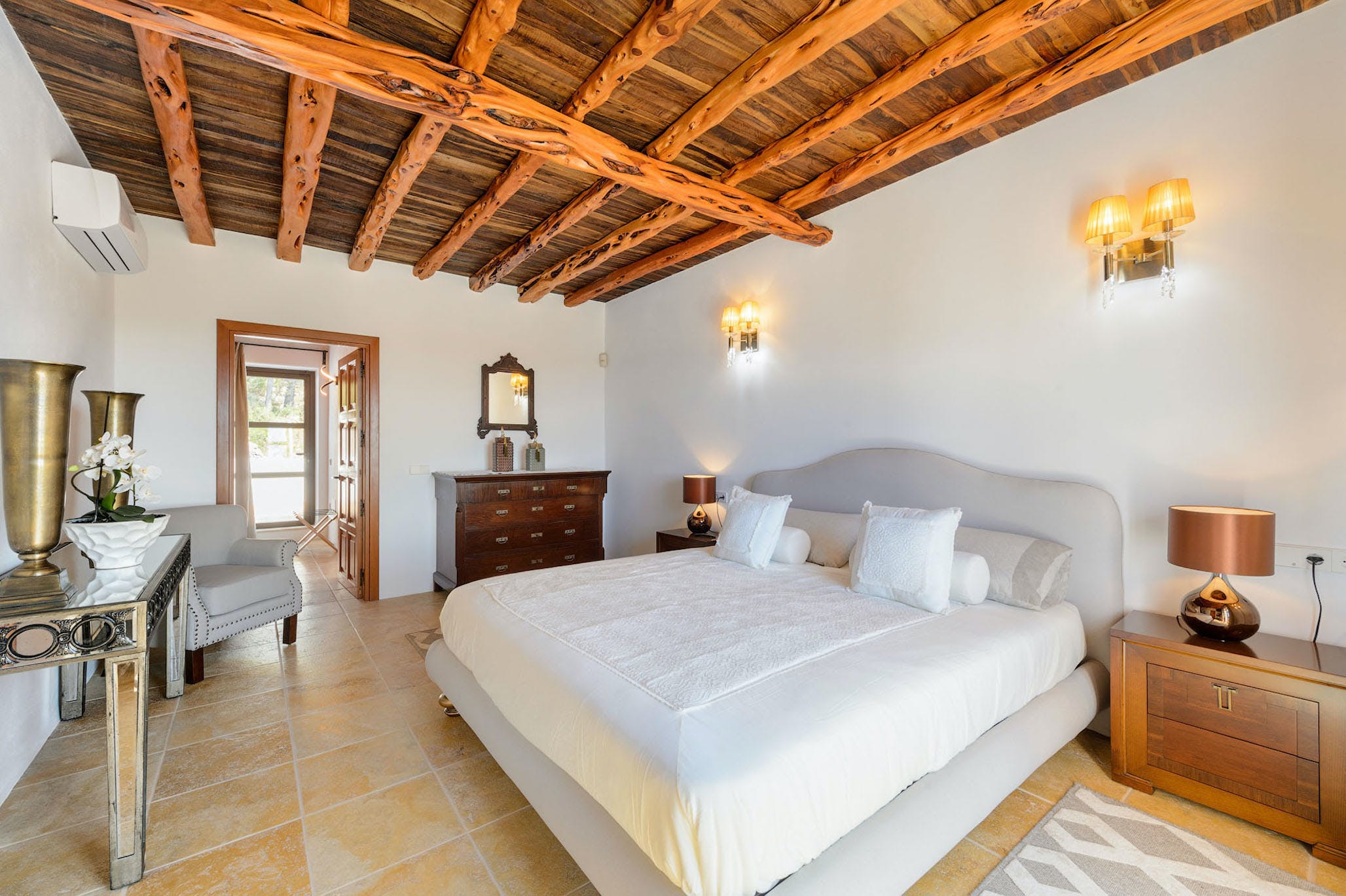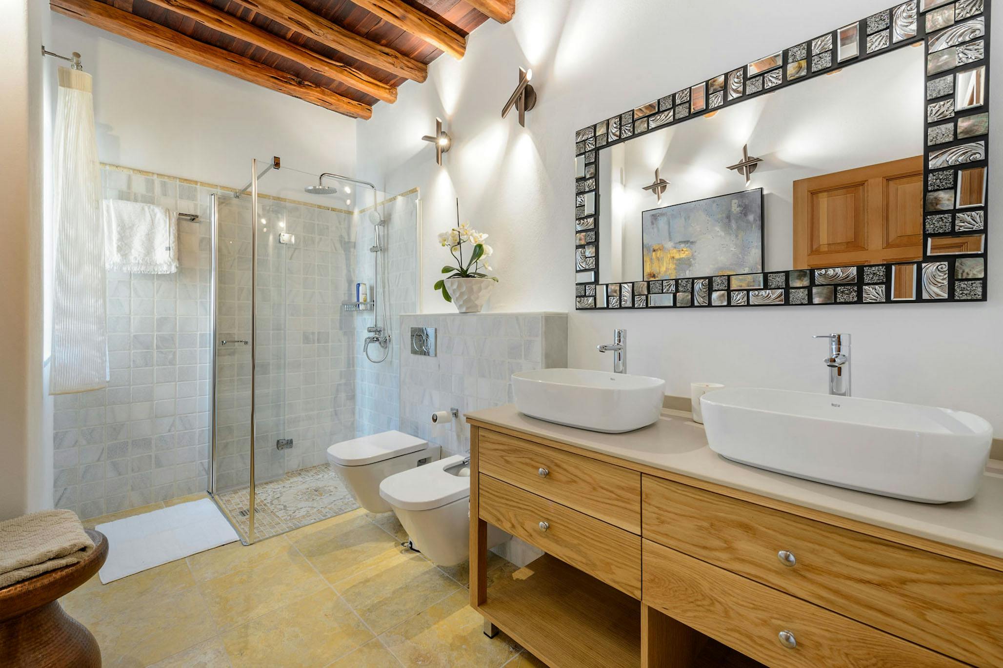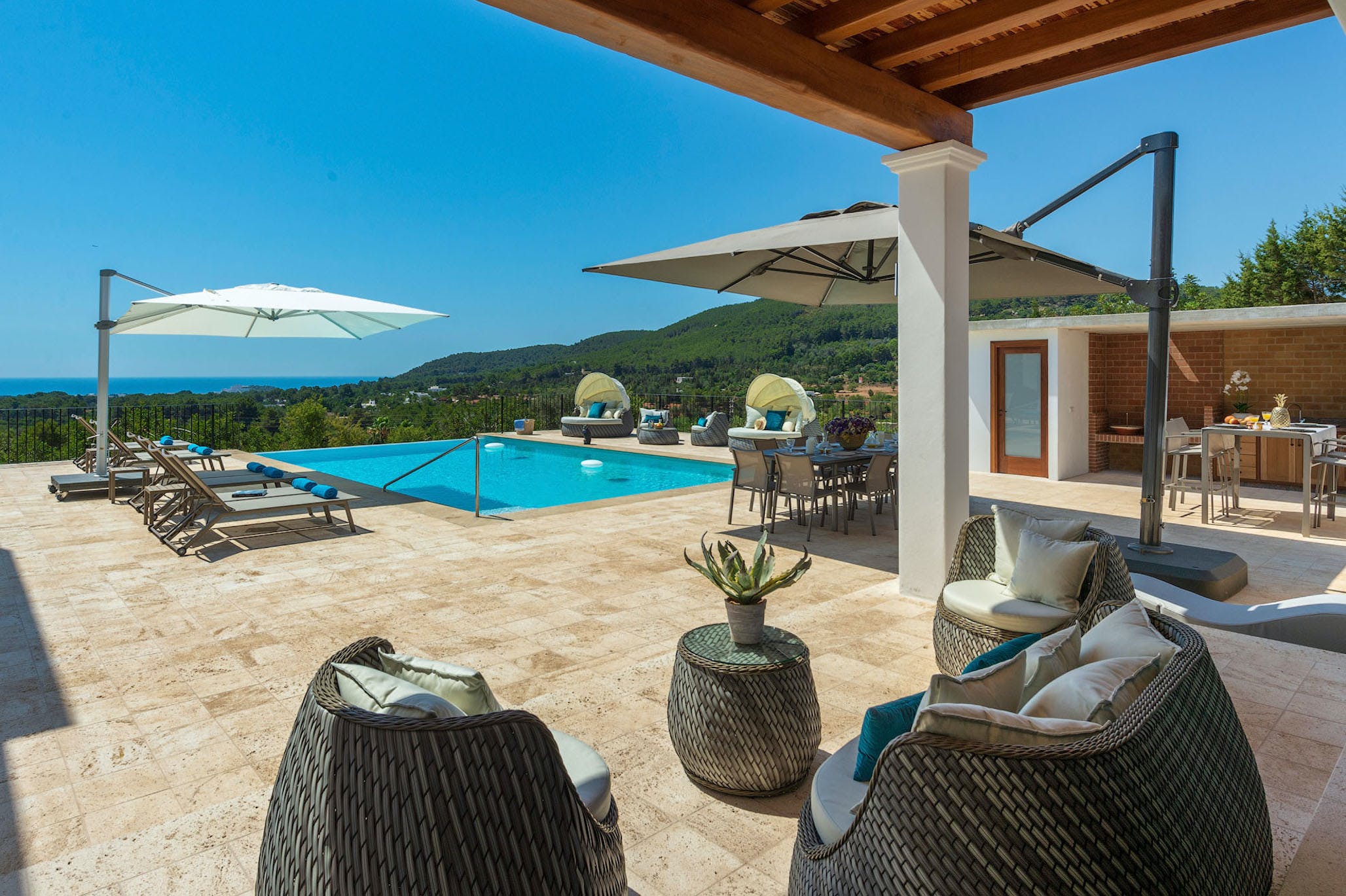 Inside, the property is in immaculate condition; a pure white atmosphere captures the light and the feel of the island. The living room stands out for its style and luminosity with its large comfortable sofas, flat screen television with satellite, and high-end furnishings accented with minimalist touches. There is a complete guest bathroom with shower located by the living room.