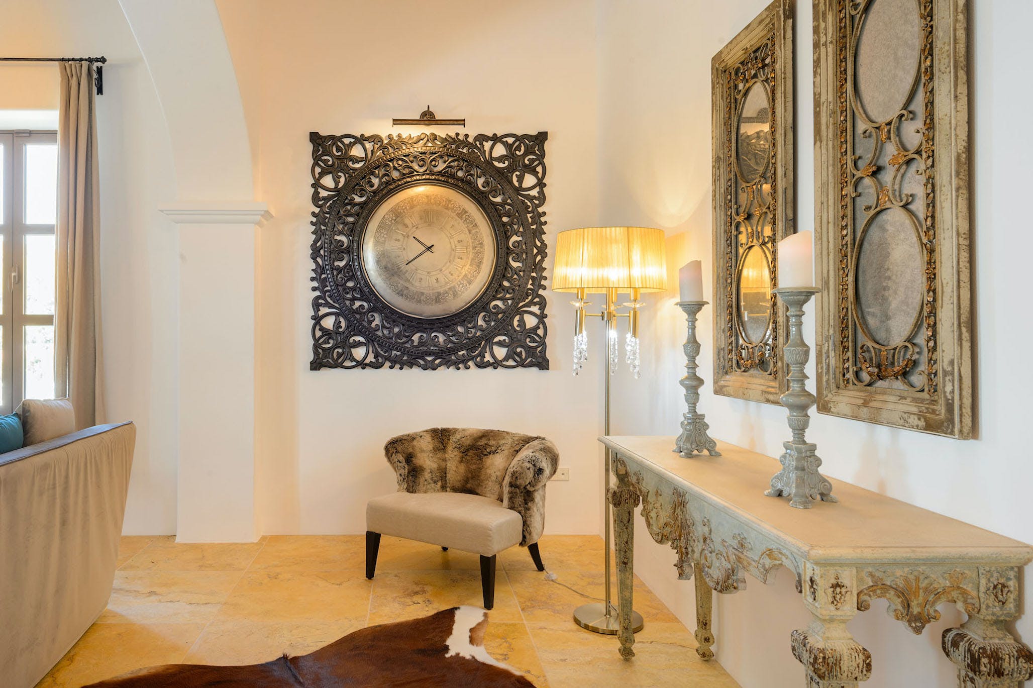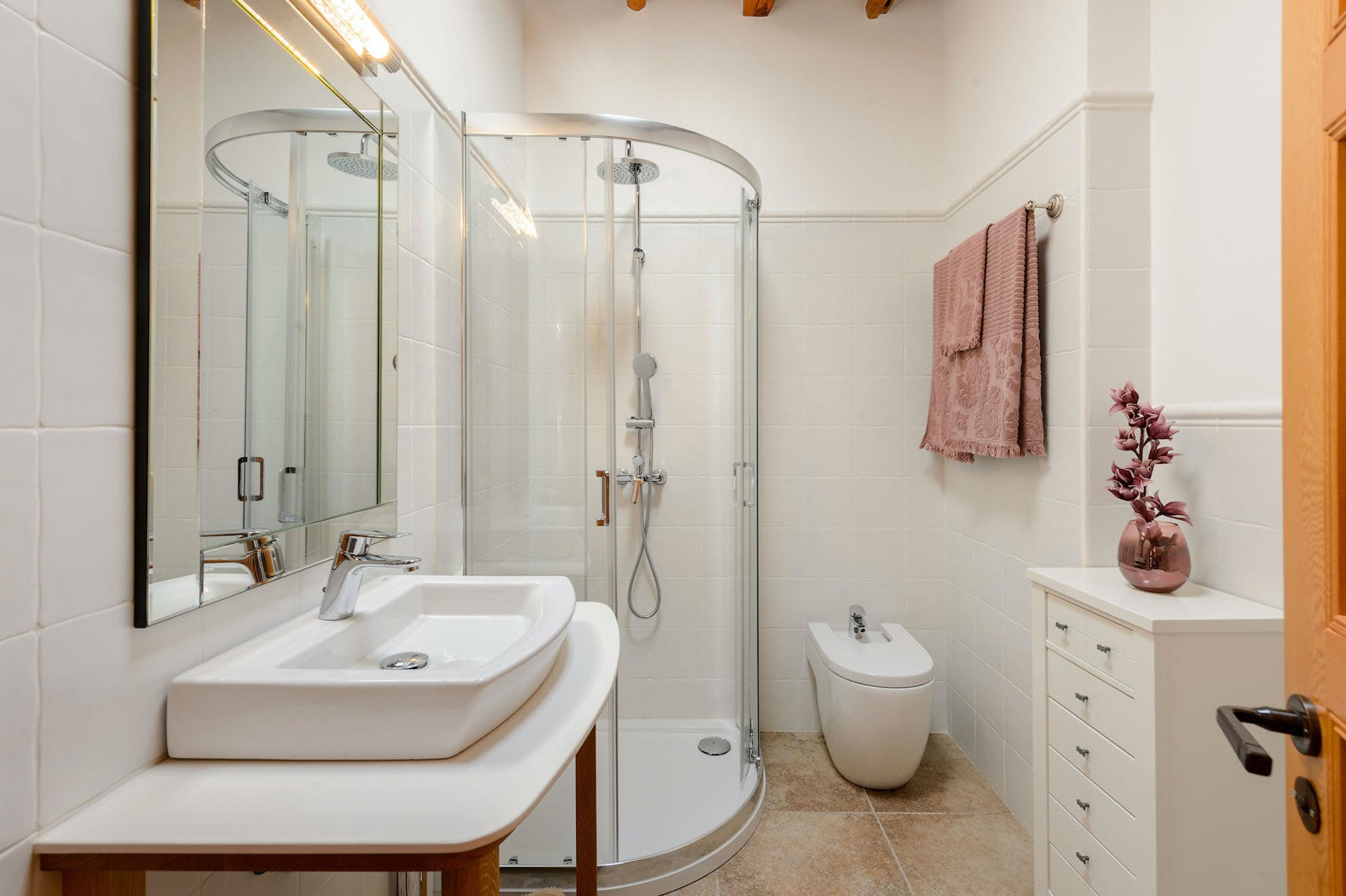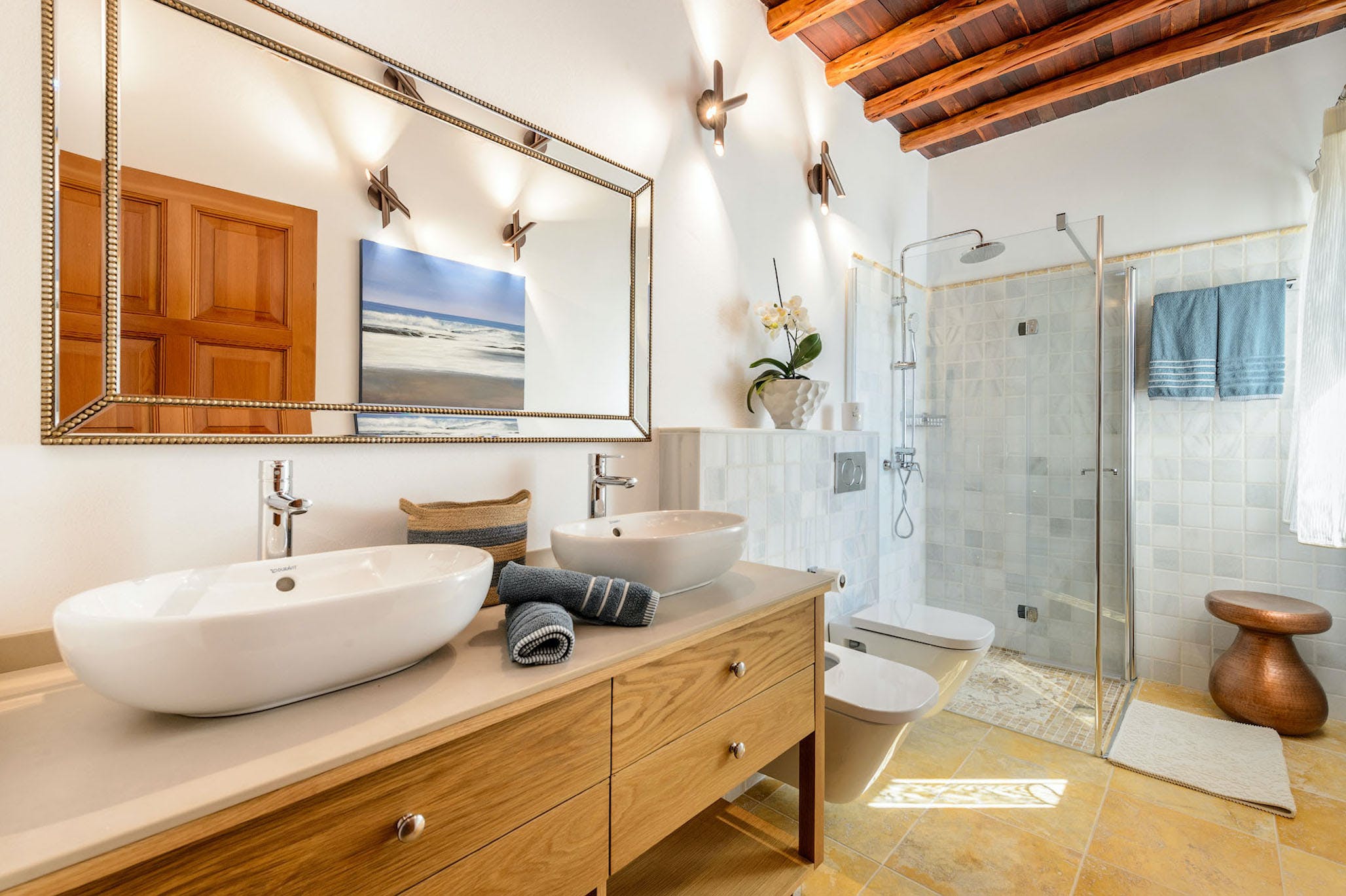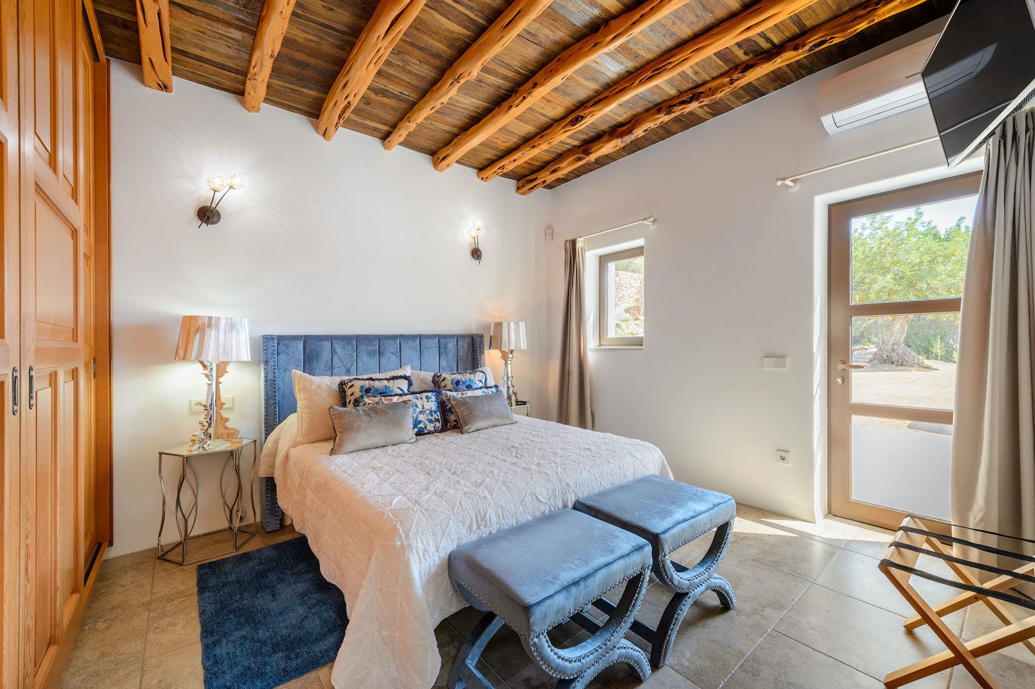 Inside, the property is in immaculate condition; a pure white atmosphere captures the light and the feel of the island. The living room stands out for its style and luminosity with its large comfortable sofas, flat screen television with satellite, and high-end furnishings accented with minimalist touches. There is a complete guest bathroom with shower located by the living room.