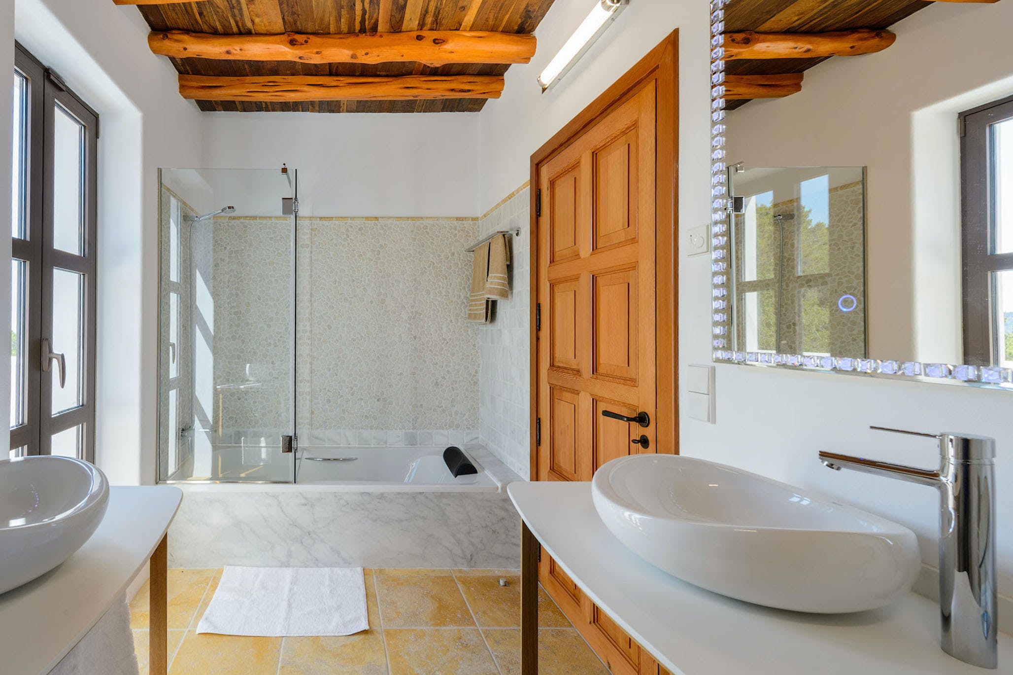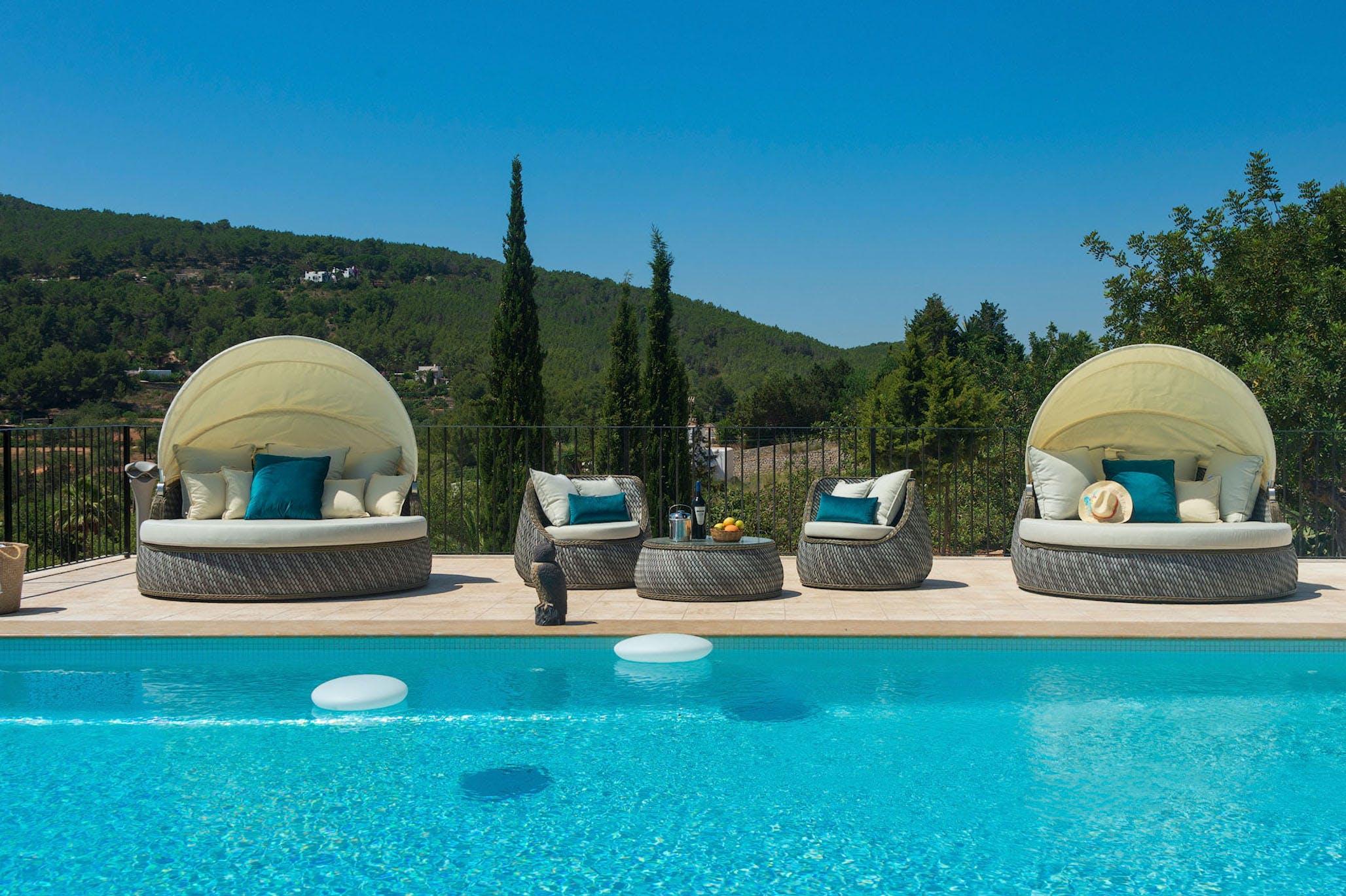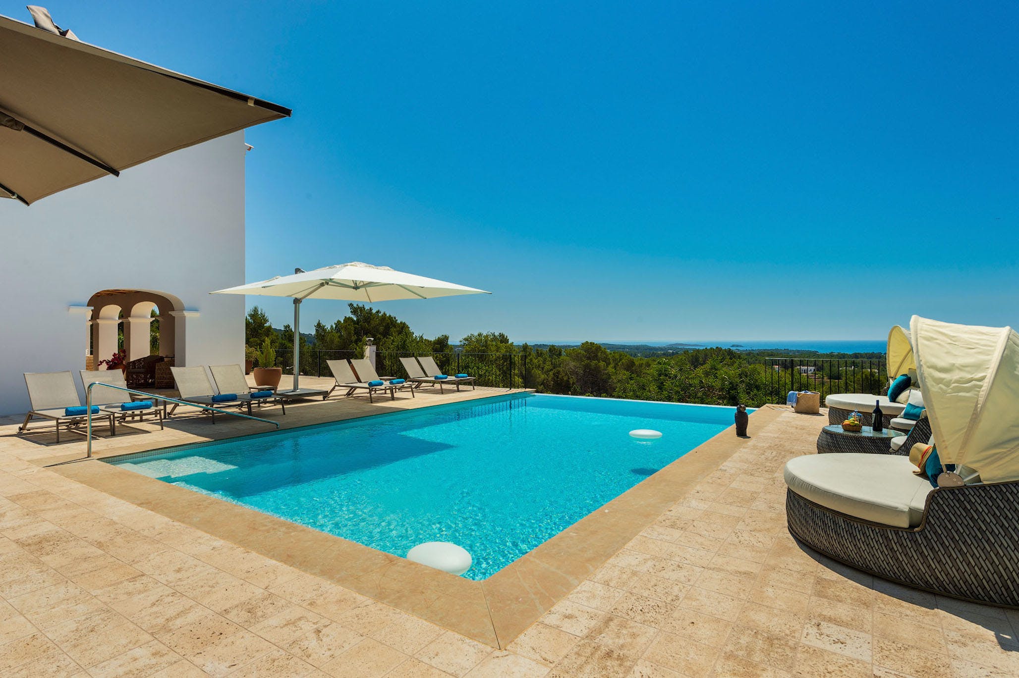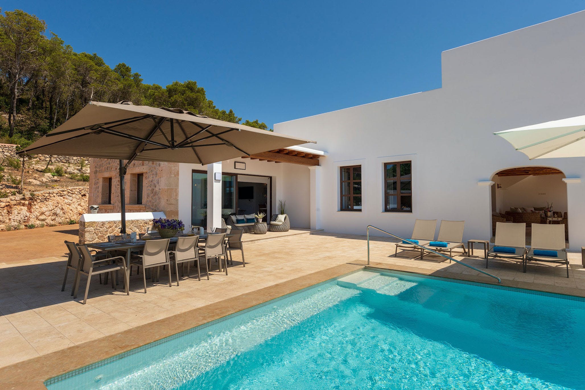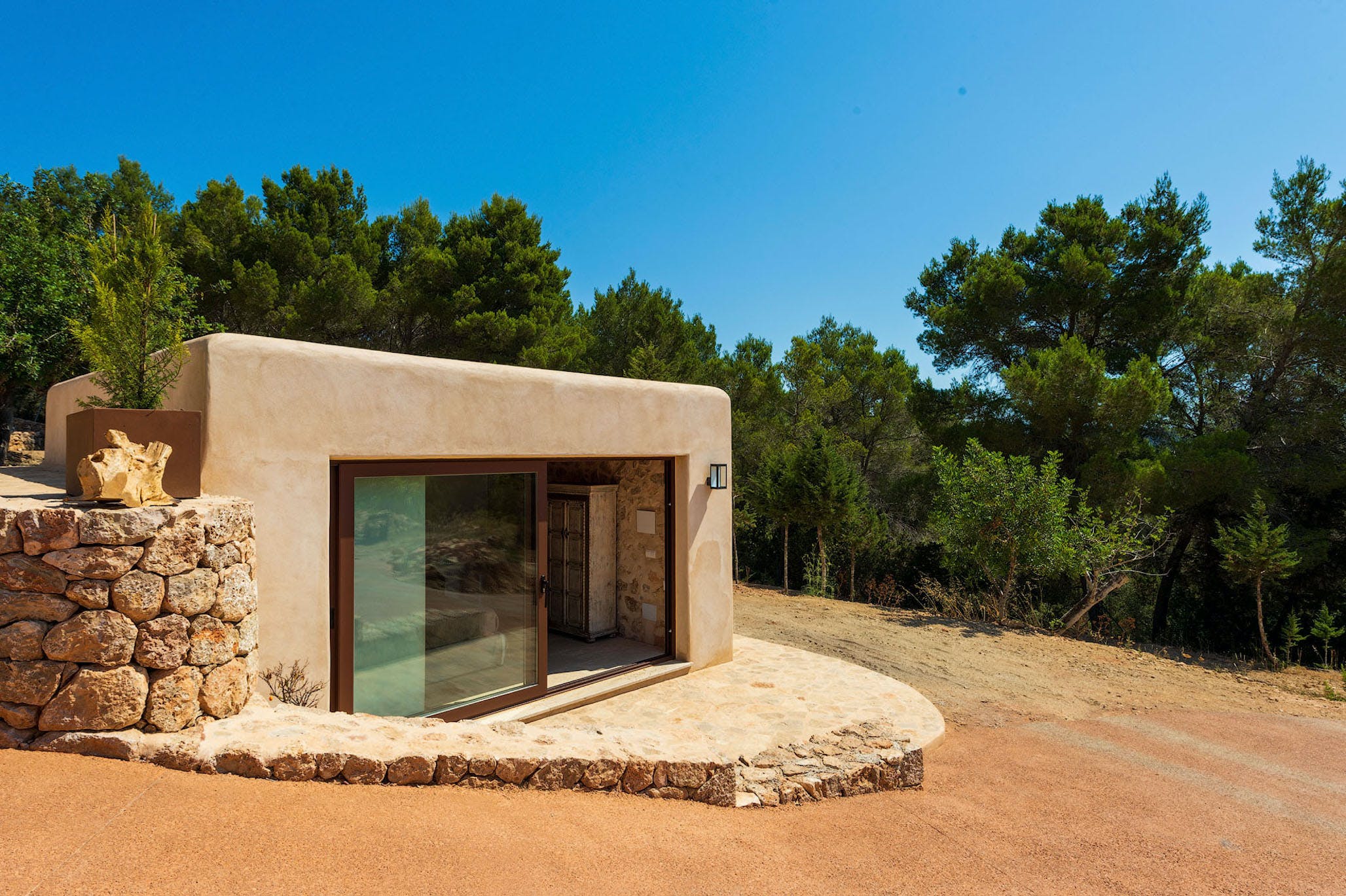 This luxury property has 600m2, located on a private plot of approximately 50,000m2 giving plenty of space to enjoy your stay in Ibiza. There is a large parking area with both covered and uncovered areas for several cars.
