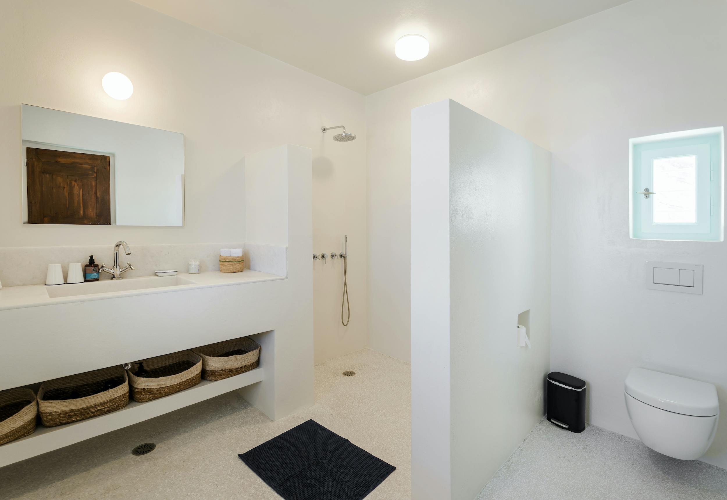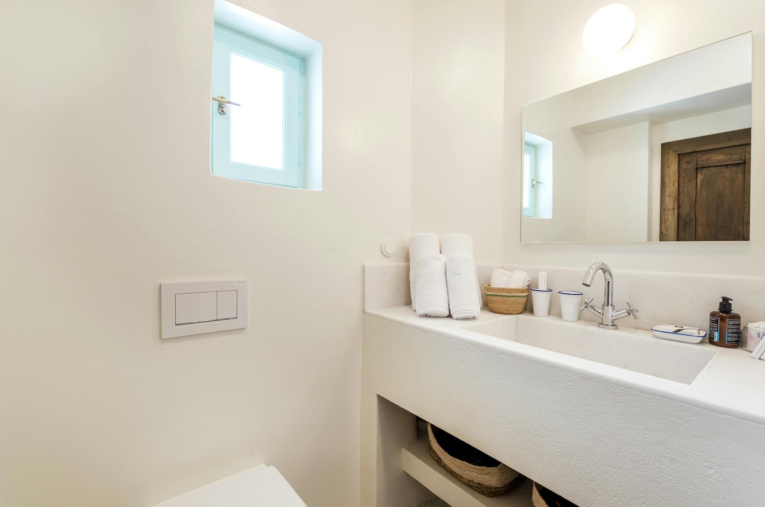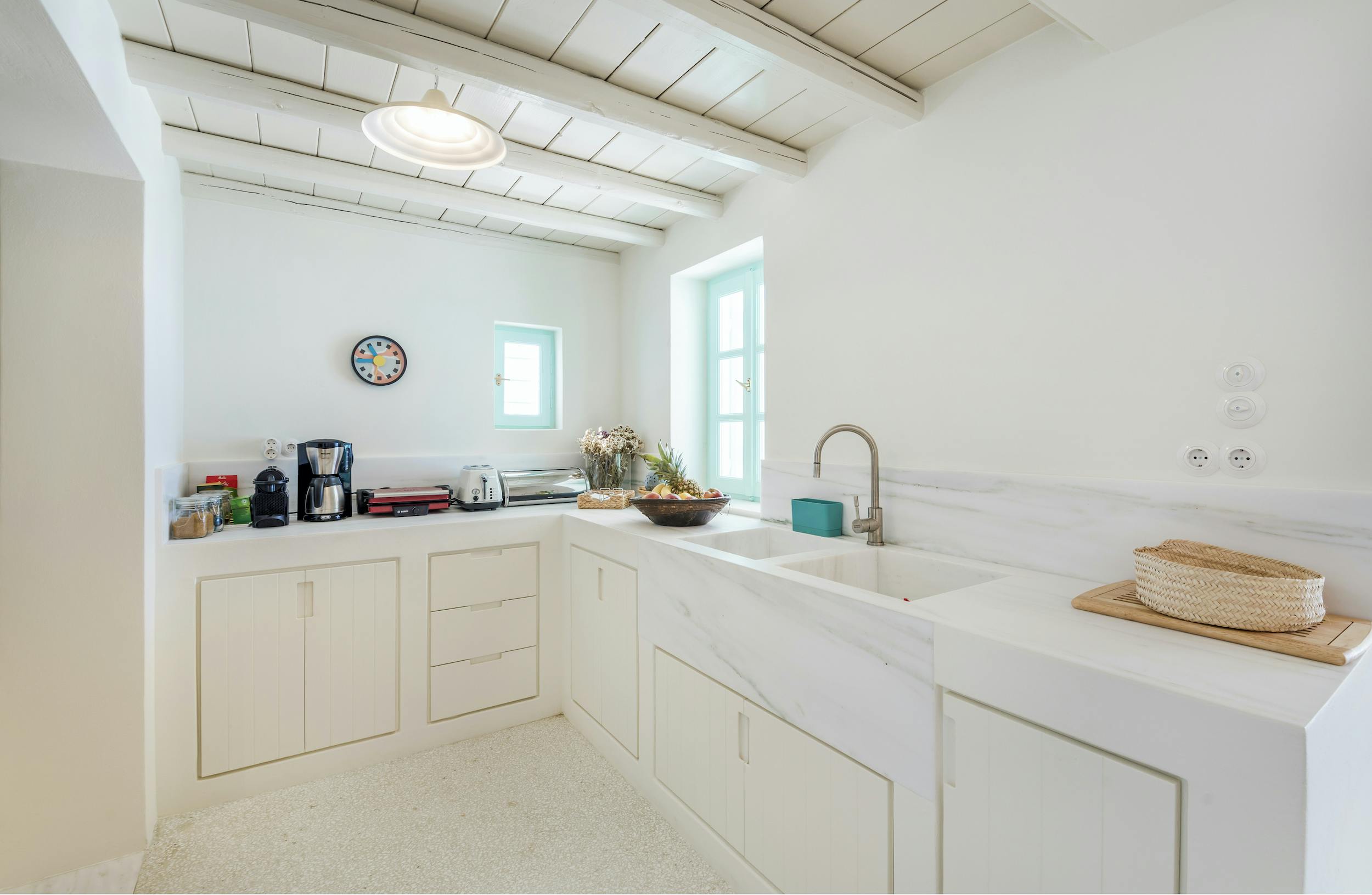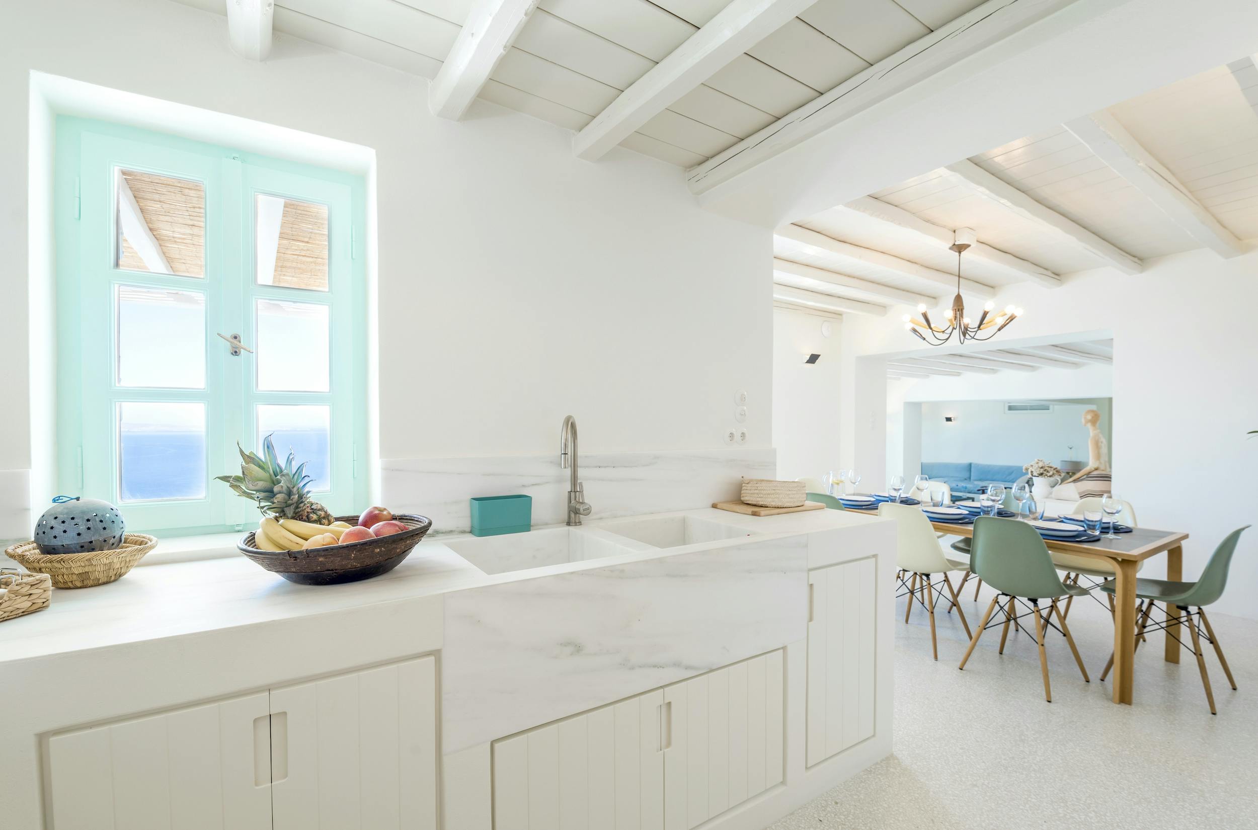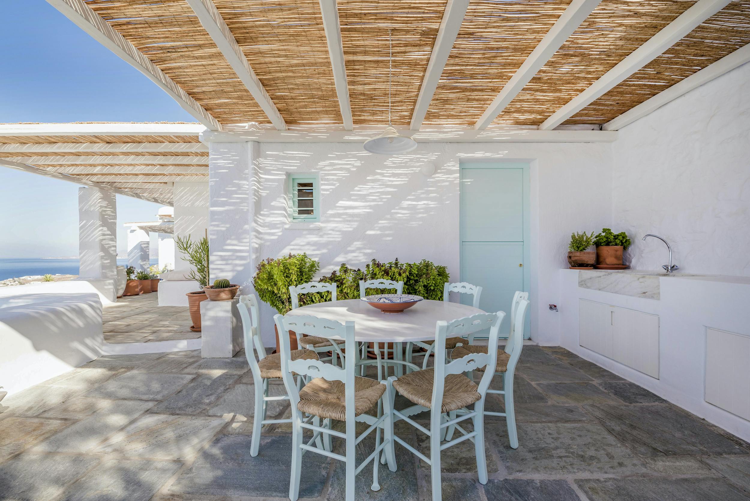 The villa’s cool interiors feature pristine terrazzo floors throughout, rustic wood-carved doors, traditional ceramic tiles and superior local marble for the bathrooms and kitchen. Outside, a variety of terraces, balconies and niches distributed around the property allow for increased privacy even among a large group of guests.