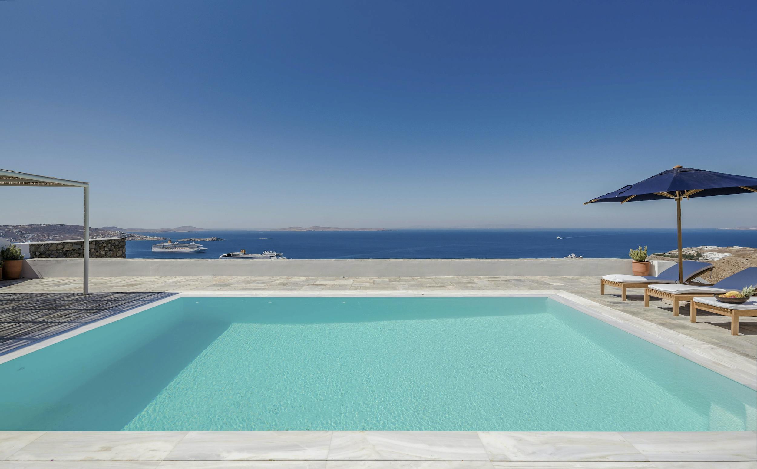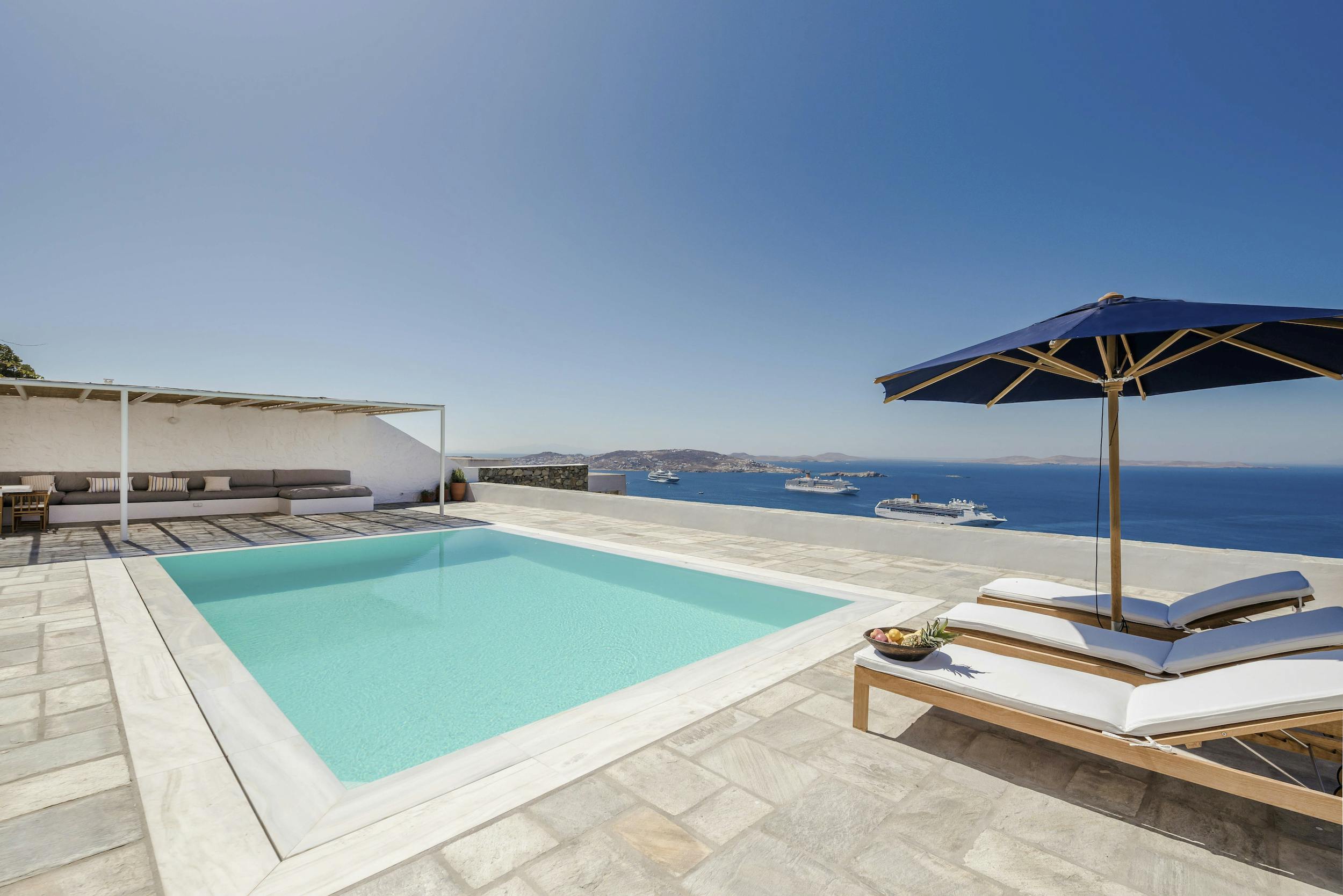 Pool Level Separate Entrance – Double room, air conditioning, en-suite bathroom with shower, safe box, Sonos speakers, sea view.