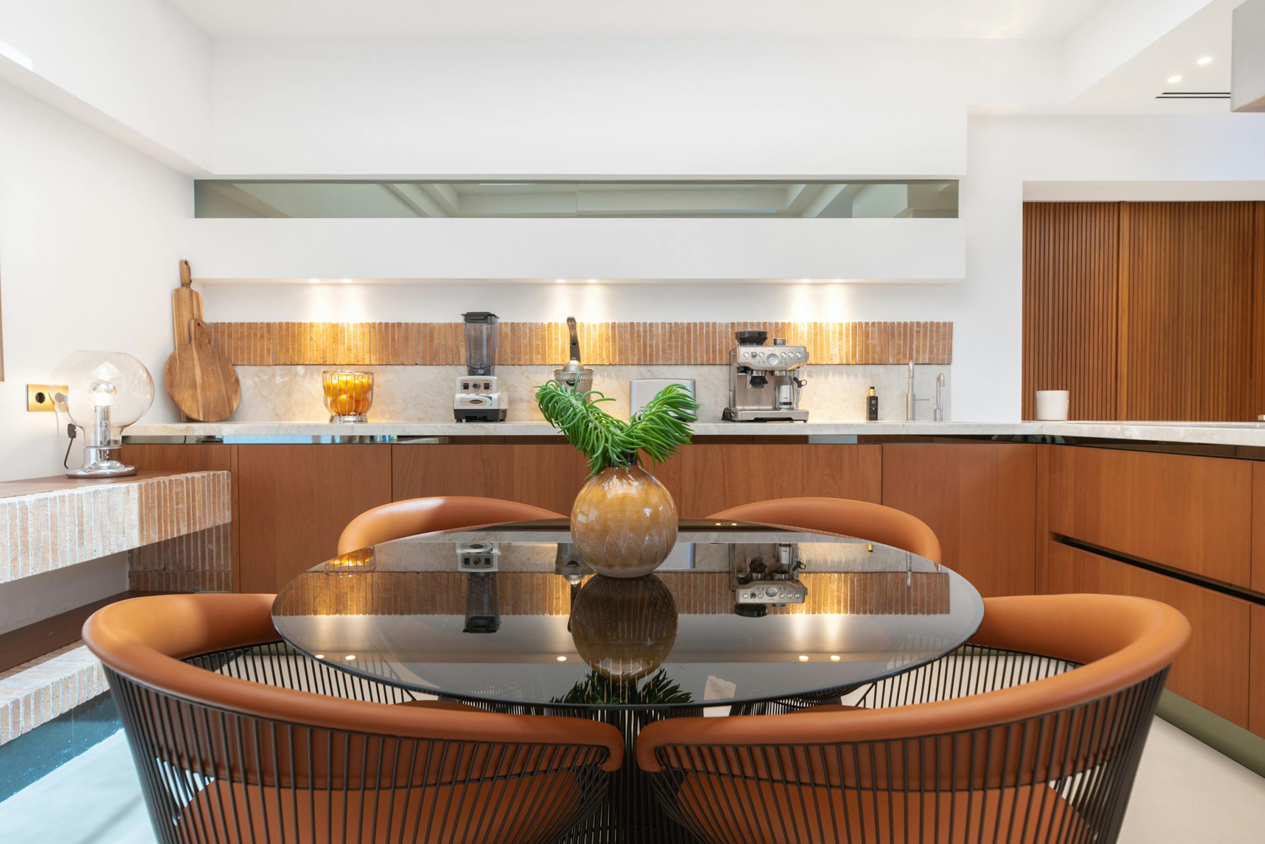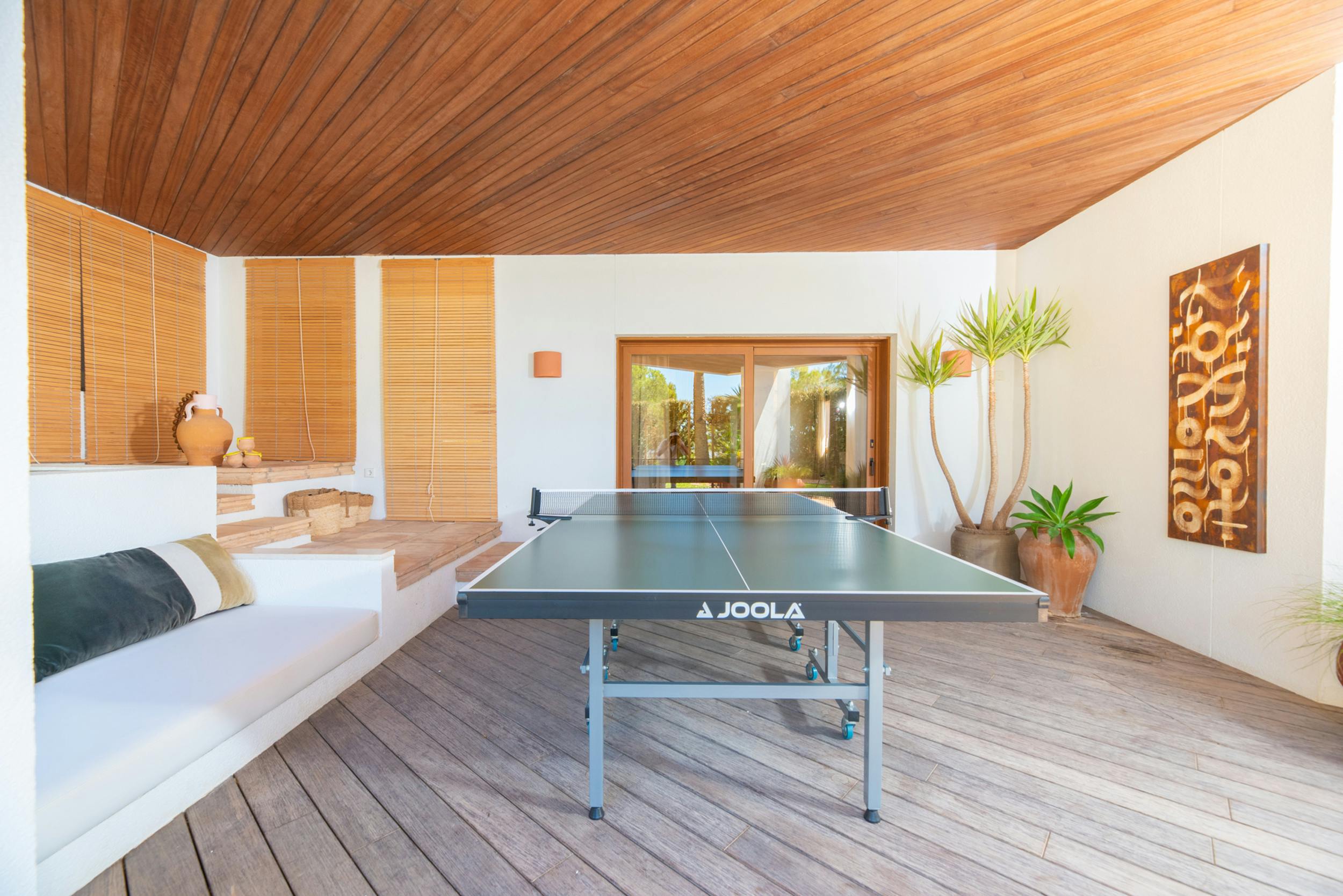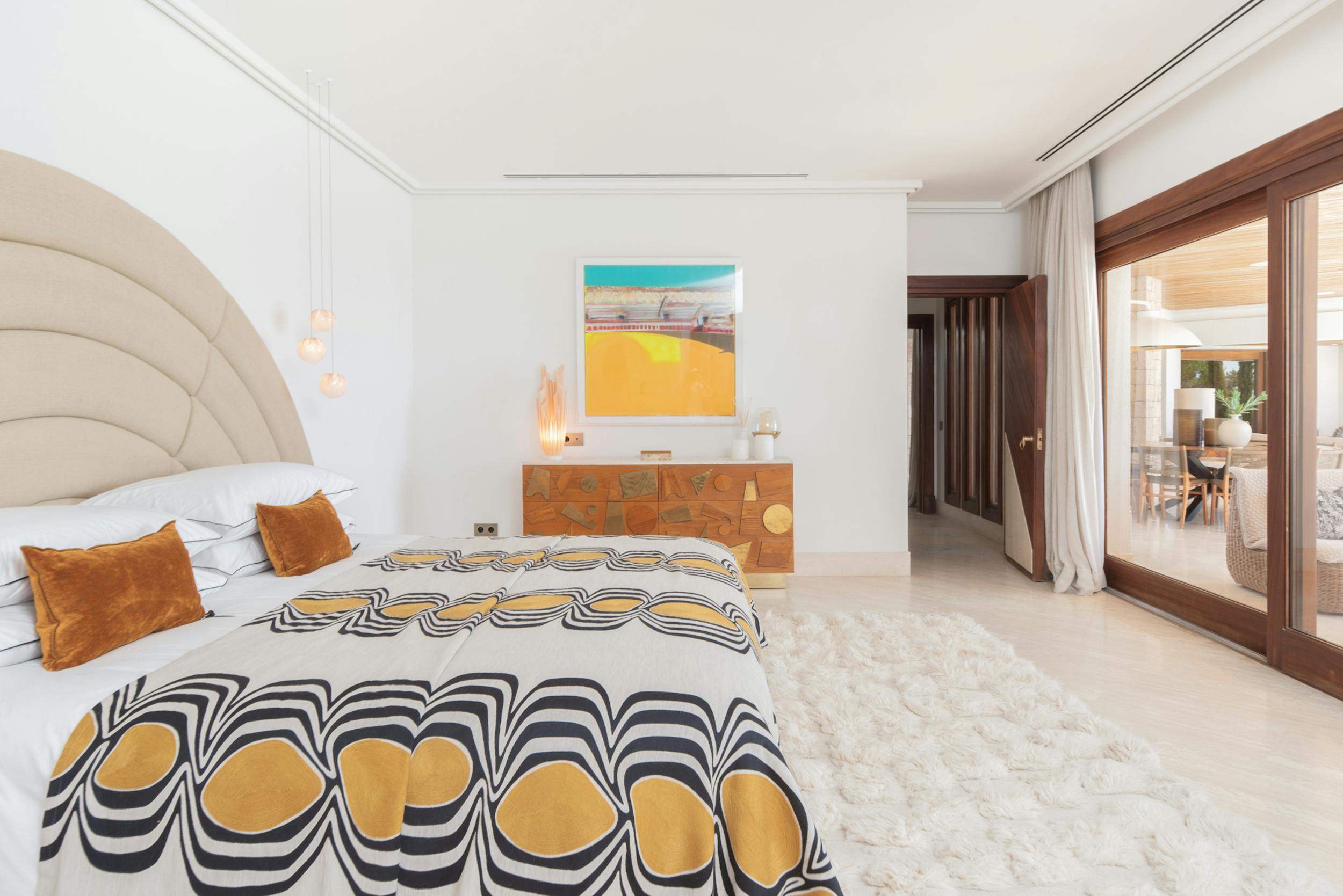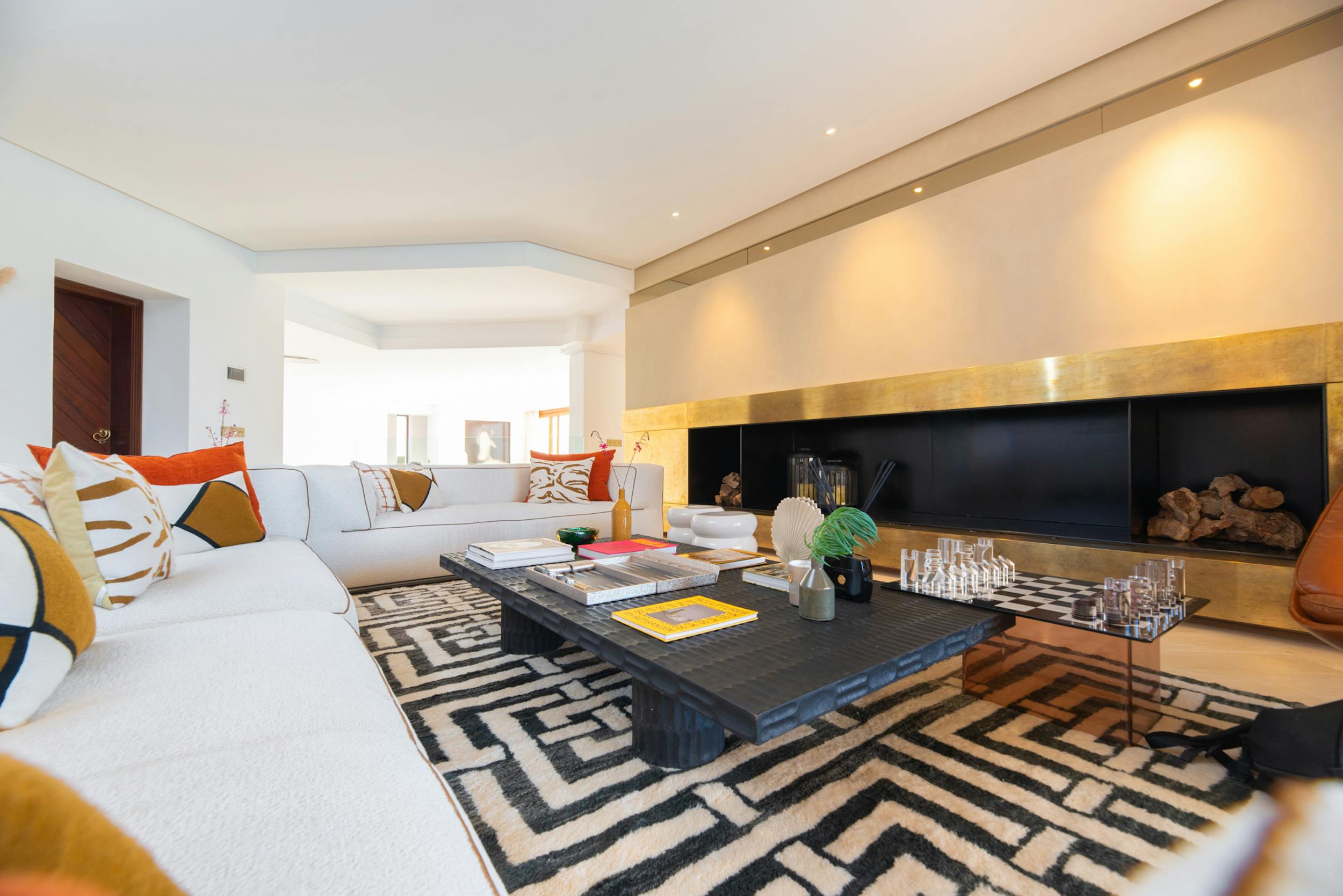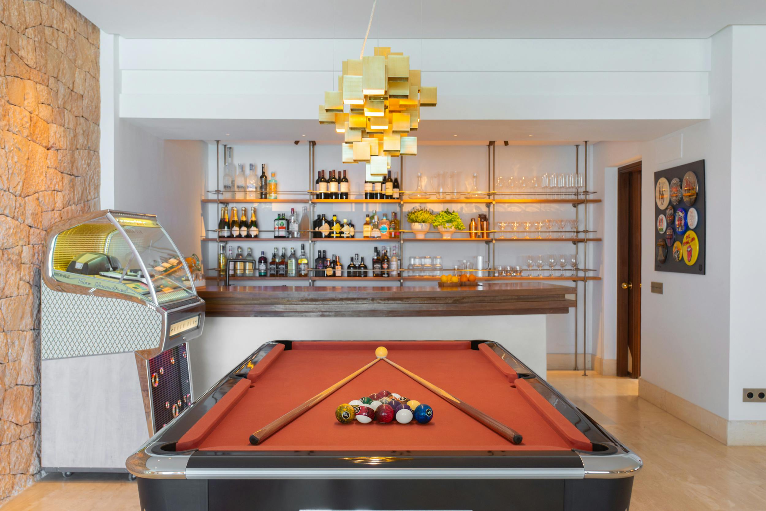 Designed to harmonise panoramic views with intimate retreats, the residence boasts two covered outdoor dining areas, including one beside the pool and another on the decking adjacent to the outdoor kitchen. The sociable open-plan living area, complete with a fully equipped bar, jukebox, and pool table, seamlessly connects with the covered terrace and pool terrace, blurring the lines between indoor and outdoor living. The integration is further enhanced by a fully integrated Airplay music system and floor-standing B&O speakers.