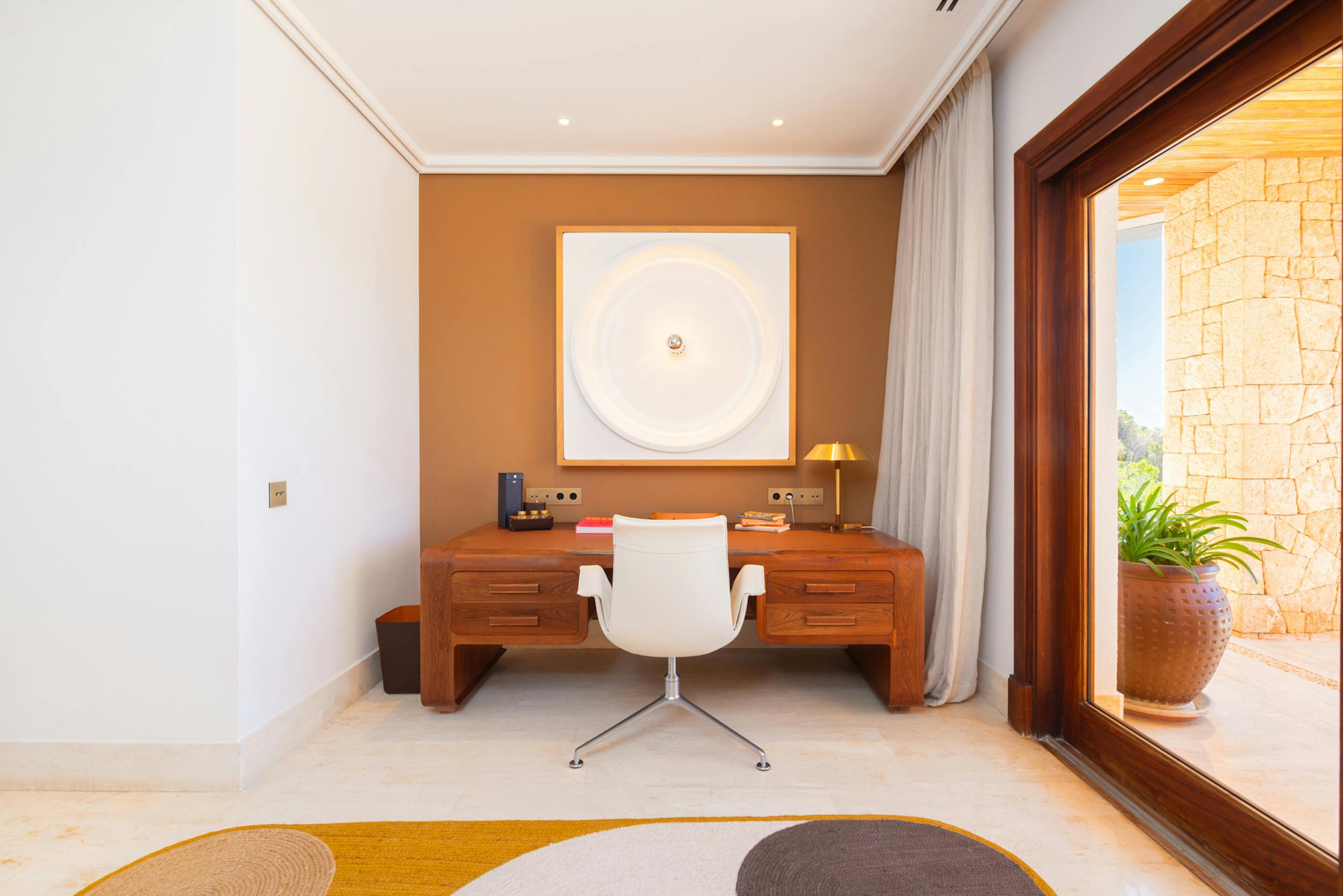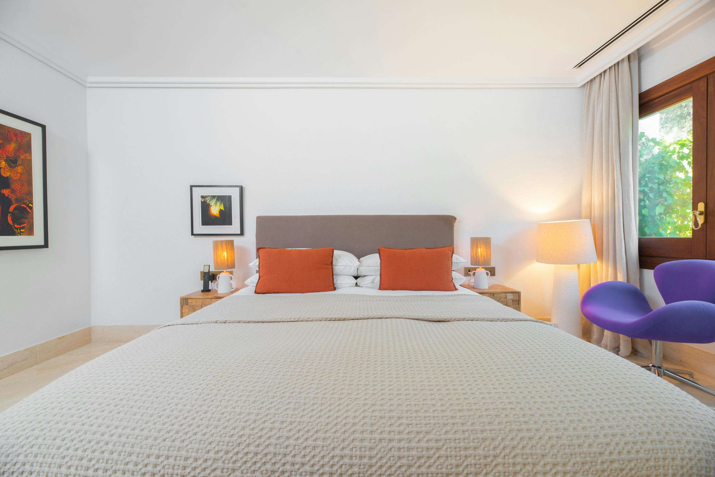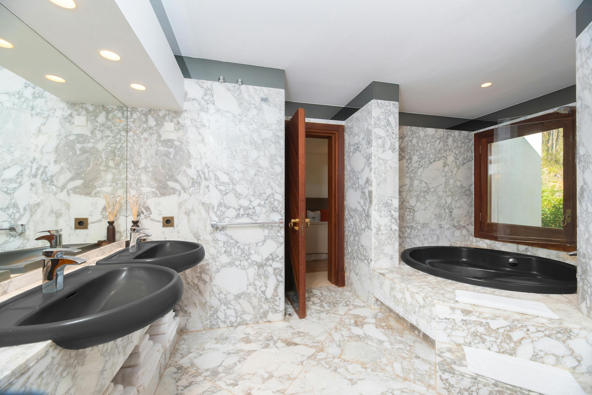 Huge double room, air conditioning, 55″ TV with global channels in every language, en-suite bathroom, dressing room, office space, access to pool terrace