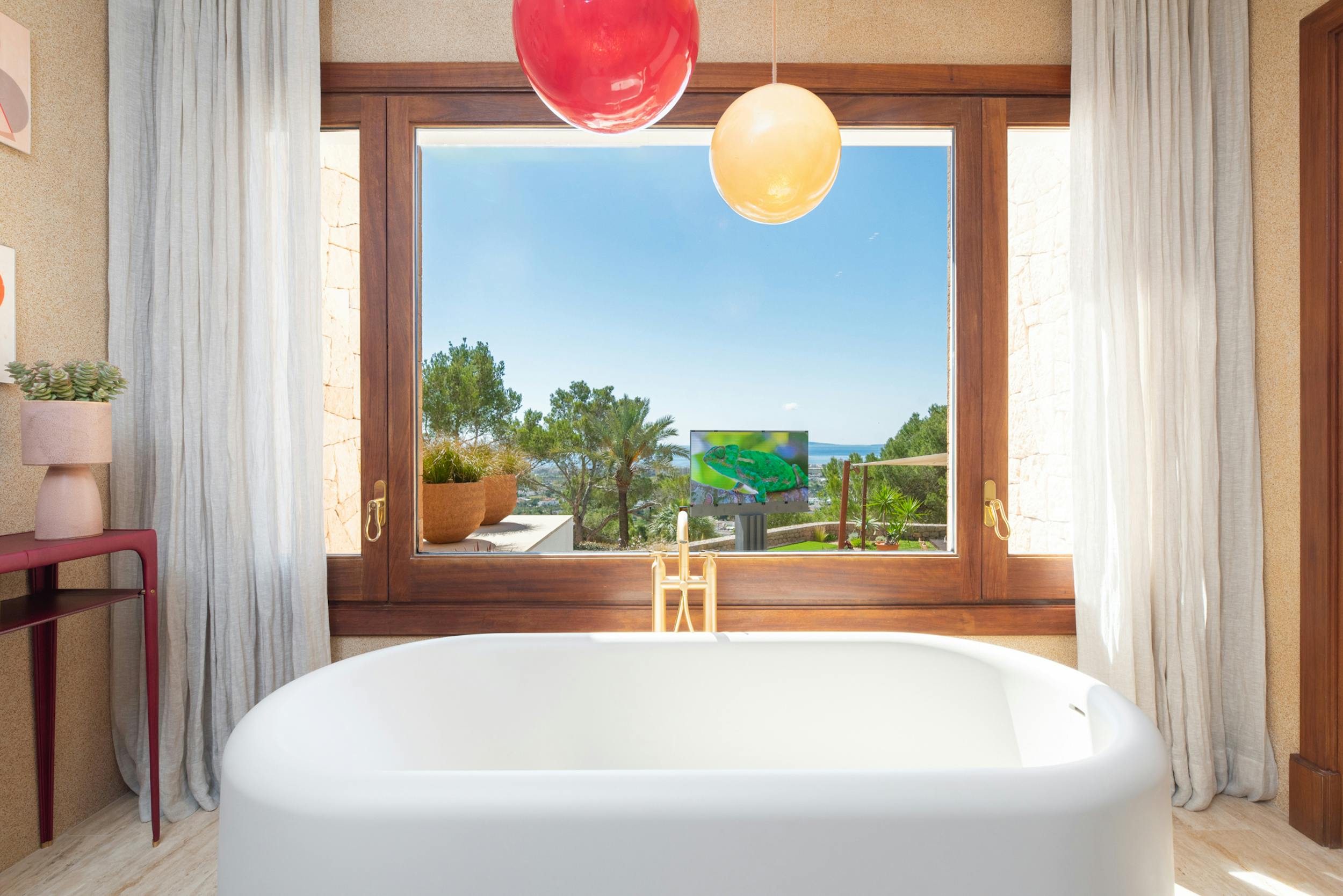 Aurora Verde elevates outdoor entertainment with a state-of-the-art retractable giant screen, perfect for enjoying sporting events or alfresco movie nights. The unique 144″ CSEED Entertainment system rotates 180°, allowing guests to enjoy it from various vantage points, including the outdoor sofas, the pool, or even the standalone bathtub in the Master ensuite.