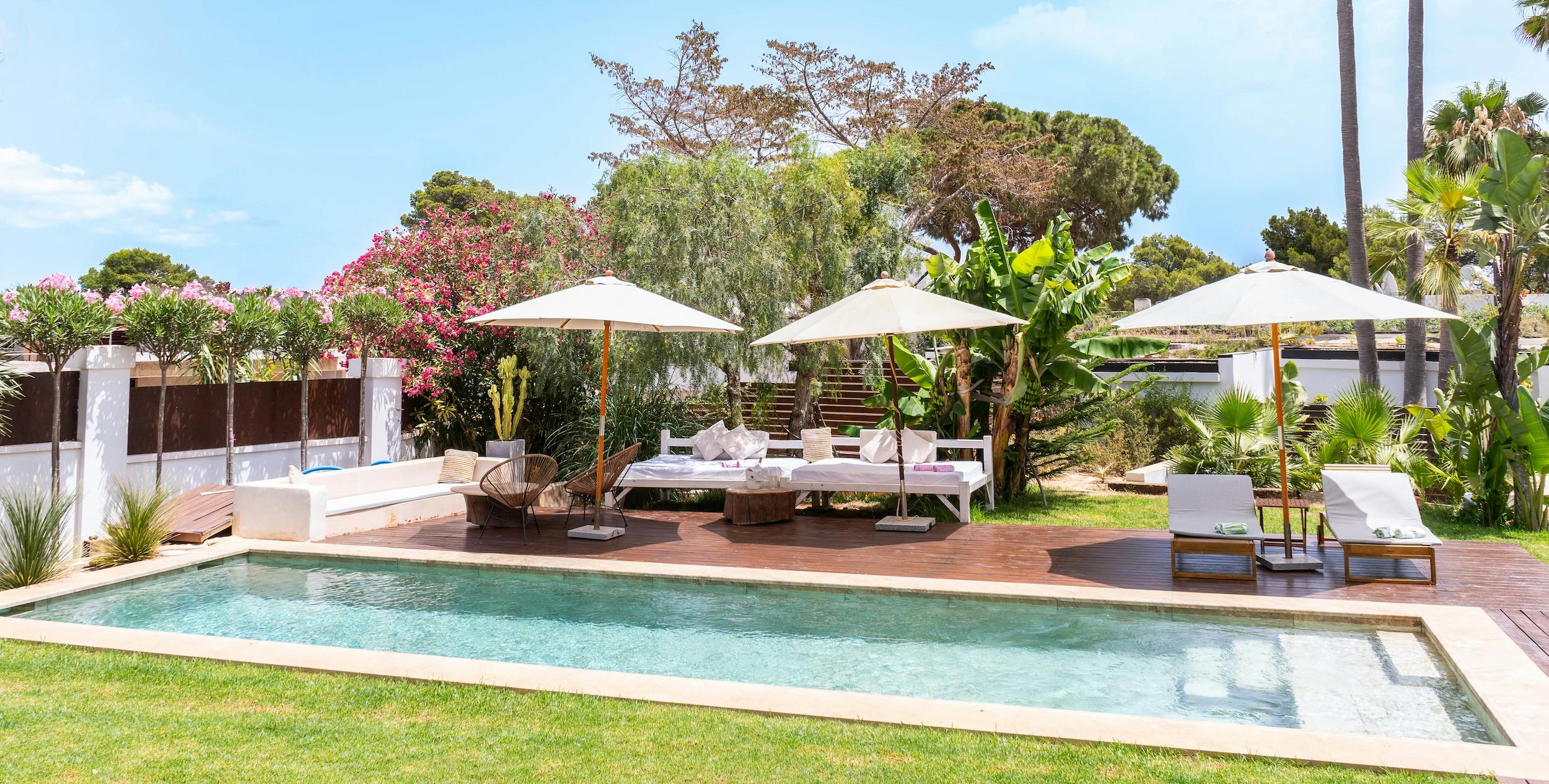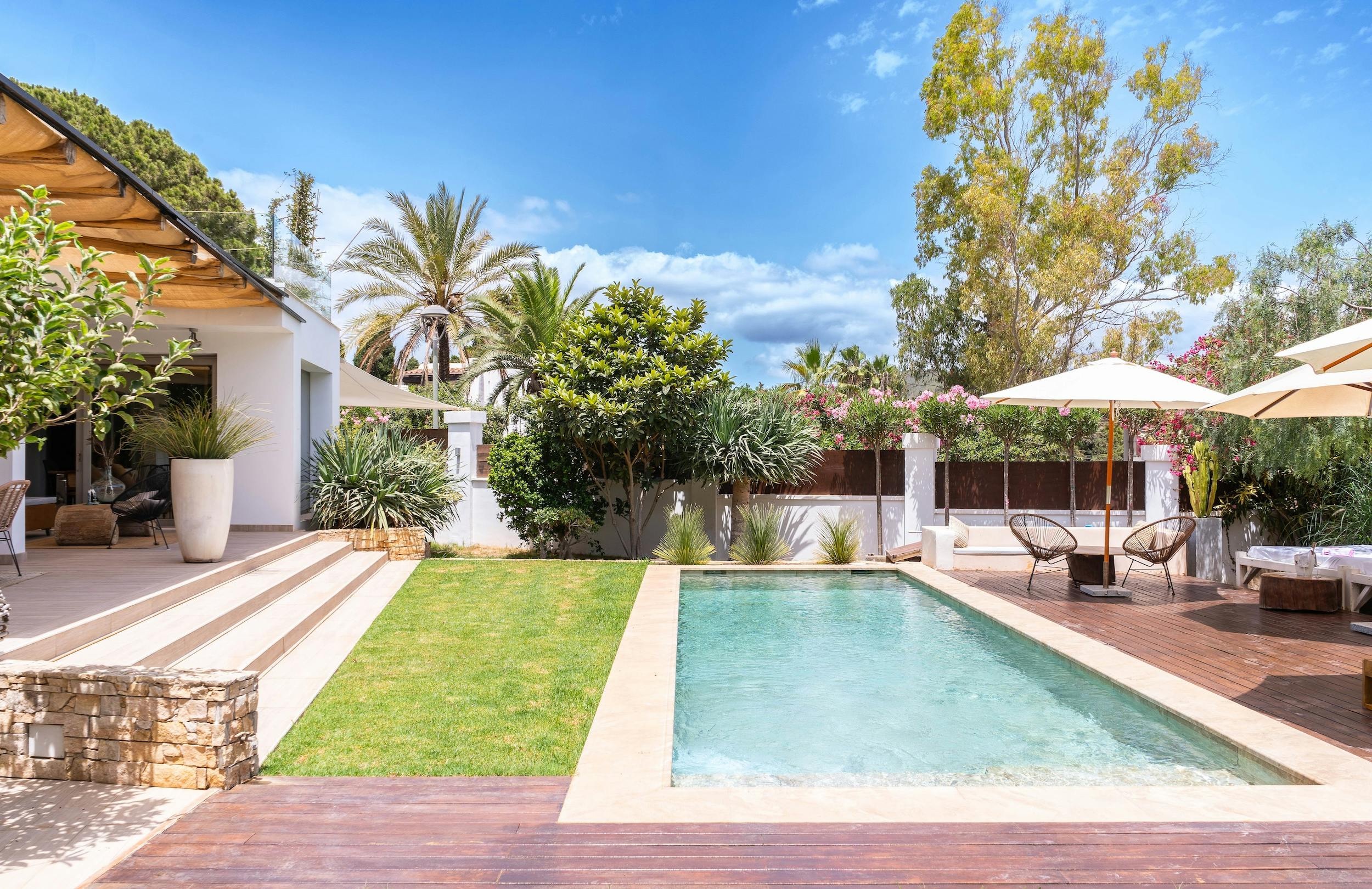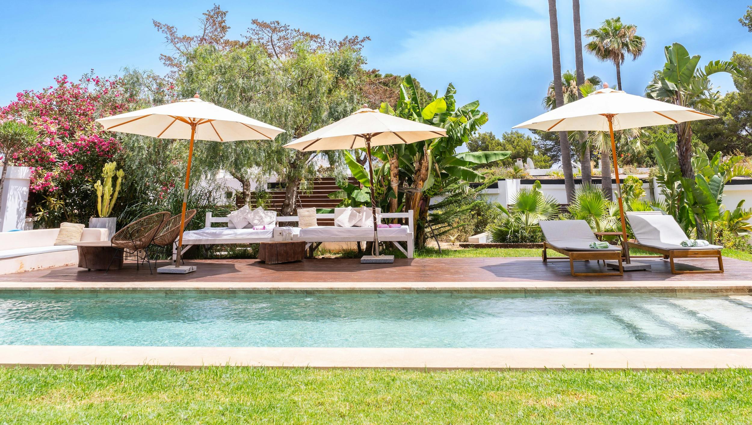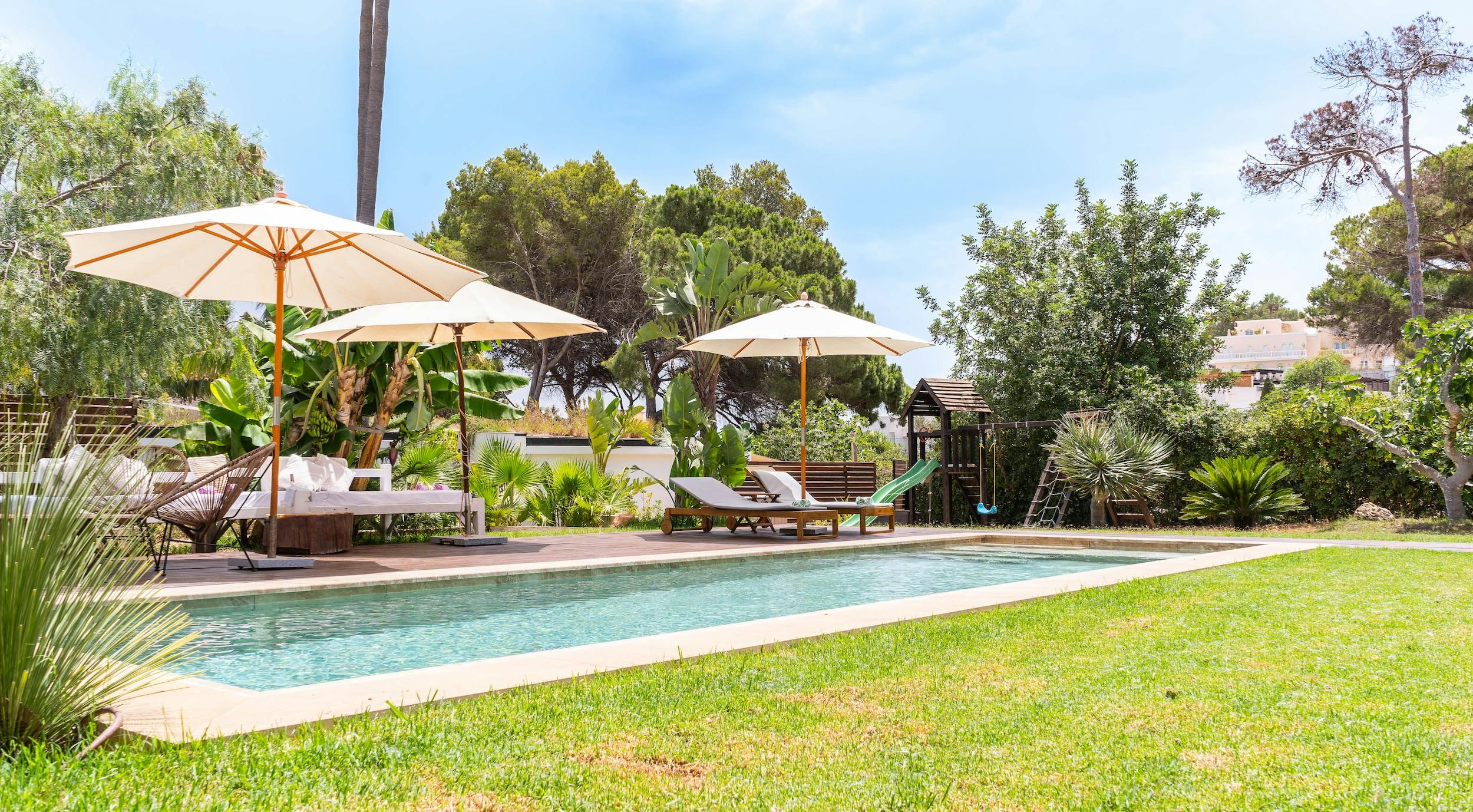The villa’s amenities cater to all your practical needs, boasting a washing machine and a fully equipped kitchen ready to handle everything from simple breakfasts to gourmet dinners. Step outside, and you’ll discover a private pool surrounded by a sun-drenched lawn, perfect for relaxation and fun.