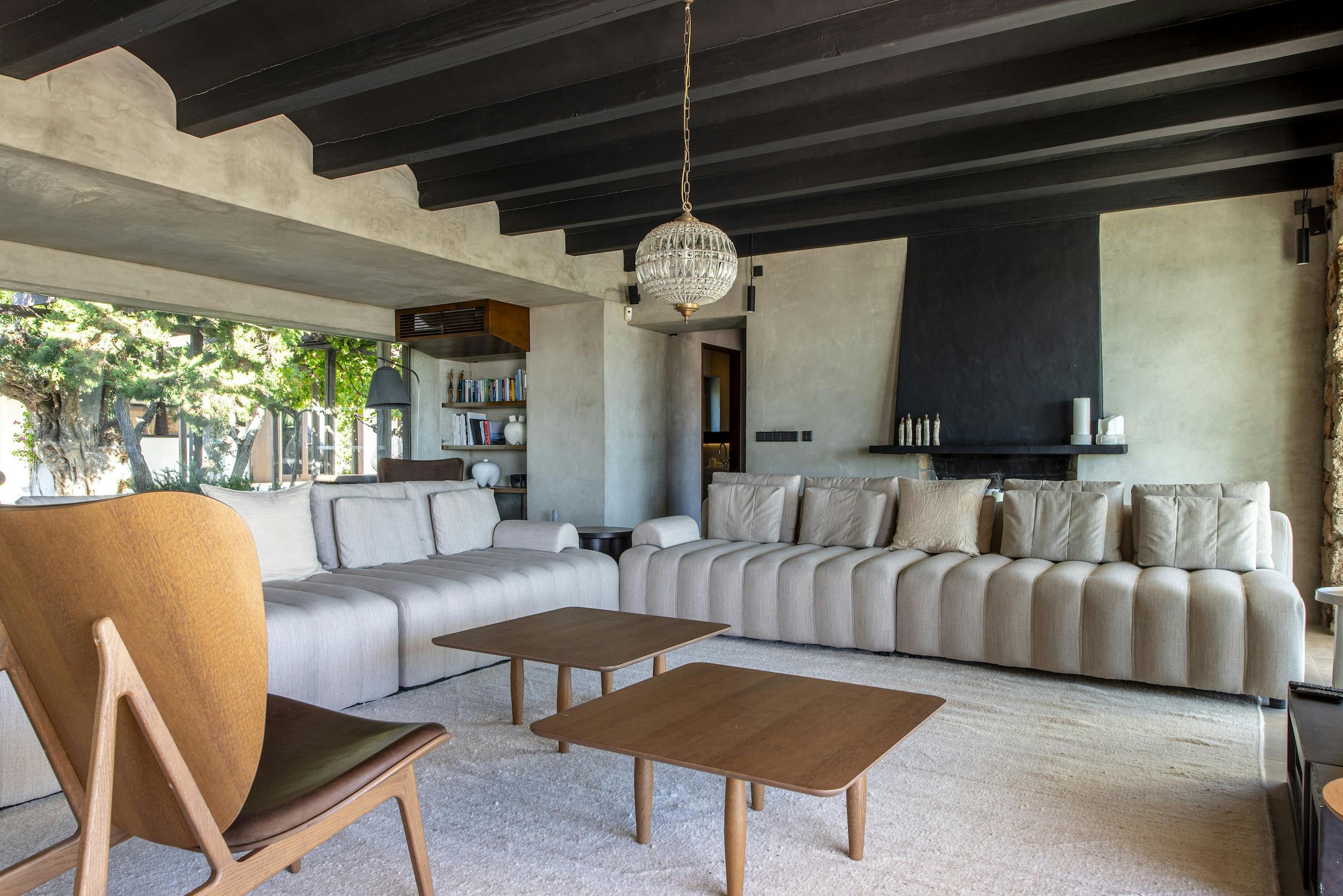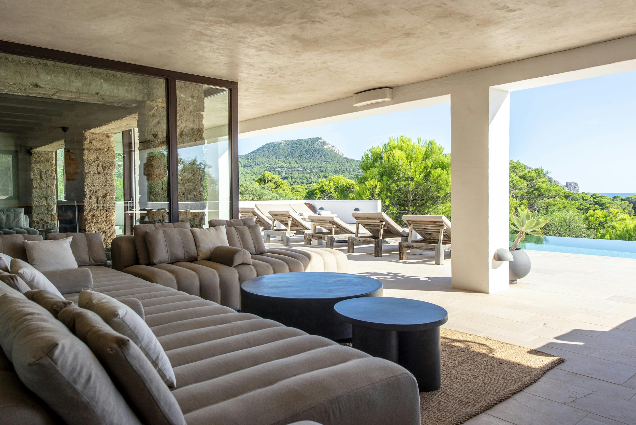 The vast living room has magnificent sliding doors that open up onto the pool, terraces and the sea views.