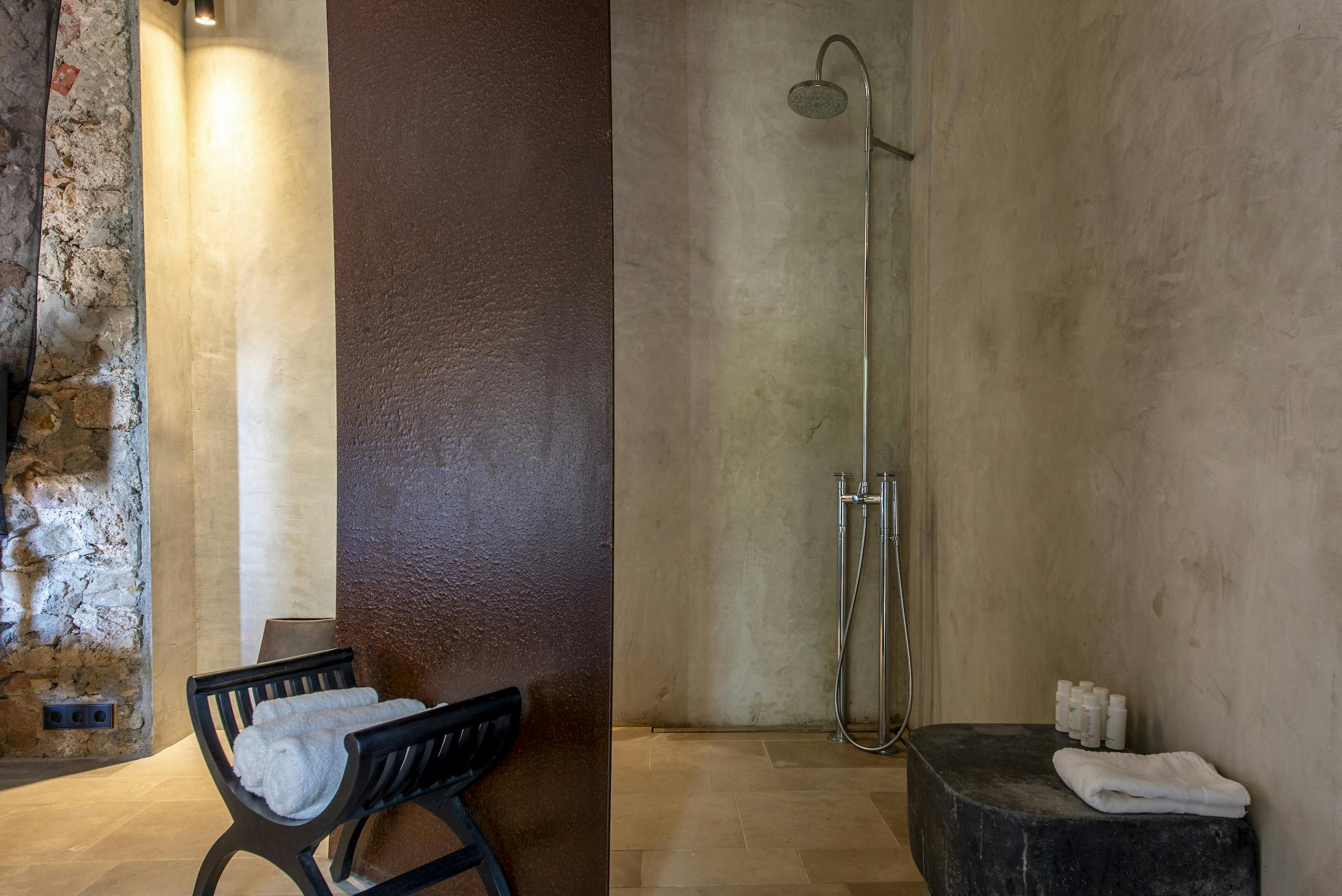 The villa has 2 double bedrooms with en-suite bathrooms in the main house, both with incredible sea views, air conditioning and underfloor heating. On the top floor sits a large double bedroom with en-suite bathroom, large terrace and of course breathtaking sea views.