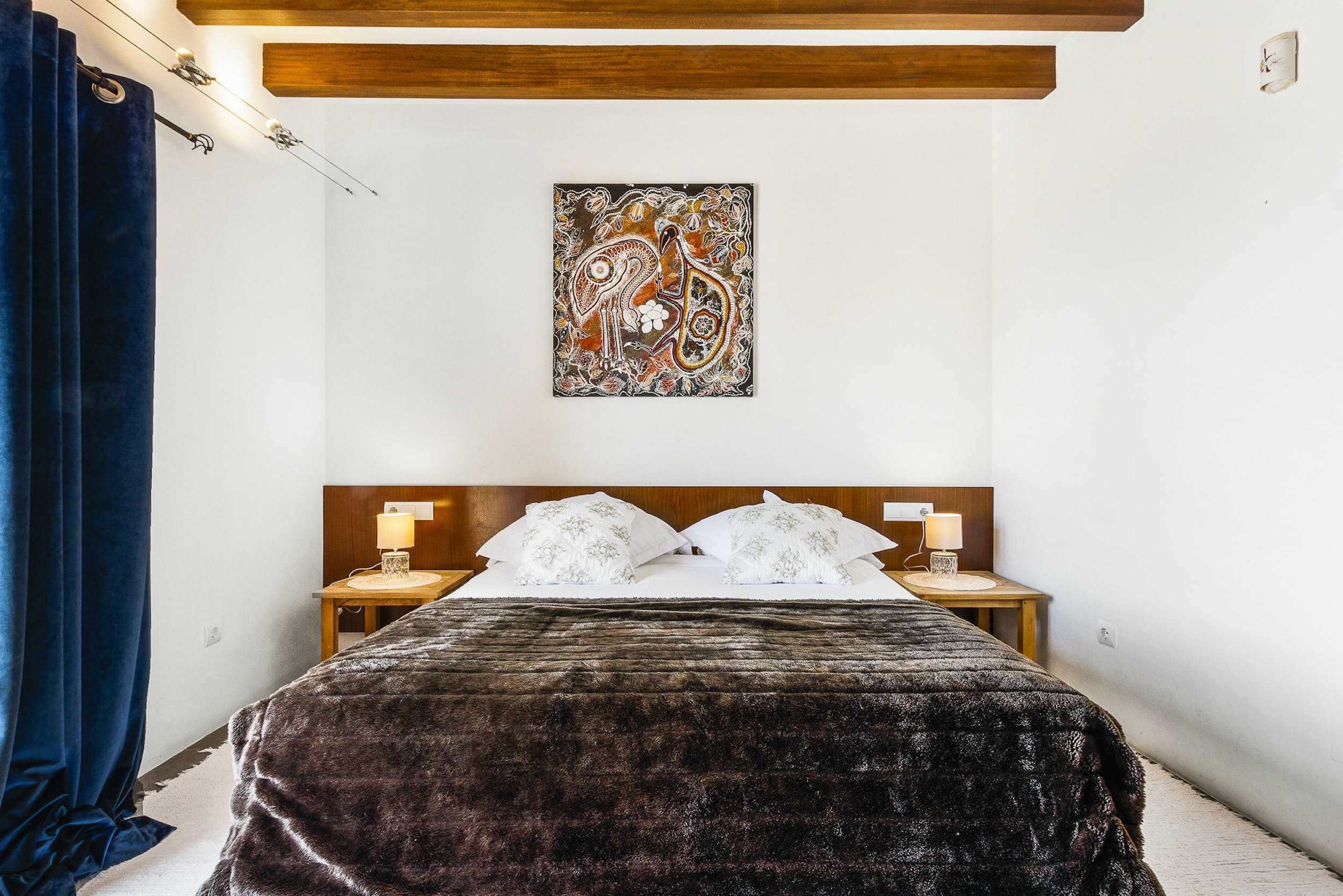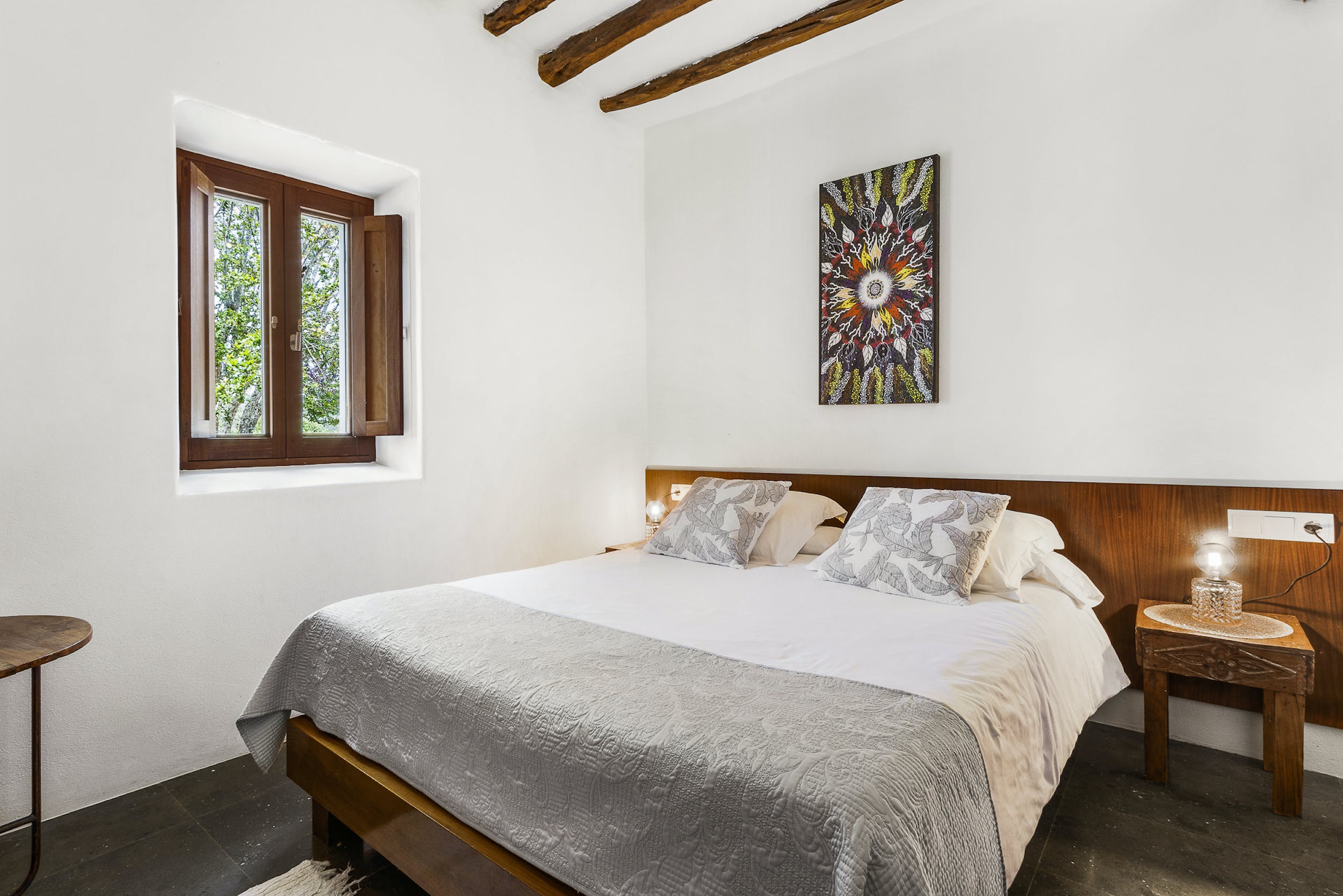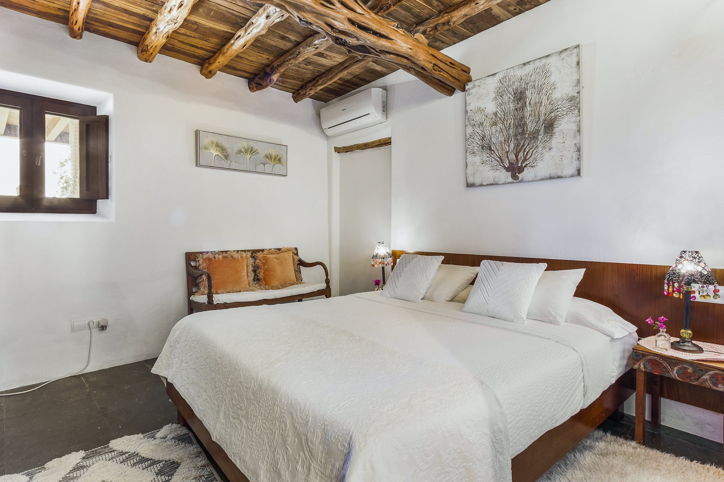 This 20 m2 double room is located in the main house and has a nice decoration, original Sabina beams on the ceiling and a nice relaxing atmosphere. It includes a comfortable double bed (160 x 200cm), a bathroom with shower, air conditioning, TV and WIFI.