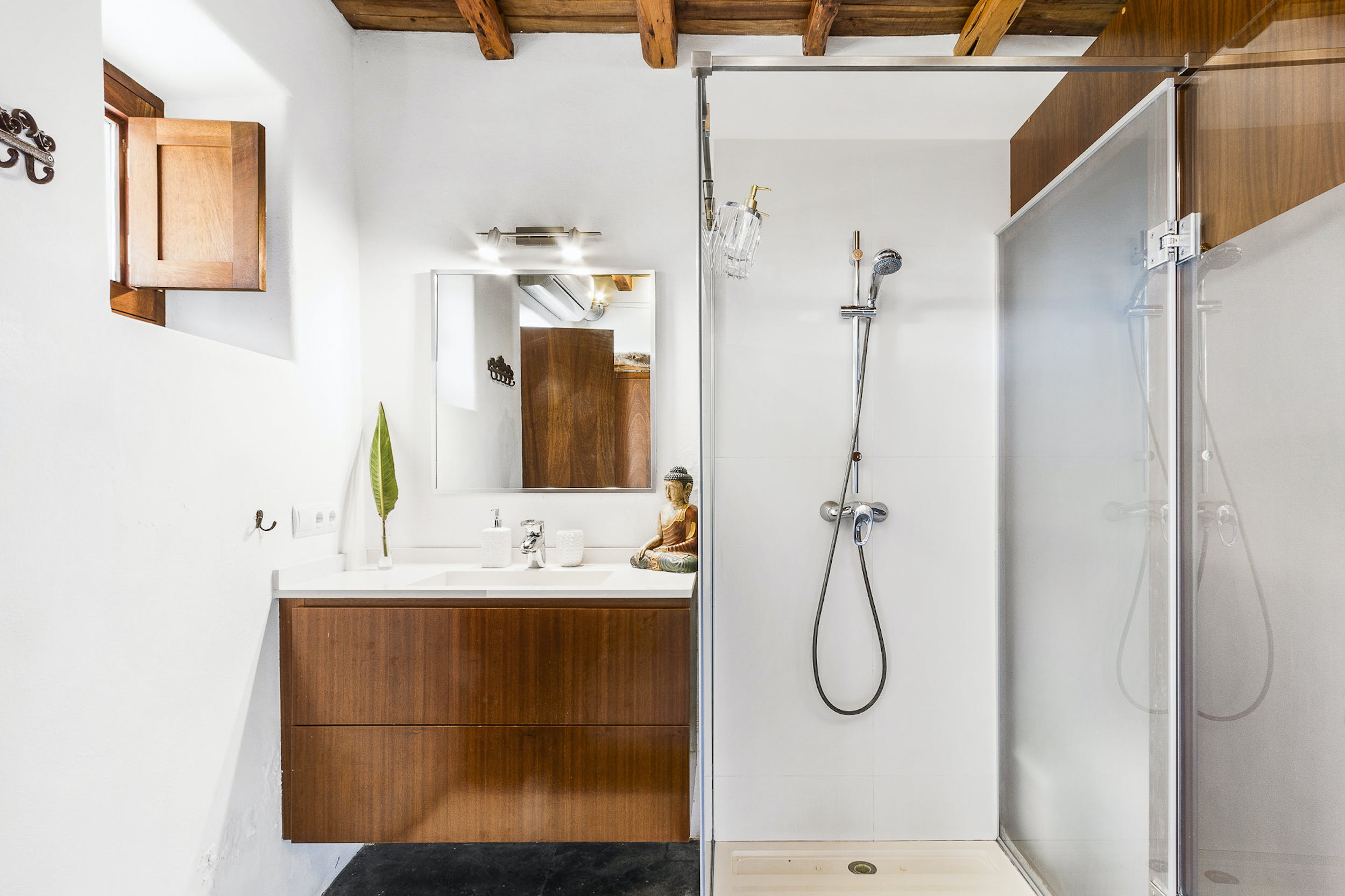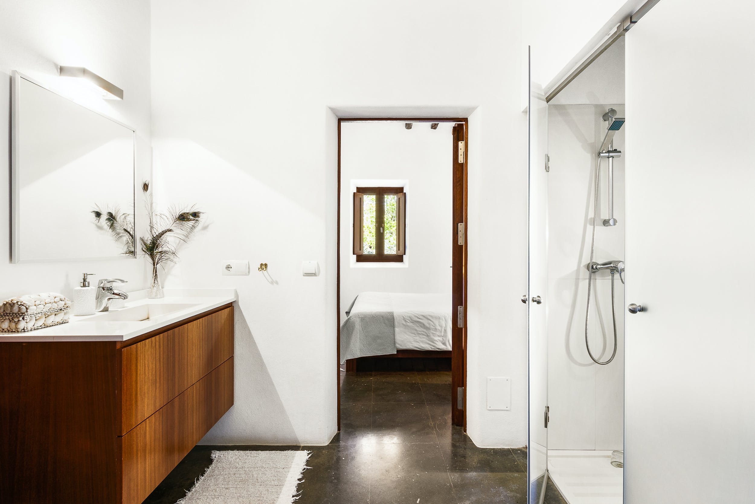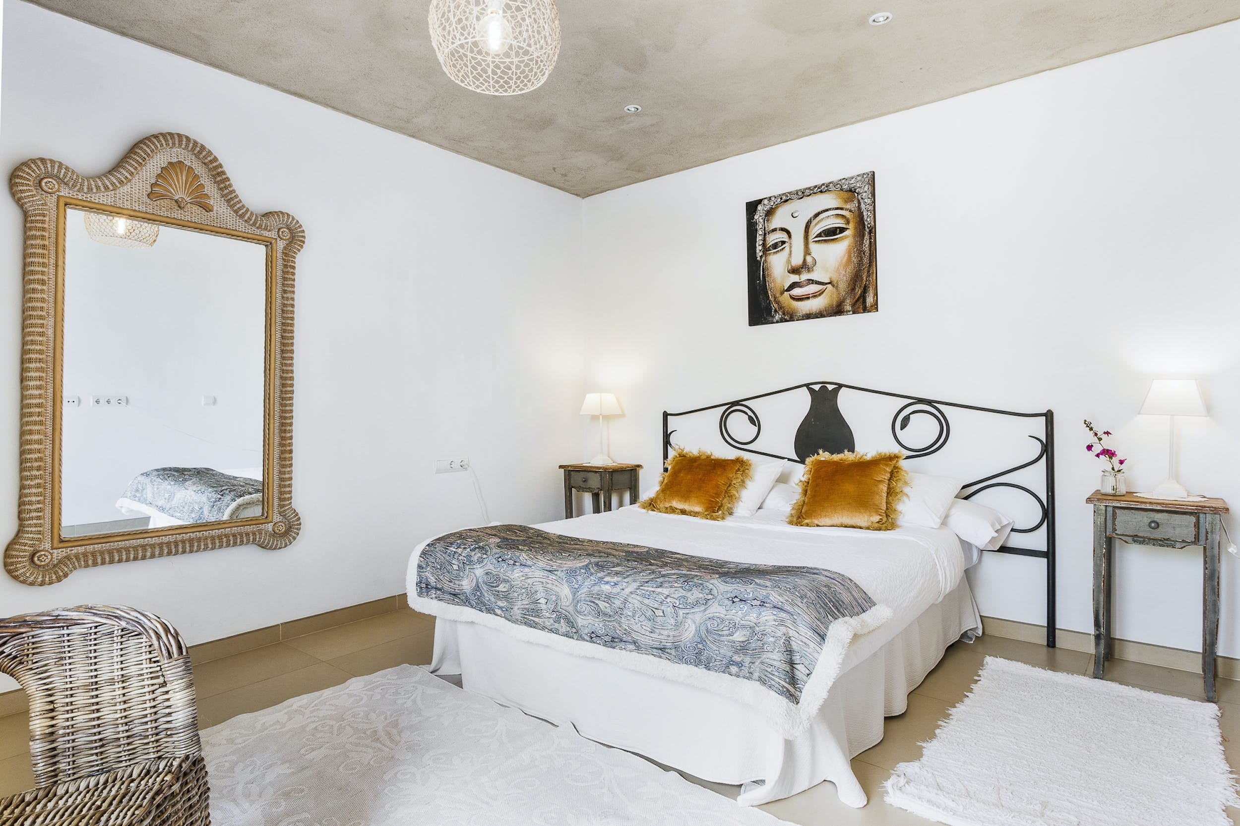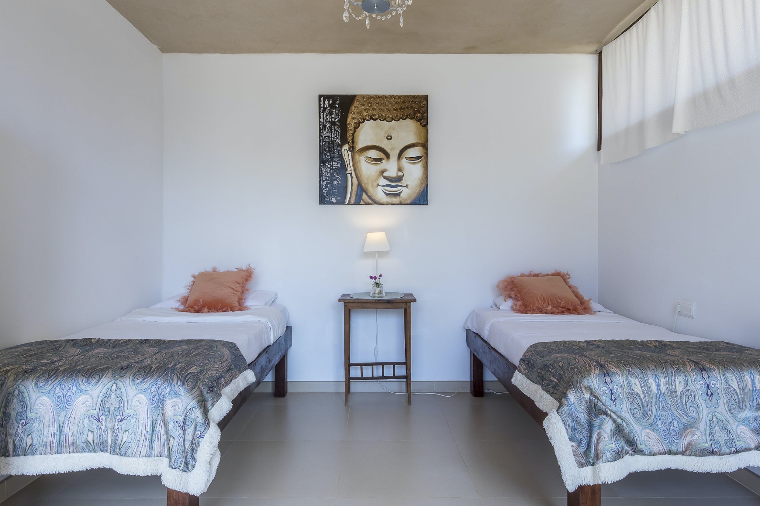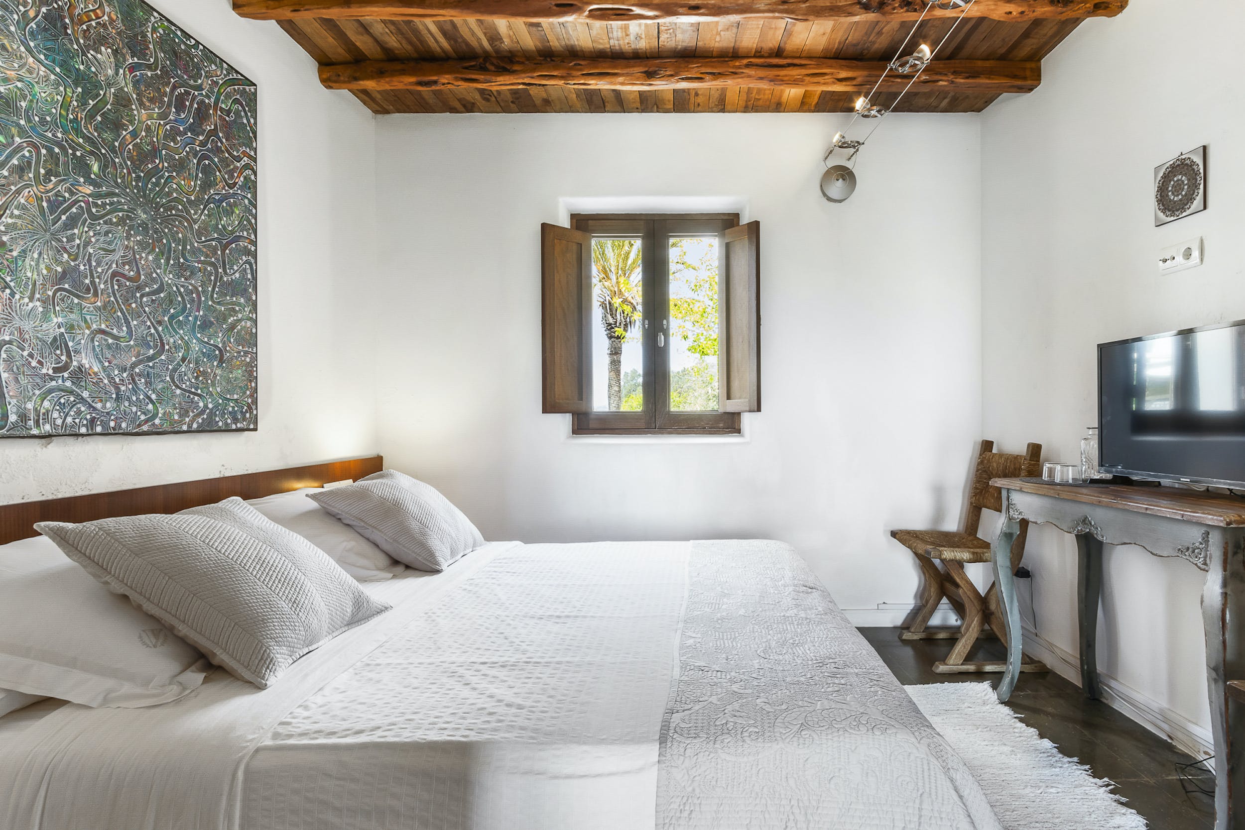 The only room on the rooftop of the main house, with breathtaking sea views all the way to Formentera, this room enjoys total privacy. It has a huge private terrace with sun loungers and direct access to the pool. Of 25 m2, bright and spacious, it has a comfortable double bed (160 x 200 cm) and a bathroom with shower. It also has air conditioning, TV, WIFI and minibar.