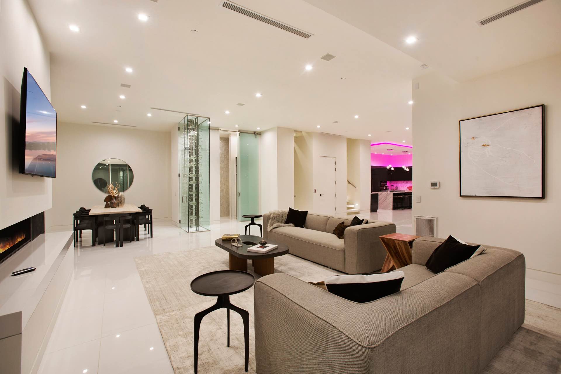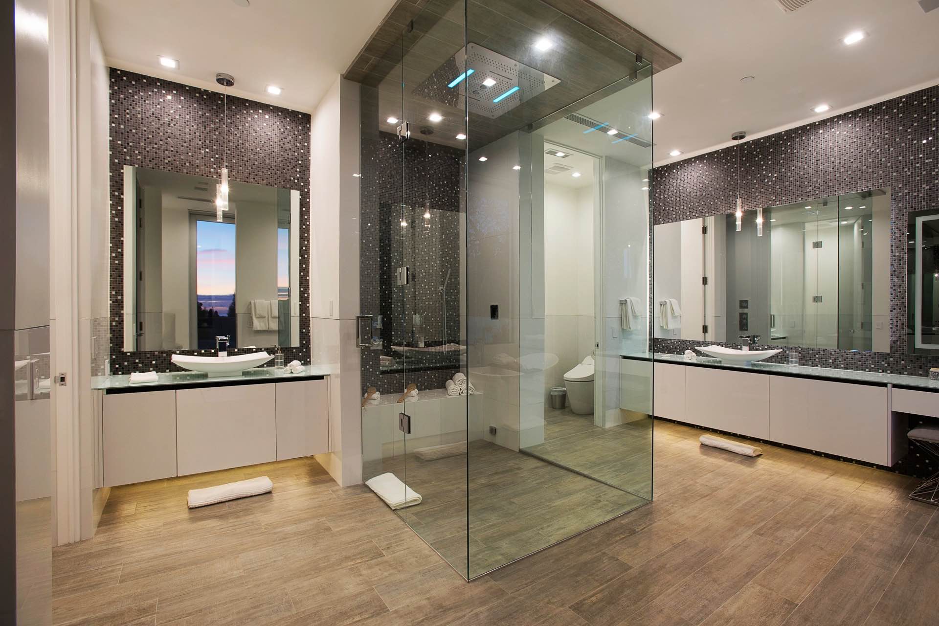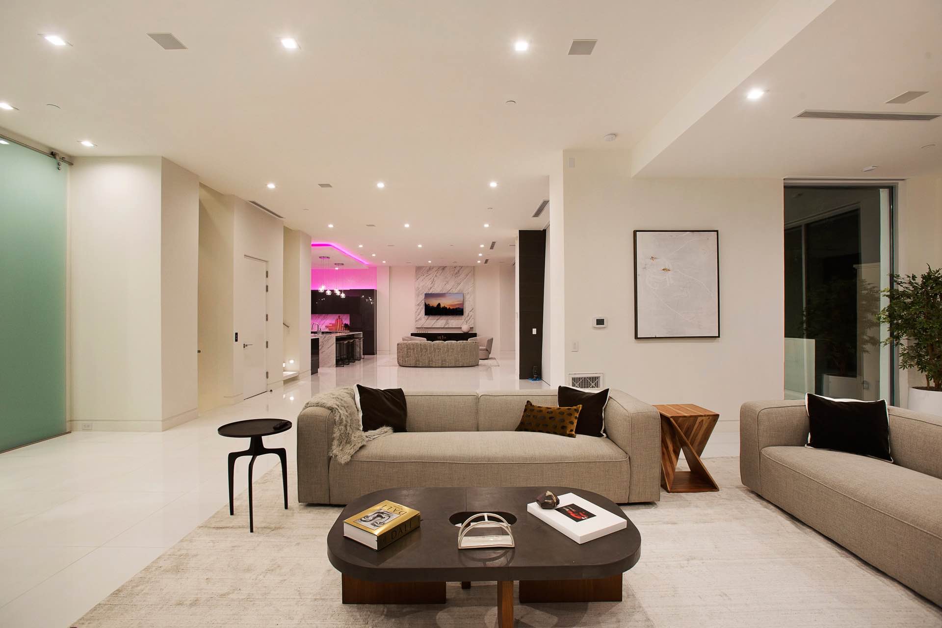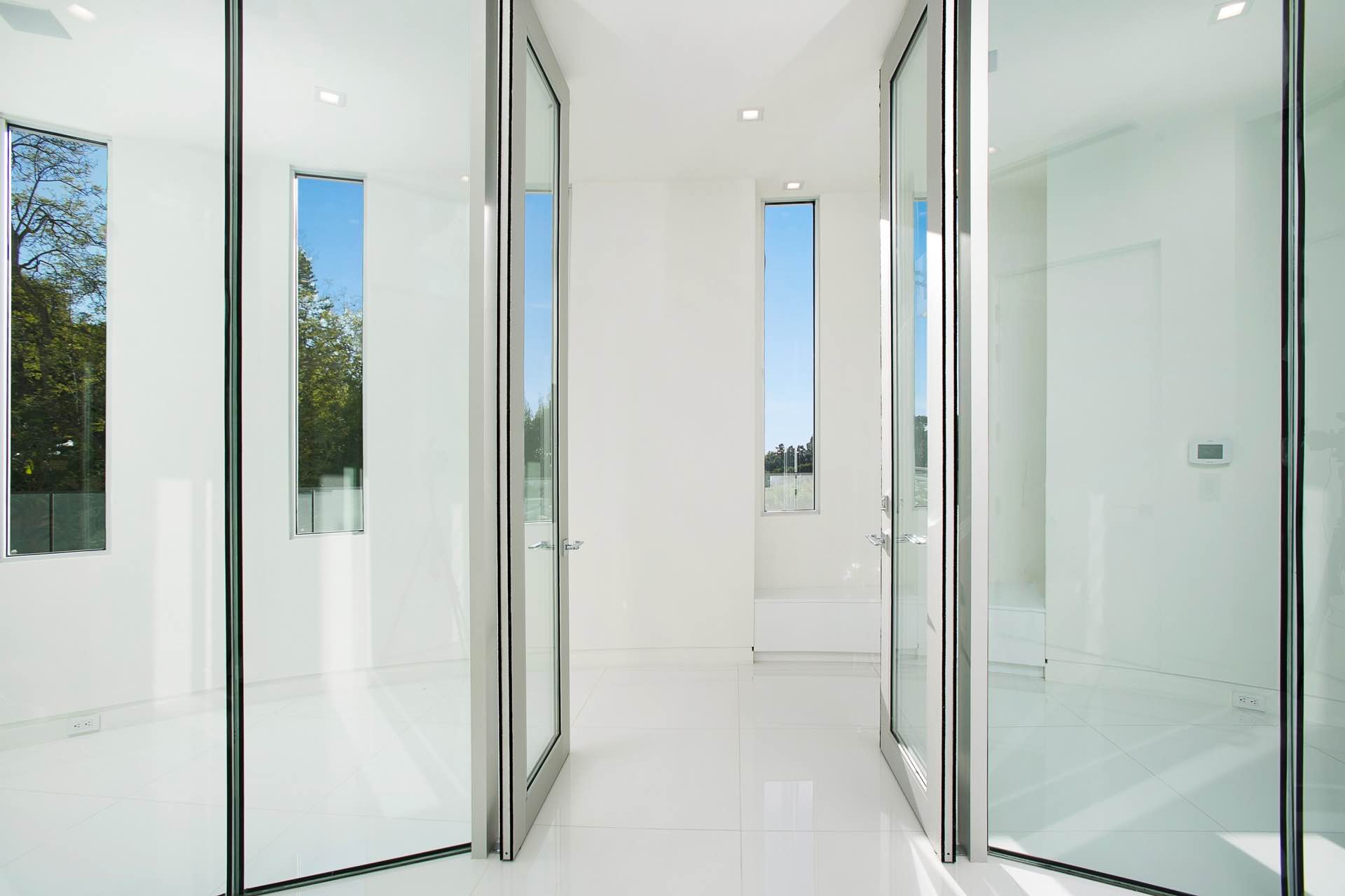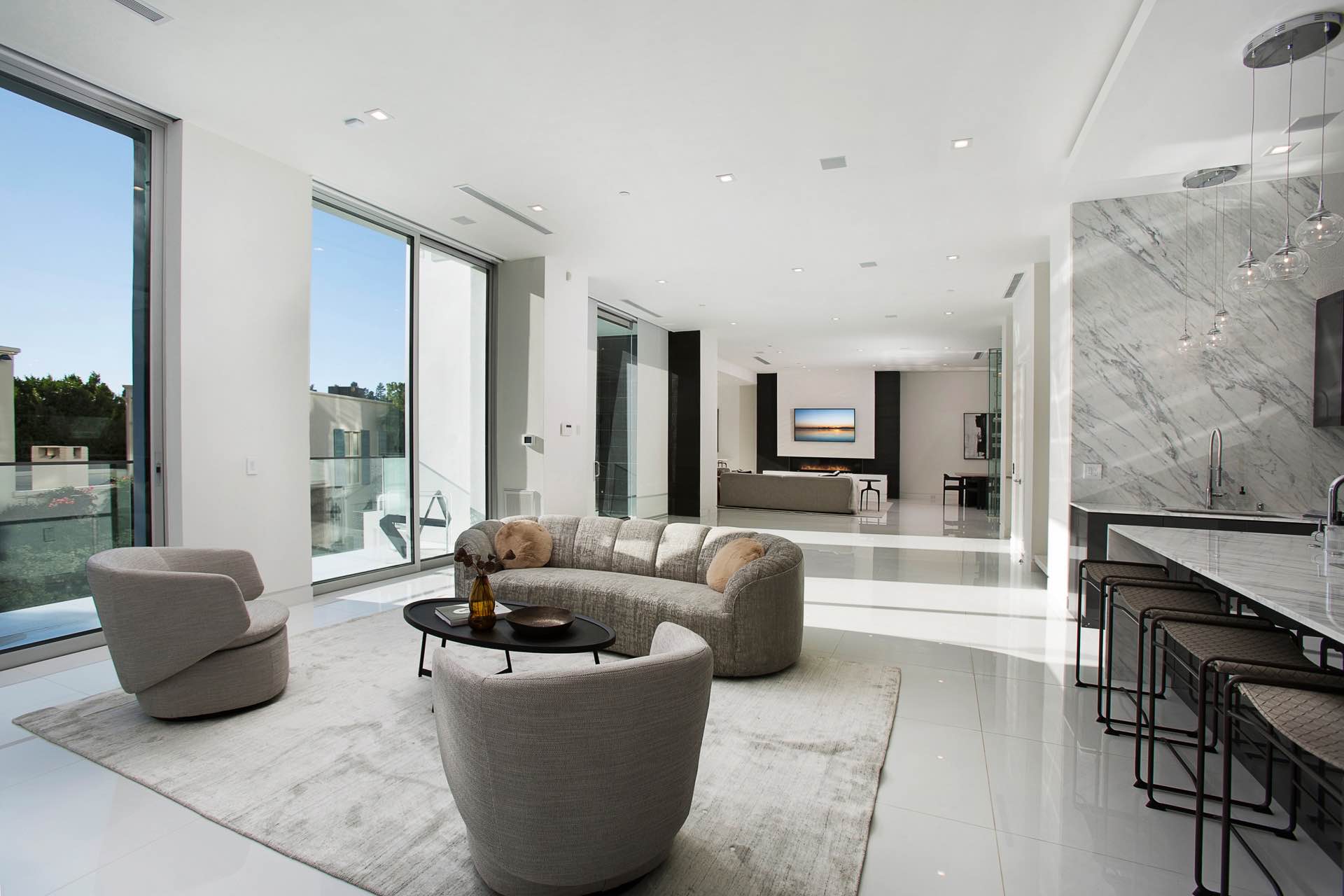 This architectural masterpiece in the heart of Beverly Hills boasts an open concept floor plan and floor-to-ceiling smart glass doors that allow a lot of natural light in and ensure you can enjoy with panoramic city lights and ocean views.