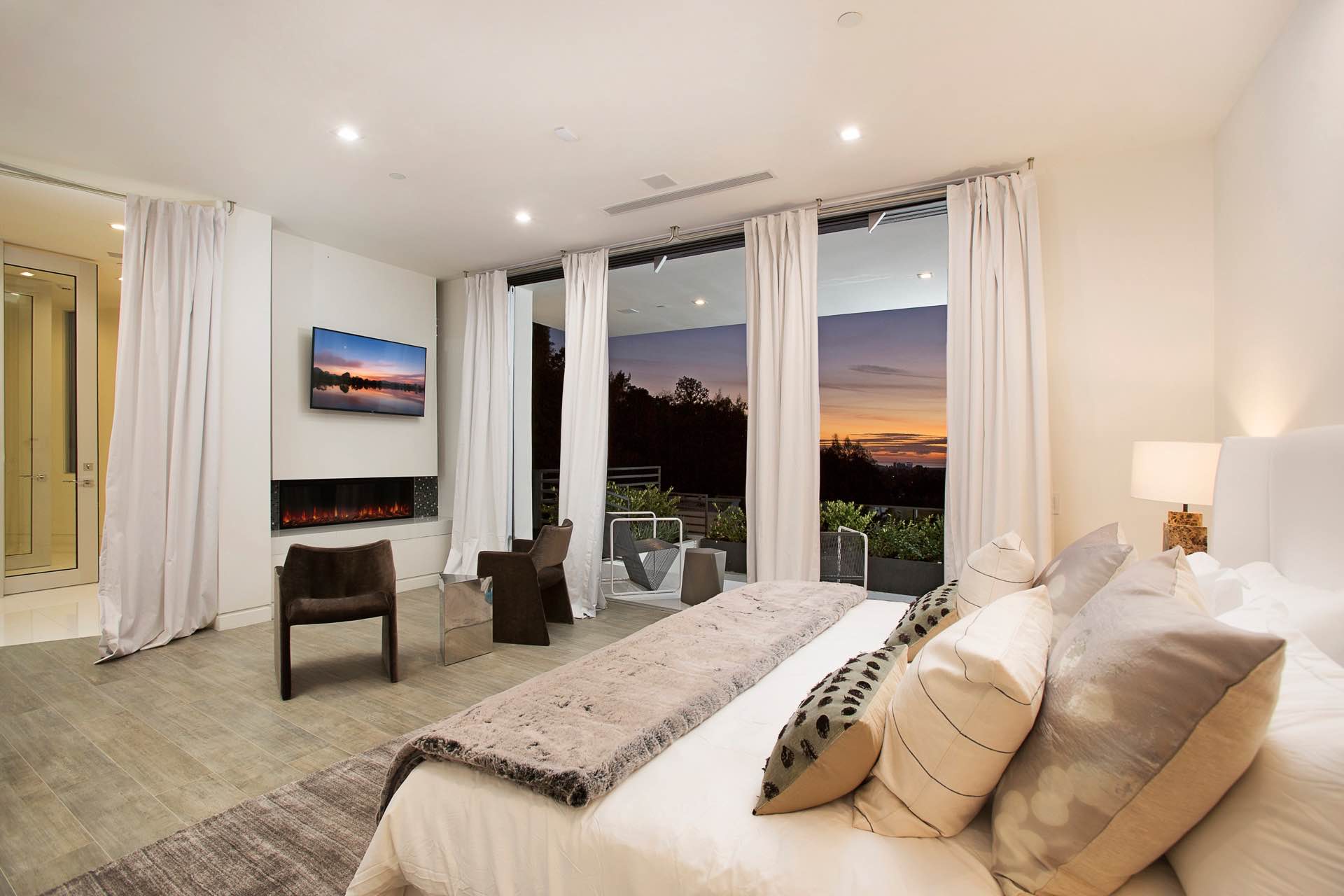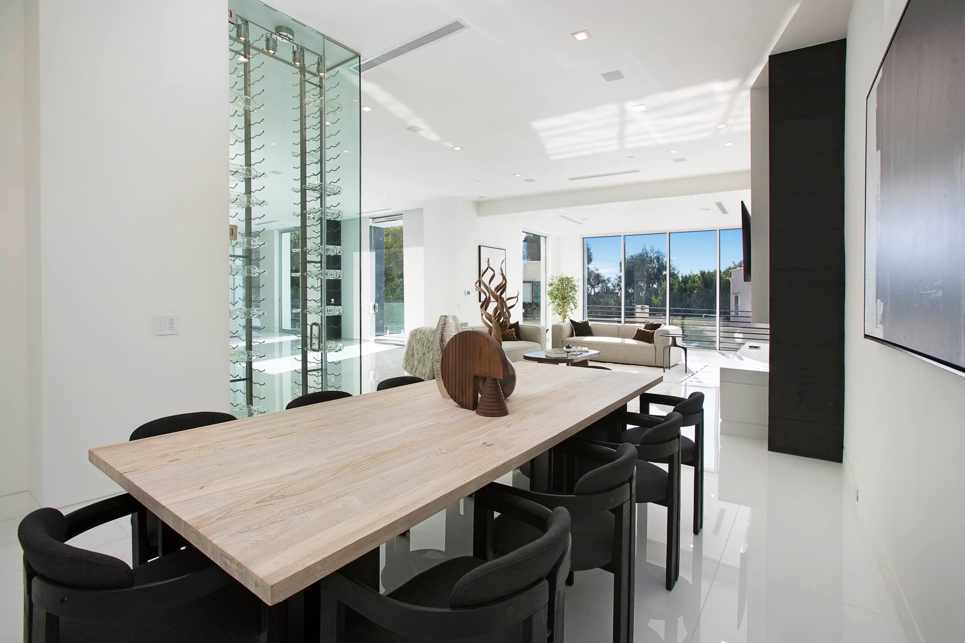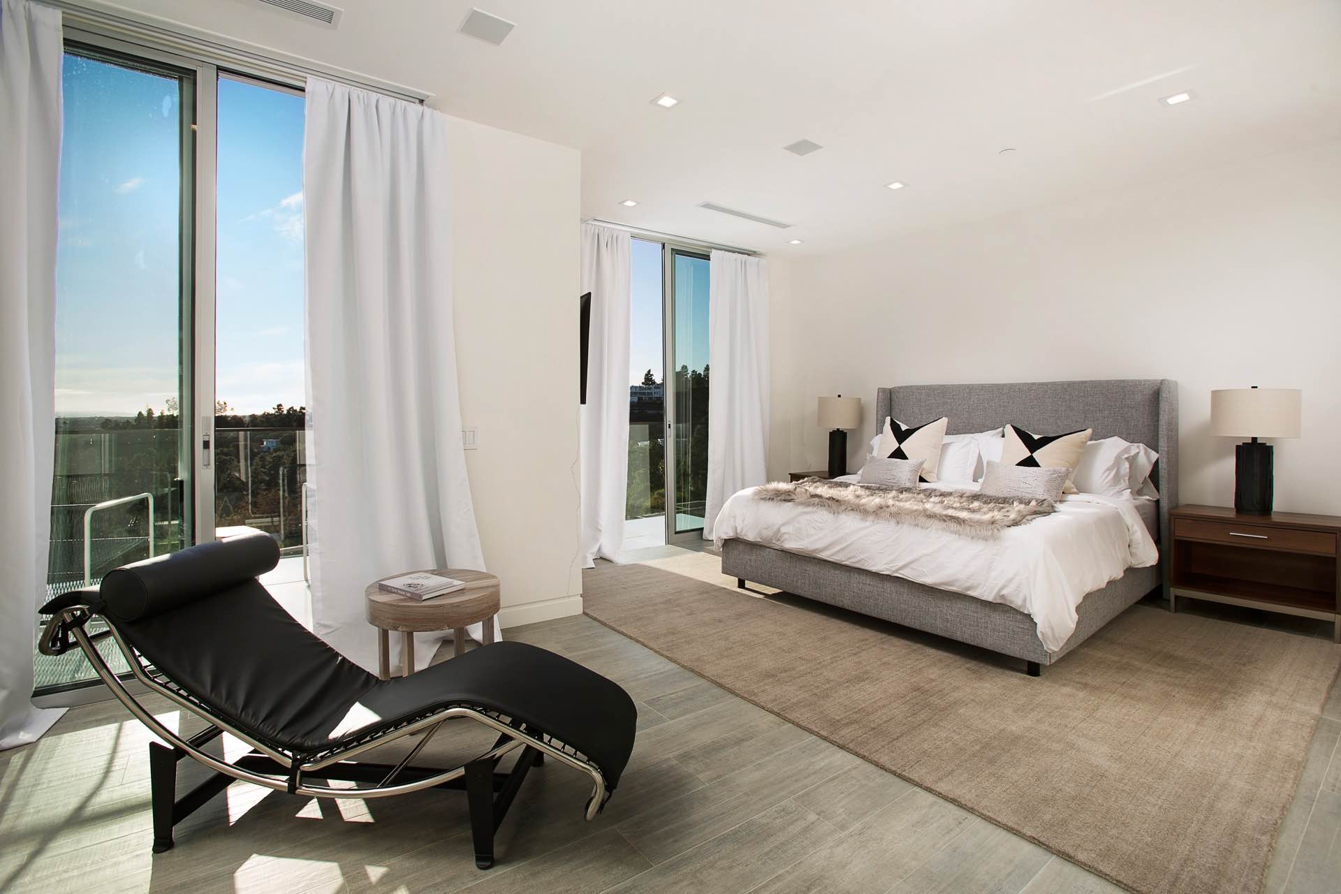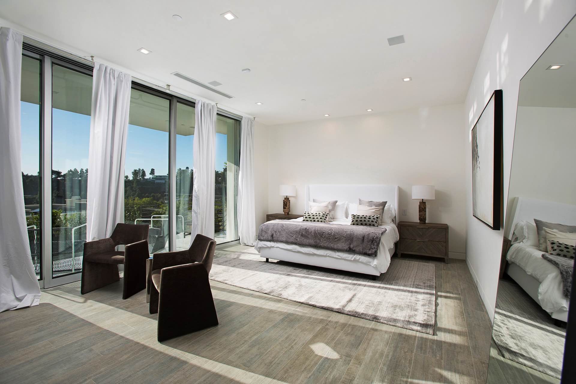 This architectural masterpiece in the heart of Beverly Hills boasts an open concept floor plan and floor-to-ceiling smart glass doors that allow a lot of natural light in and ensure you can enjoy with panoramic city lights and ocean views.