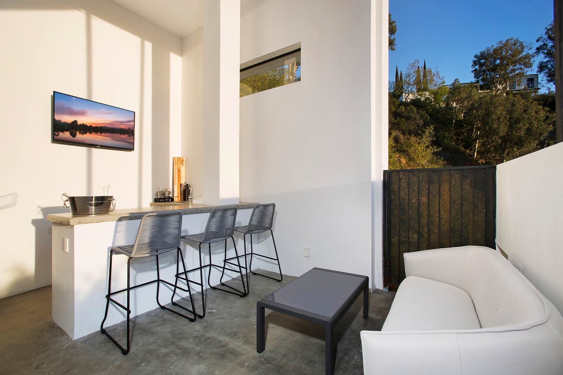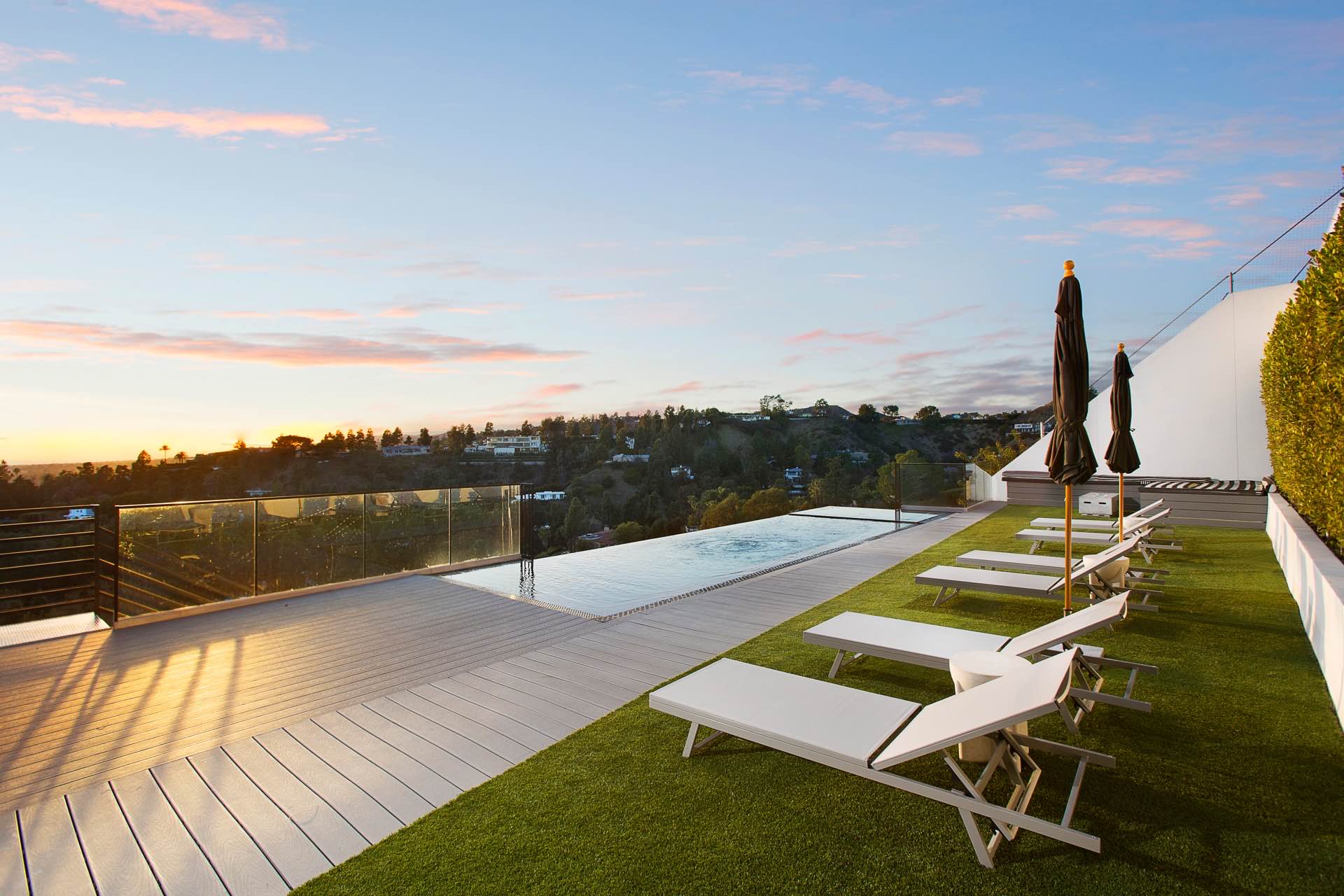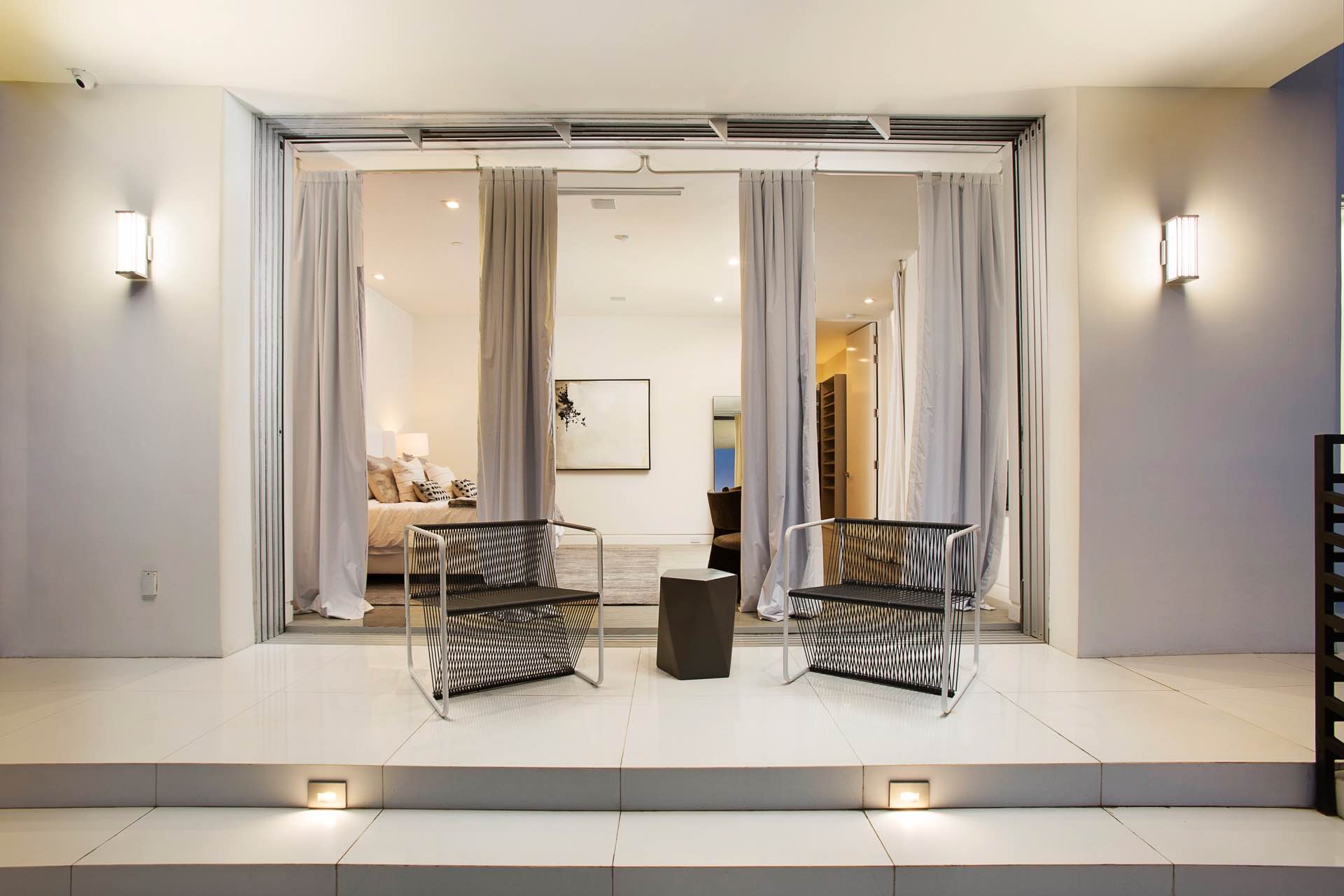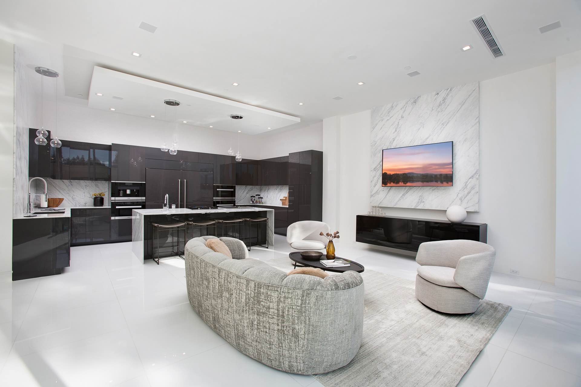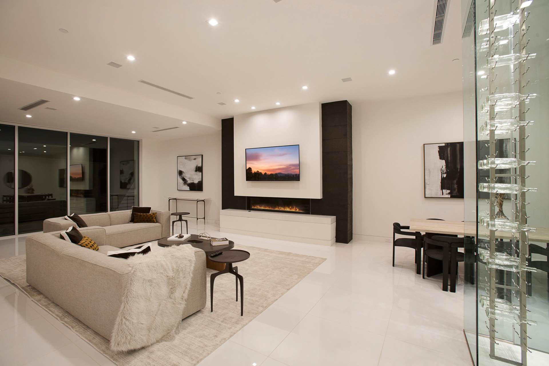 This architectural masterpiece in the heart of Beverly Hills boasts an open concept floor plan and floor-to-ceiling smart glass doors that allow a lot of natural light in and ensure you can enjoy with panoramic city lights and ocean views.