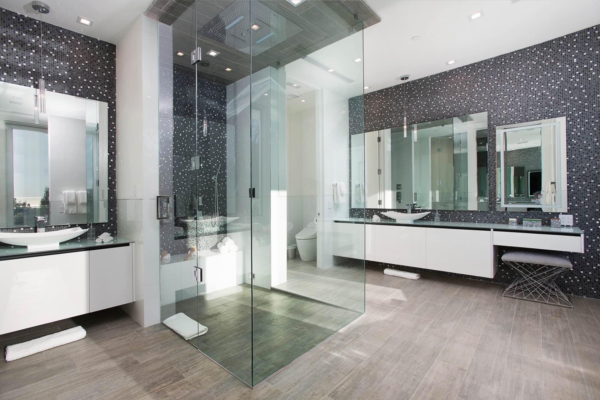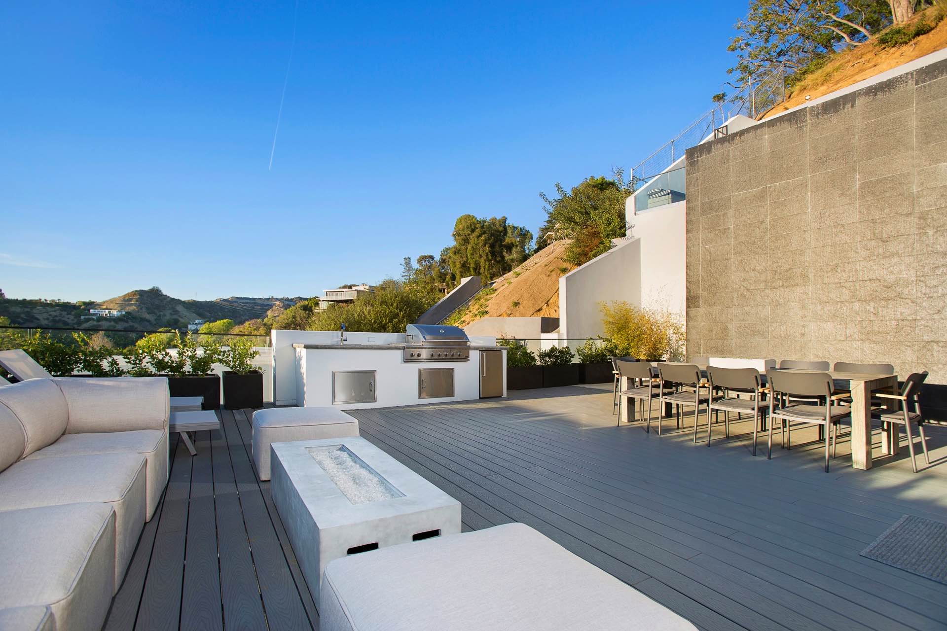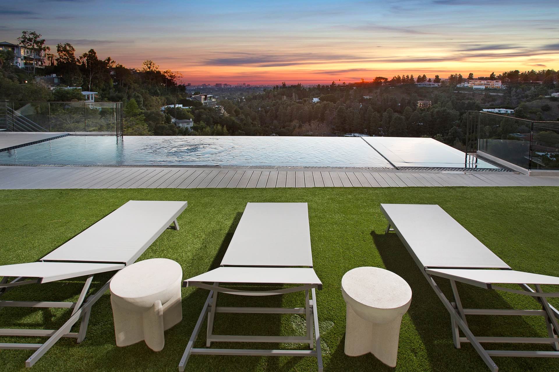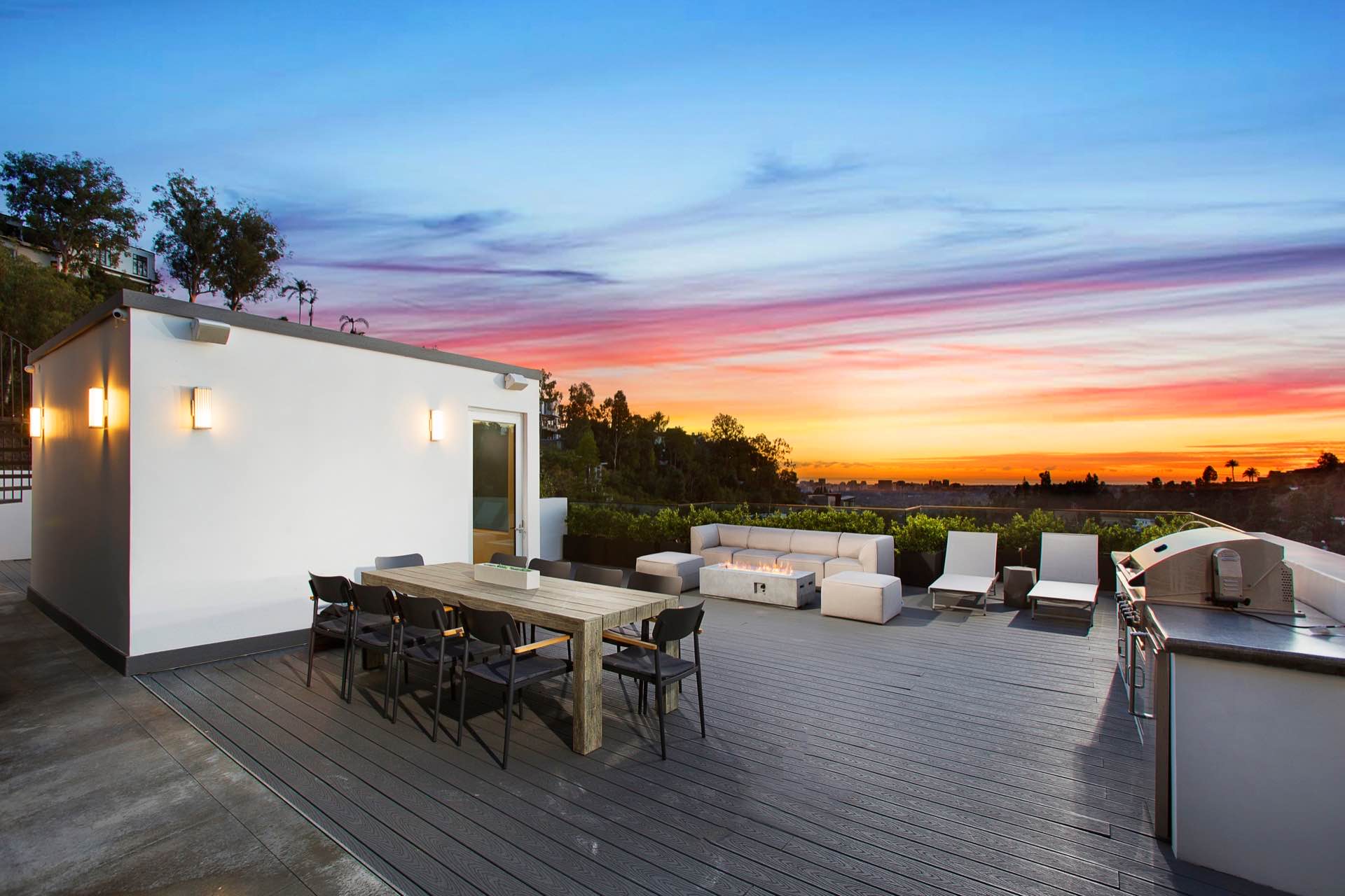 This architectural masterpiece in the heart of Beverly Hills boasts an open concept floor plan and floor-to-ceiling smart glass doors that allow a lot of natural light in and ensure you can enjoy with panoramic city lights and ocean views.
