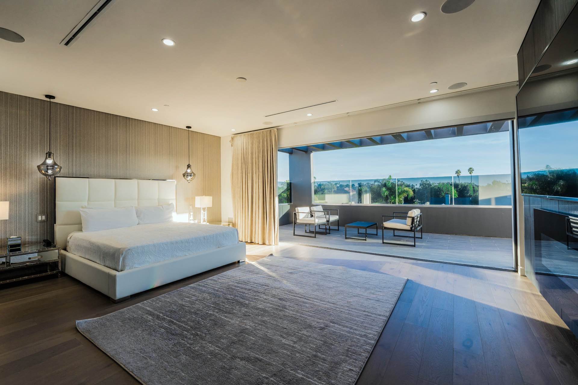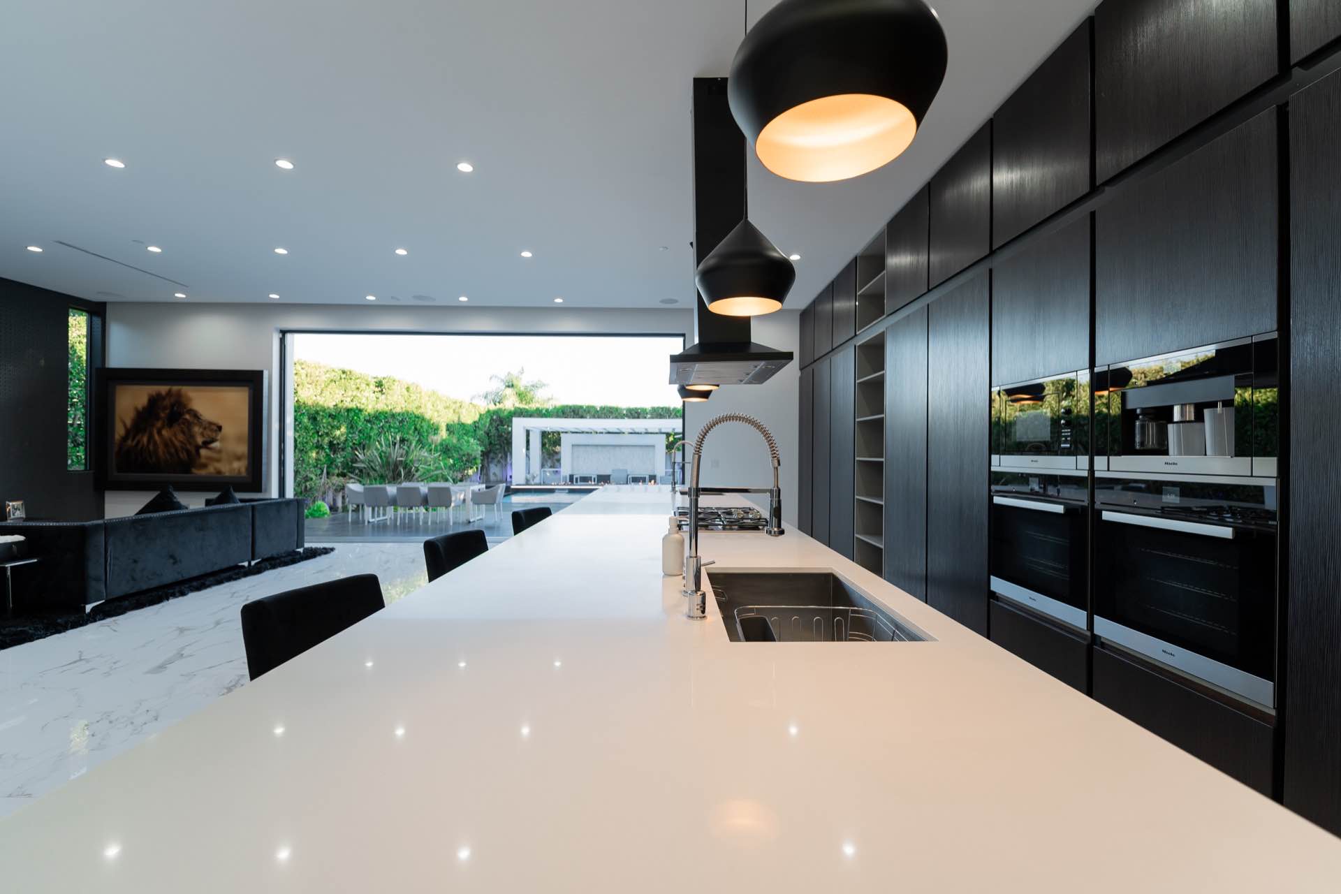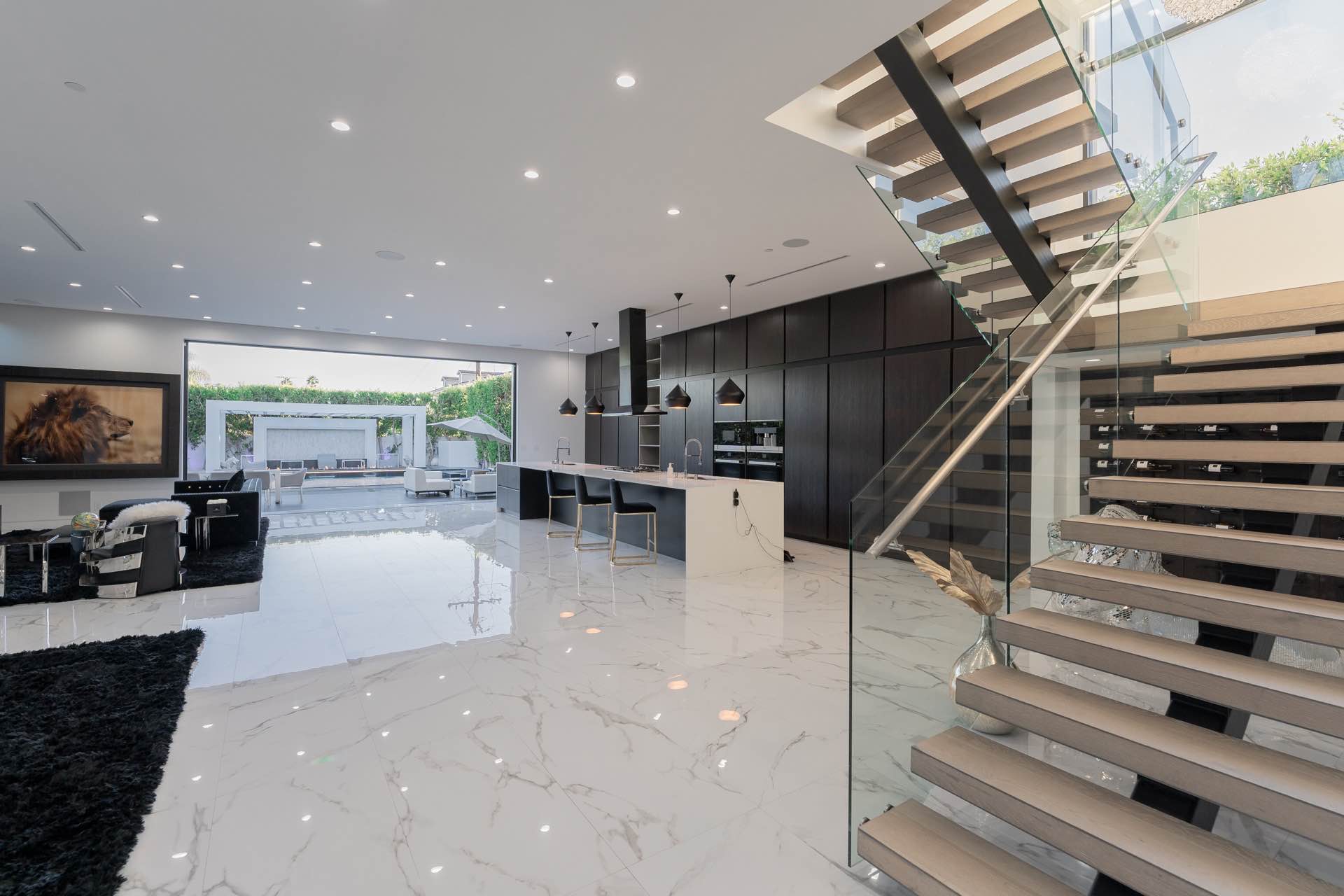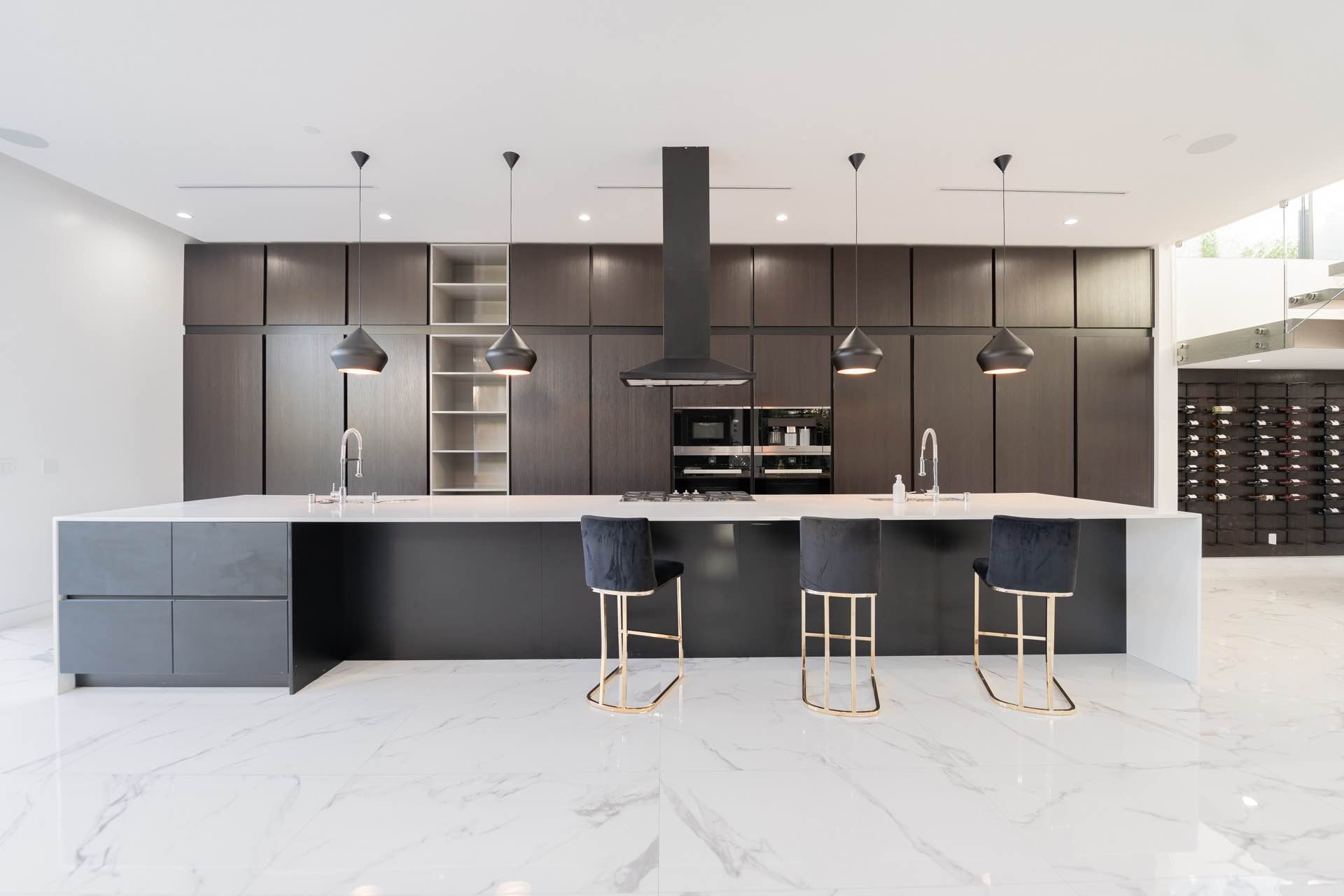 Every technological amenity is controlled by the touch of a button: in-ceiling speakers in every room, LED lighting, in-wall fireplaces, and custom automated window coverings. The open kitchen is anchored by the oversized island and boasts top-of-the-line Miele appliances.