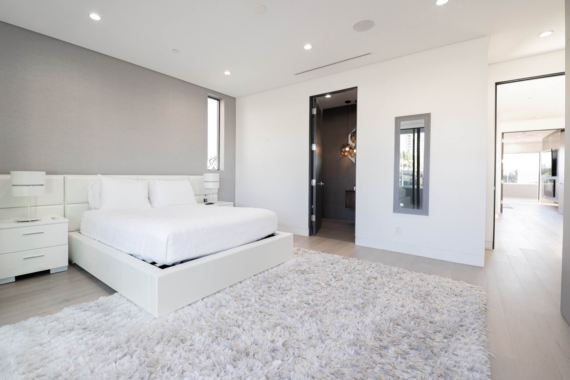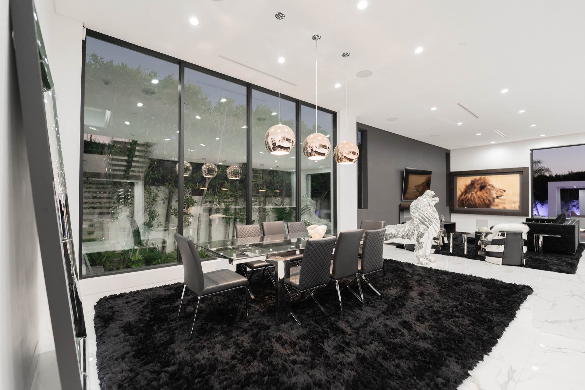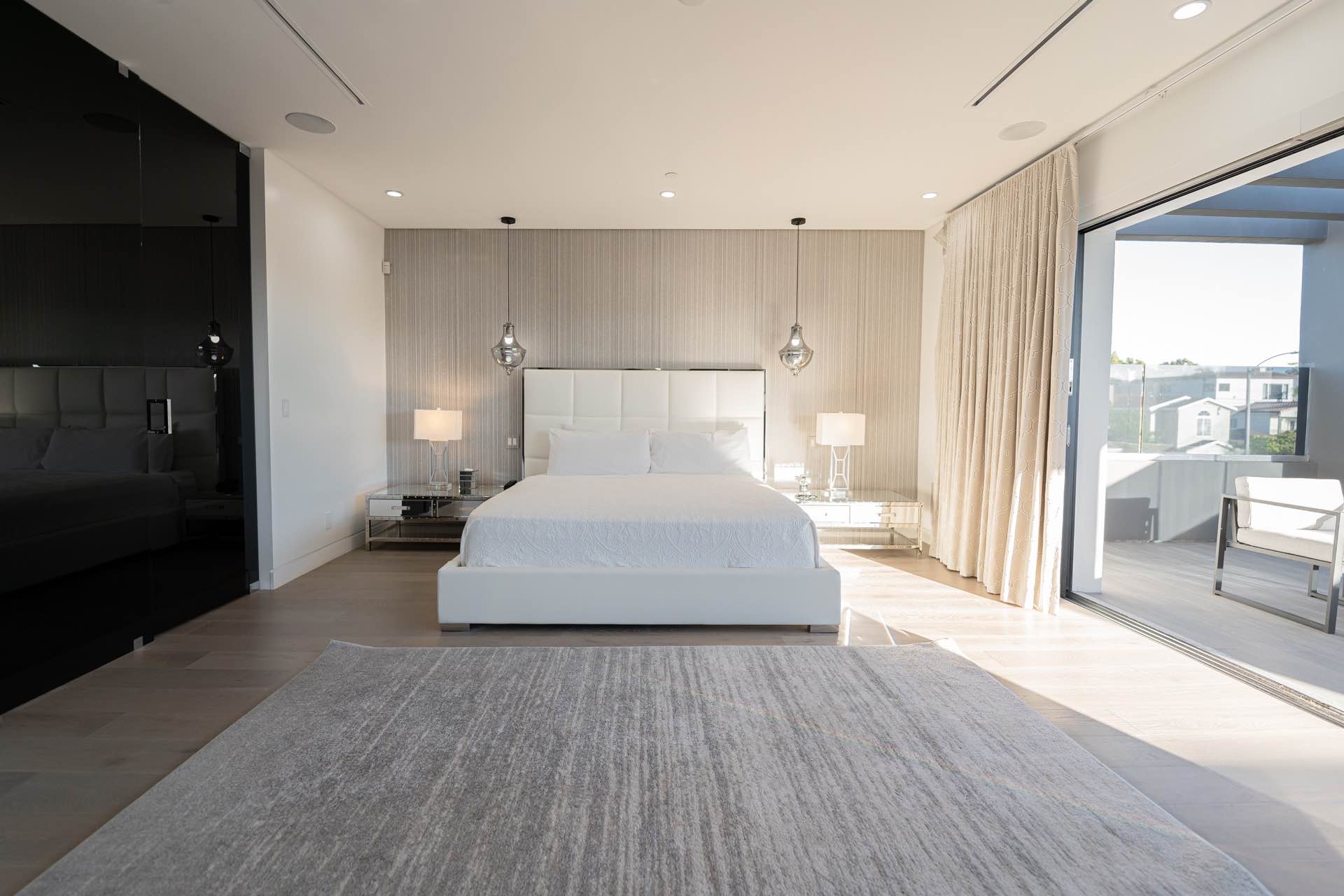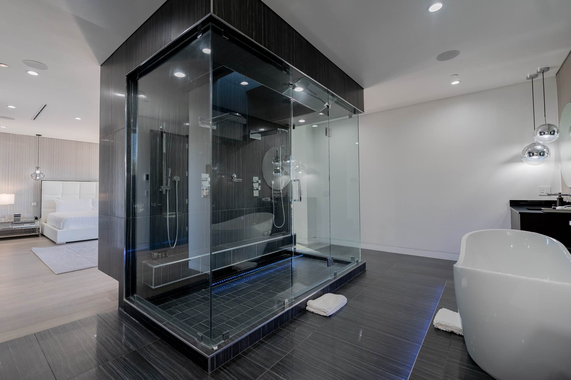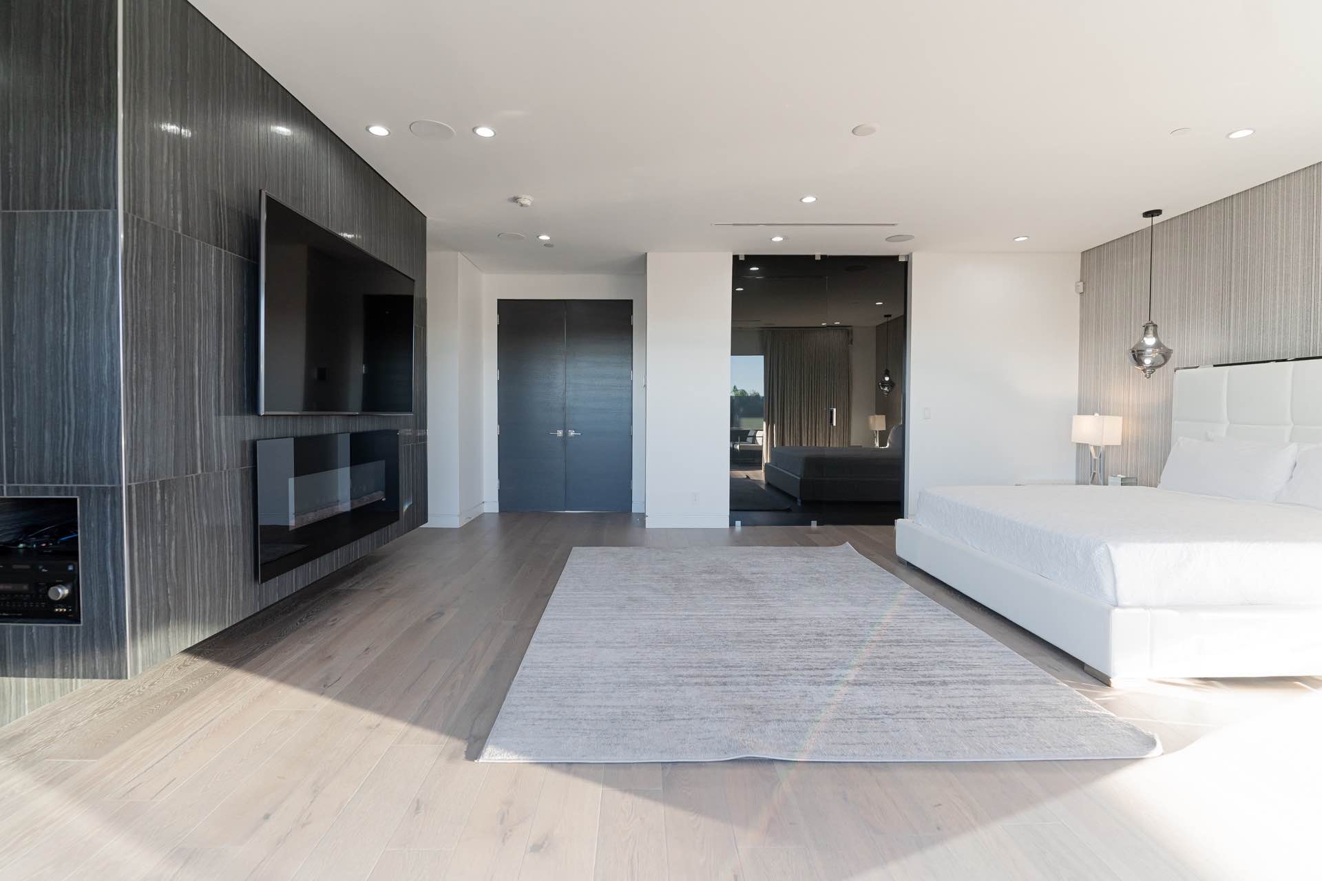 Every technological amenity is controlled by the touch of a button: in-ceiling speakers in every room, LED lighting, in-wall fireplaces, and custom automated window coverings. The open kitchen is anchored by the oversized island and boasts top-of-the-line Miele appliances.