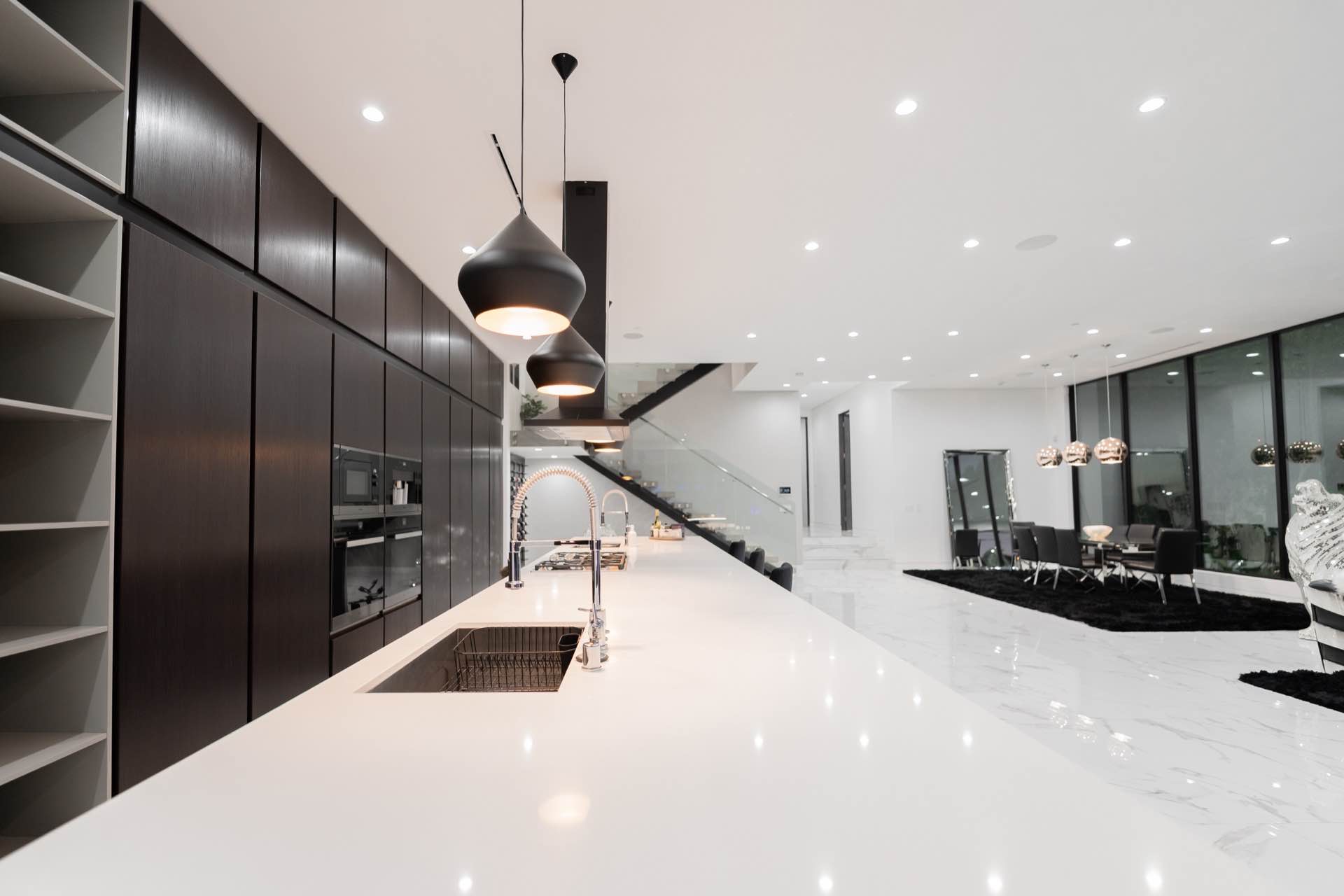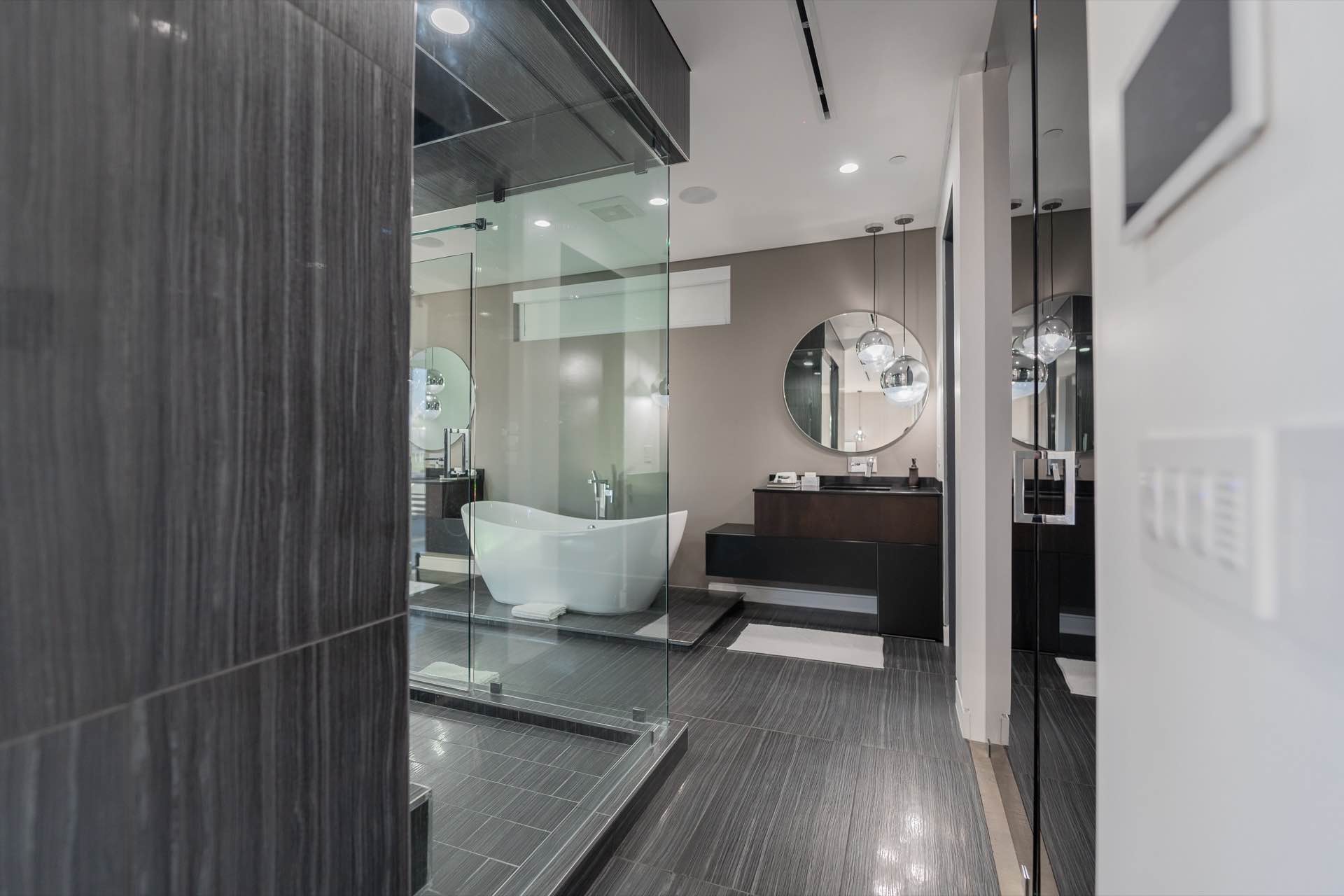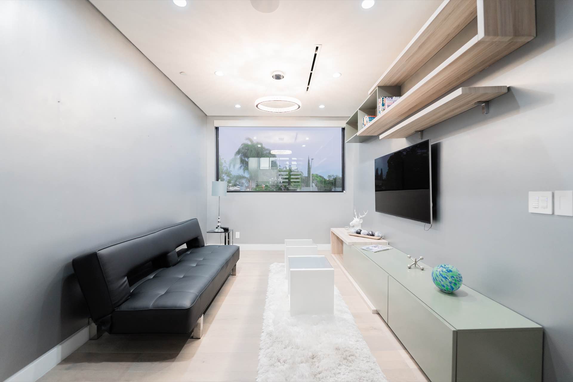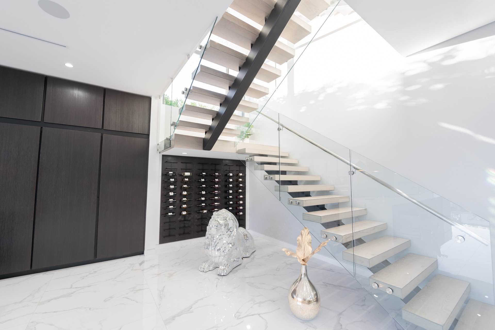 Every technological amenity is controlled by the touch of a button: in-ceiling speakers in every room, LED lighting, in-wall fireplaces, and custom automated window coverings. The open kitchen is anchored by the oversized island and boasts top-of-the-line Miele appliances.