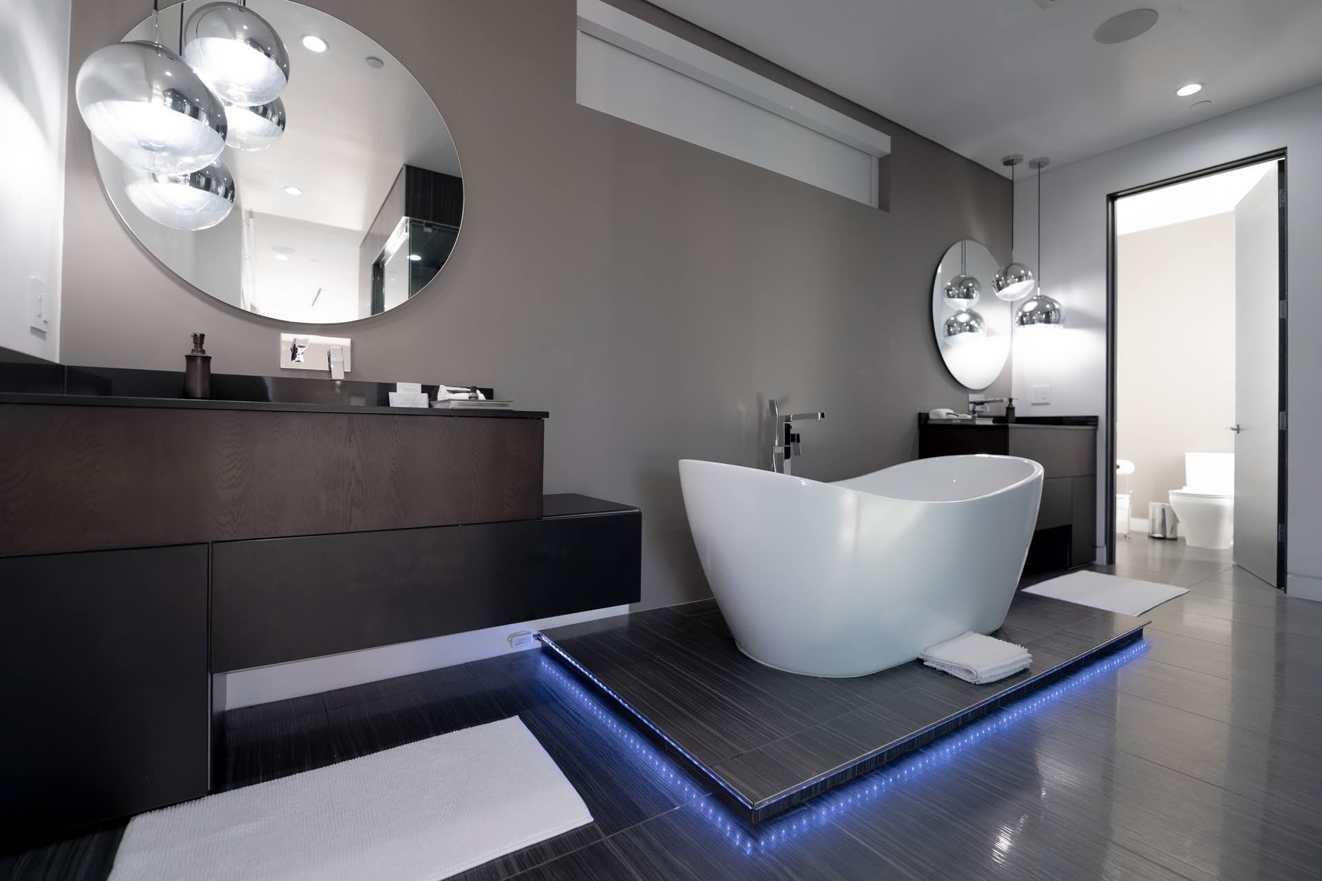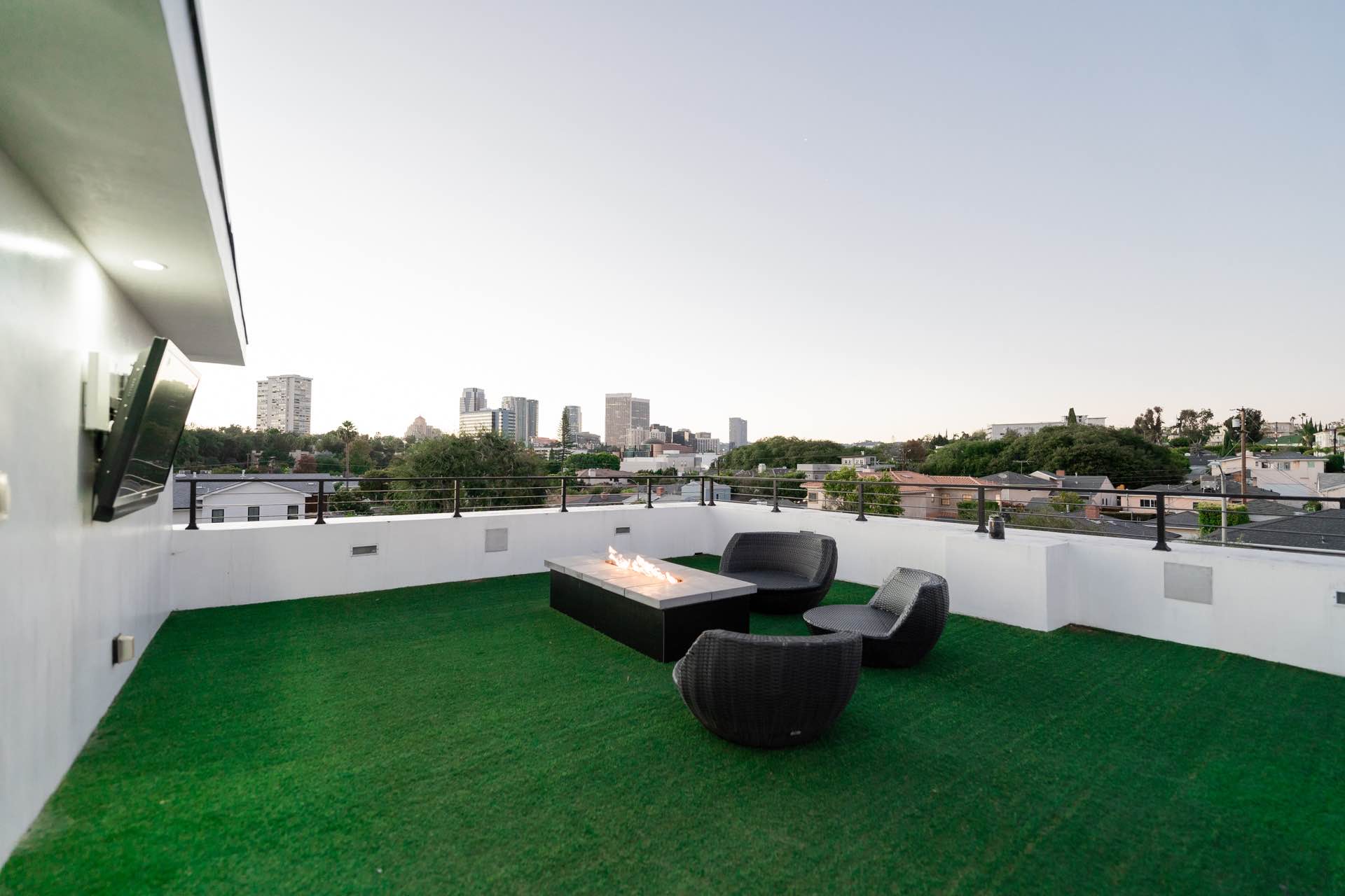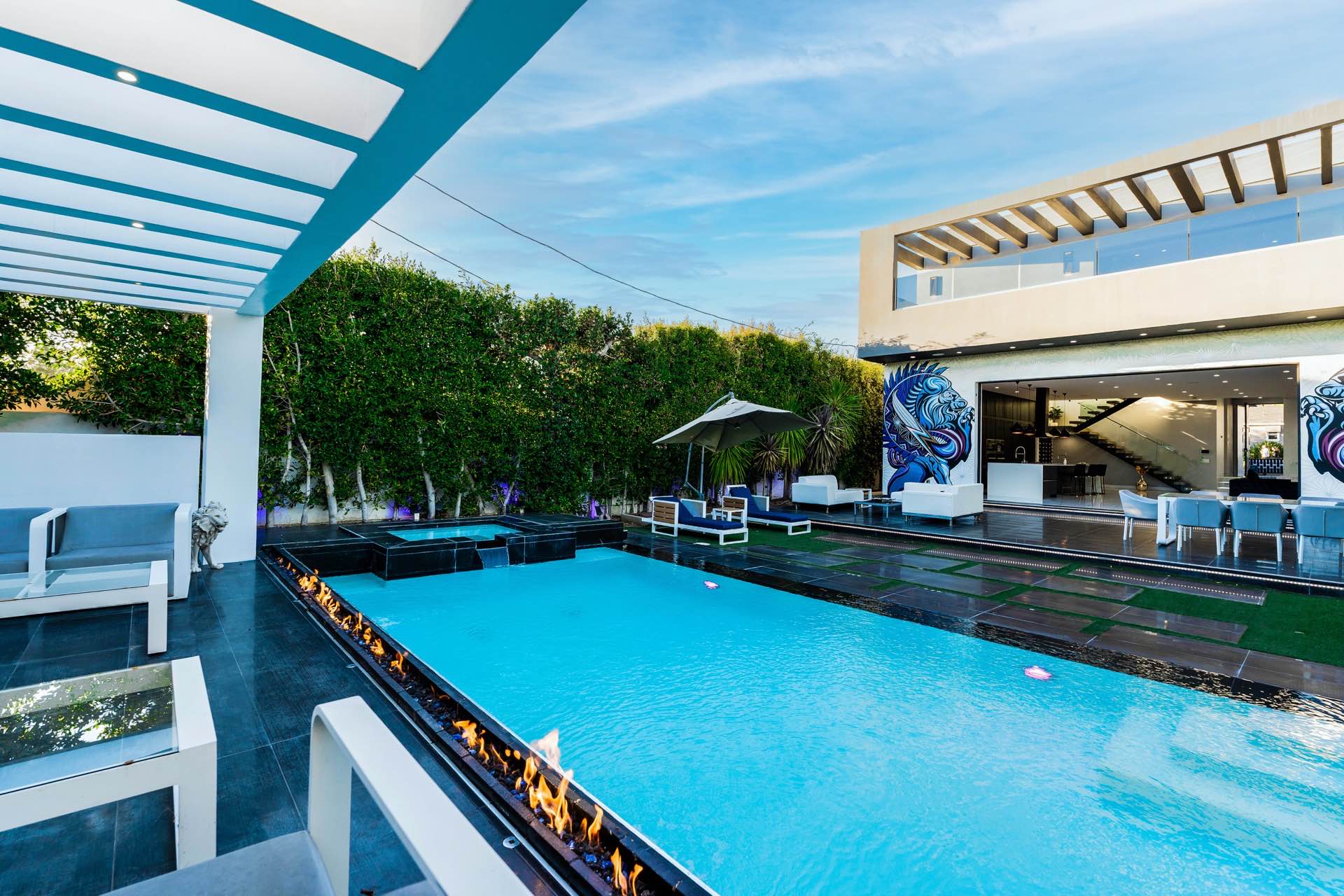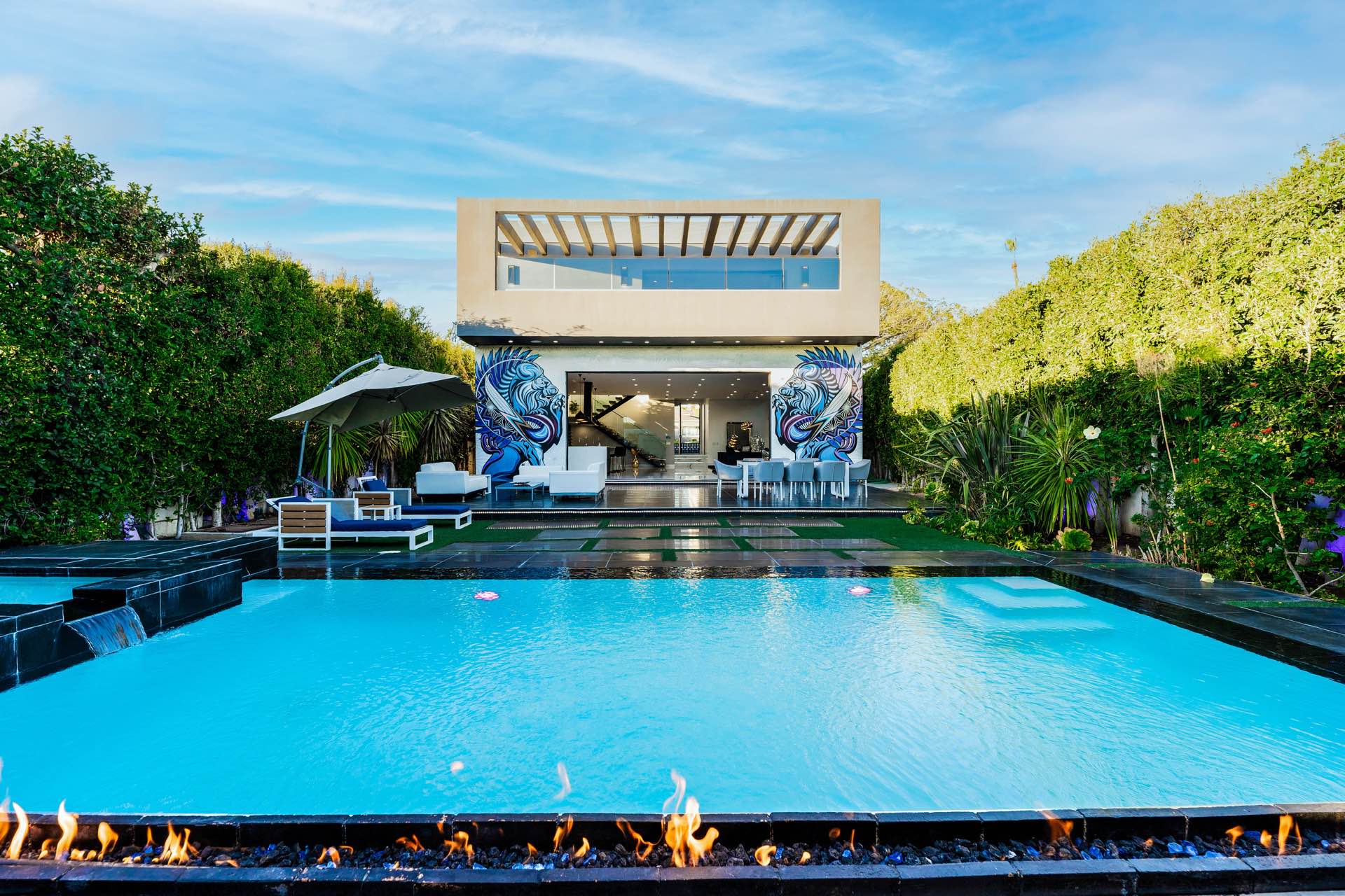 Outside, you will find a stunning infinity pool, hot tub, custom fire and water walls, and mural installation created by the famed artist Chris Saunders. In addition, enjoy the rooftop deck that offers nearly 360 degree views of the entire city.