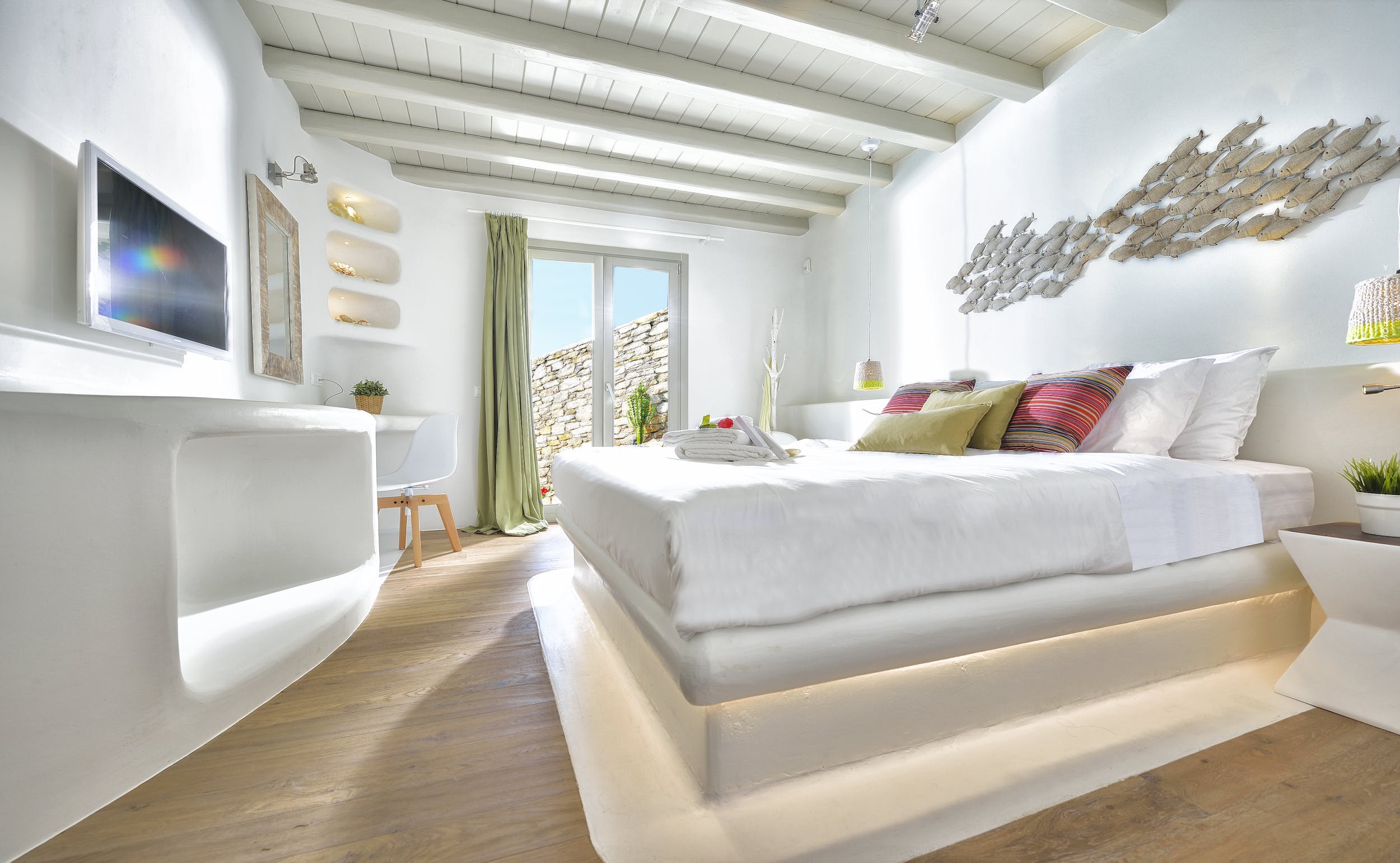 Indeed, the turquoise waters of Blue Elia’s infinity pool seem to merge with the shimmering waters of the Aegean to create an endless vista of summery blue. Loungers line the sunny wooden deck and, beyond that, the terrace offers further places to relax with friends or dine out under the starry skies.