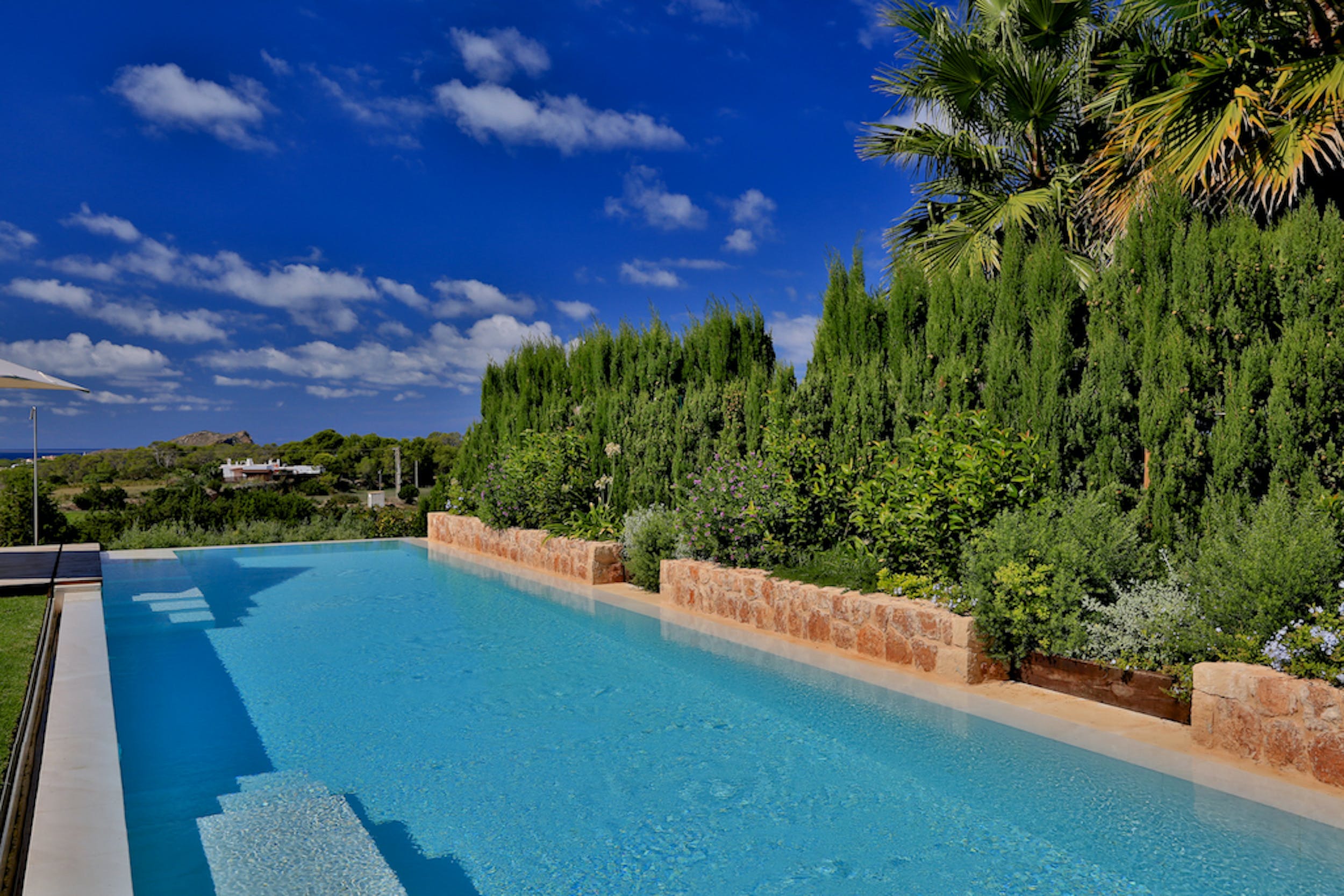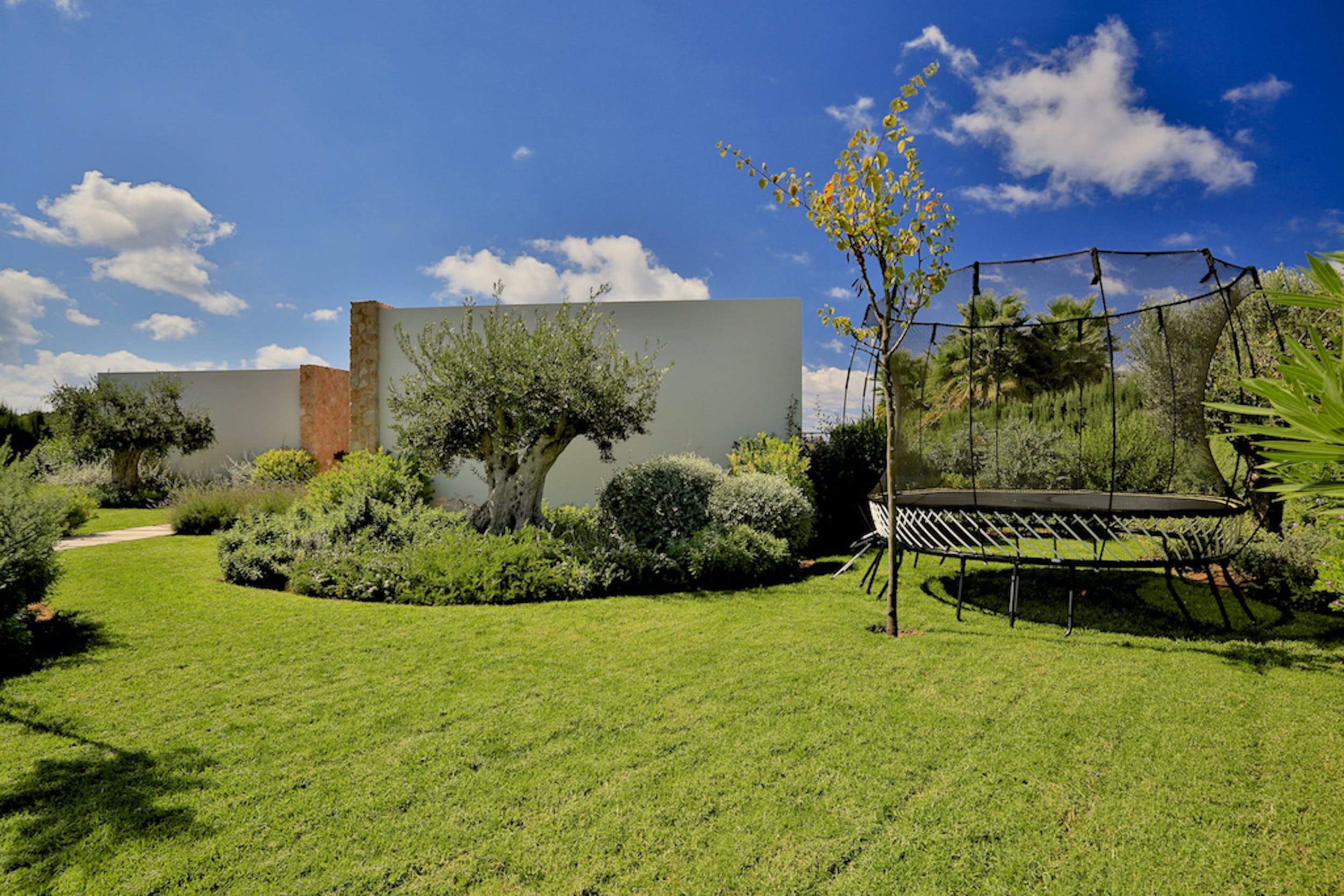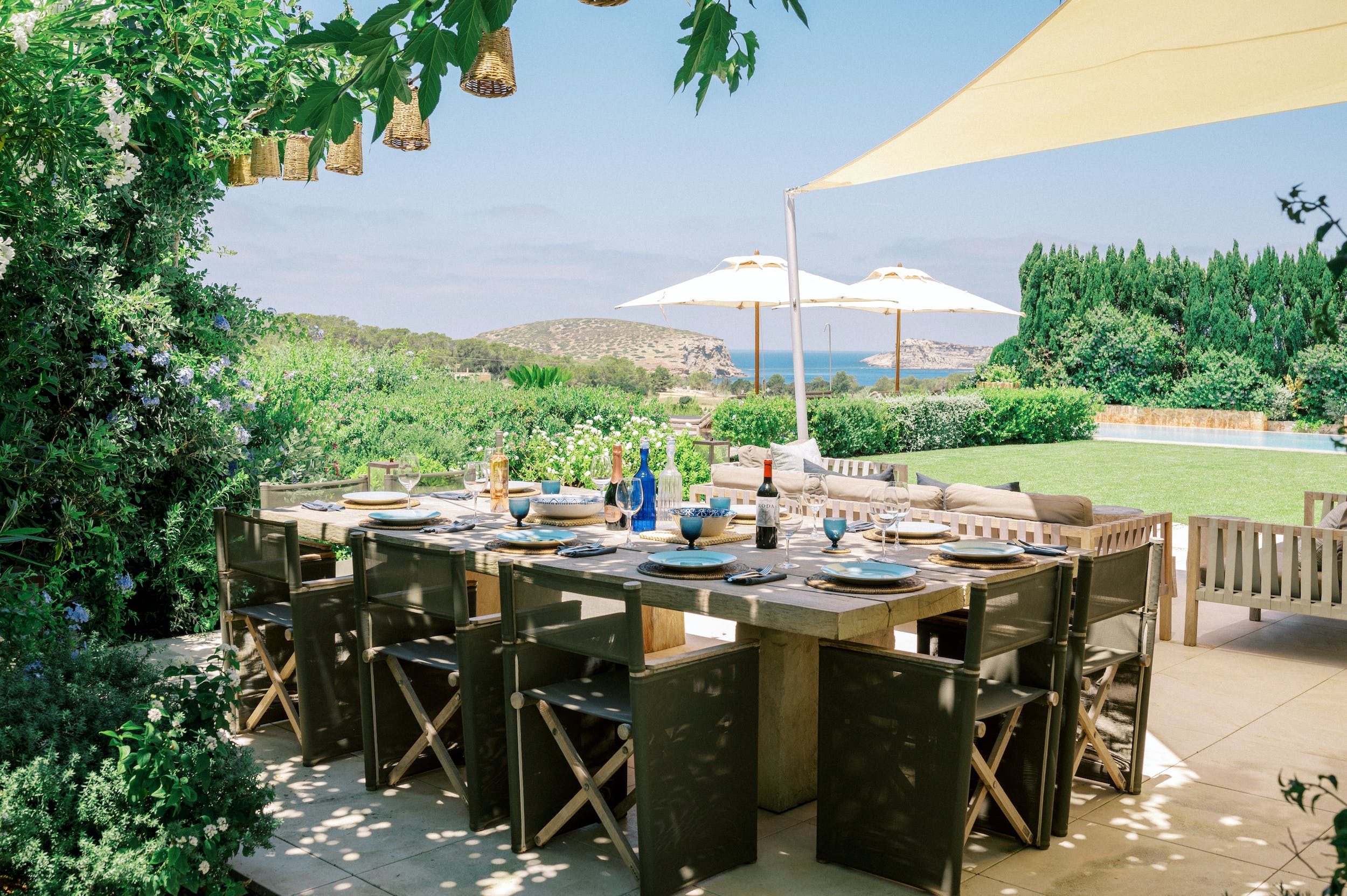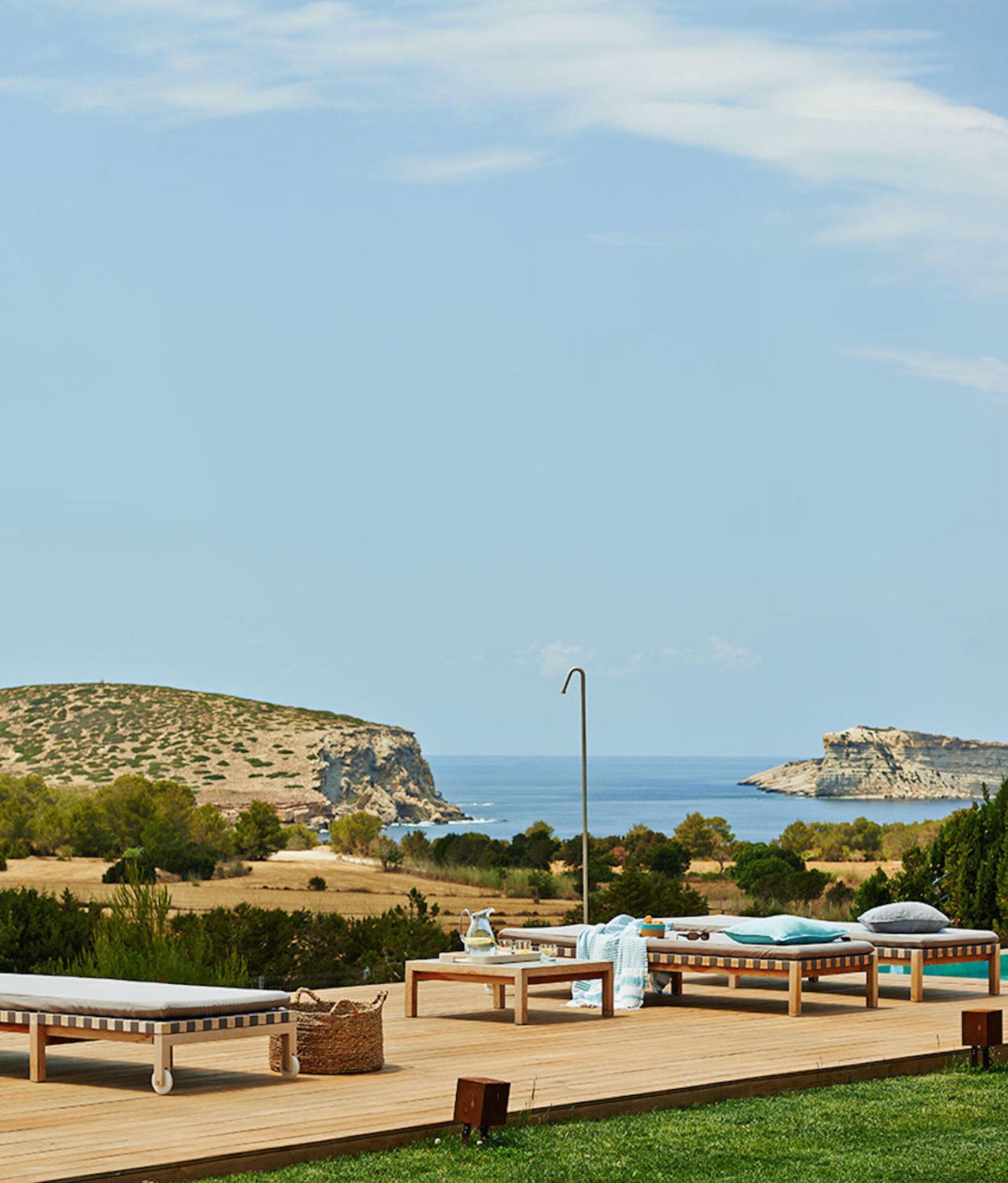 Amongst the manicured lawns and flower-filled gardens, you’ll discover a myriad of spaces in which to chill out or soak up the glorious Ibizan sunshine, plus a summer kitchen with barbeque.