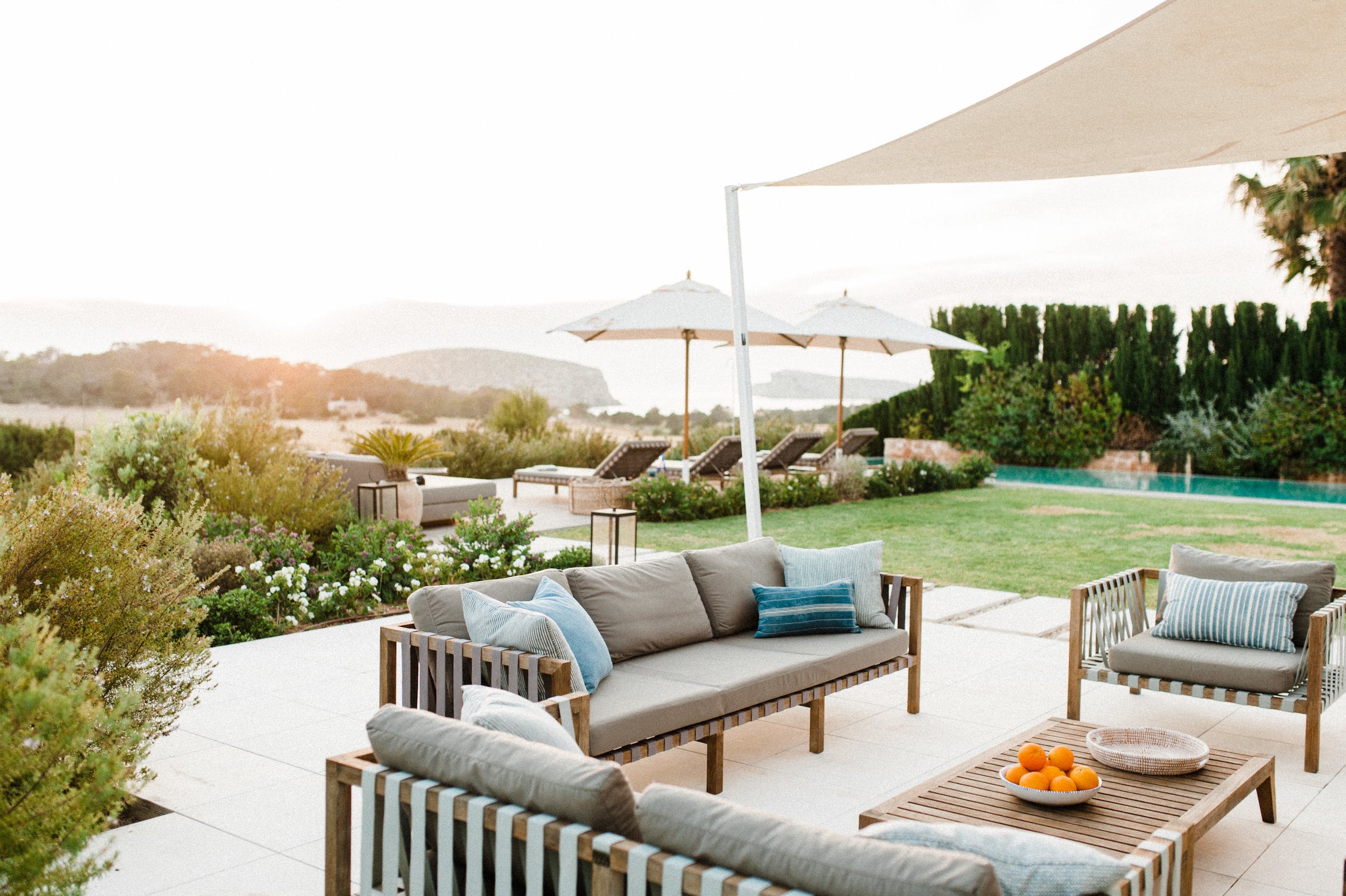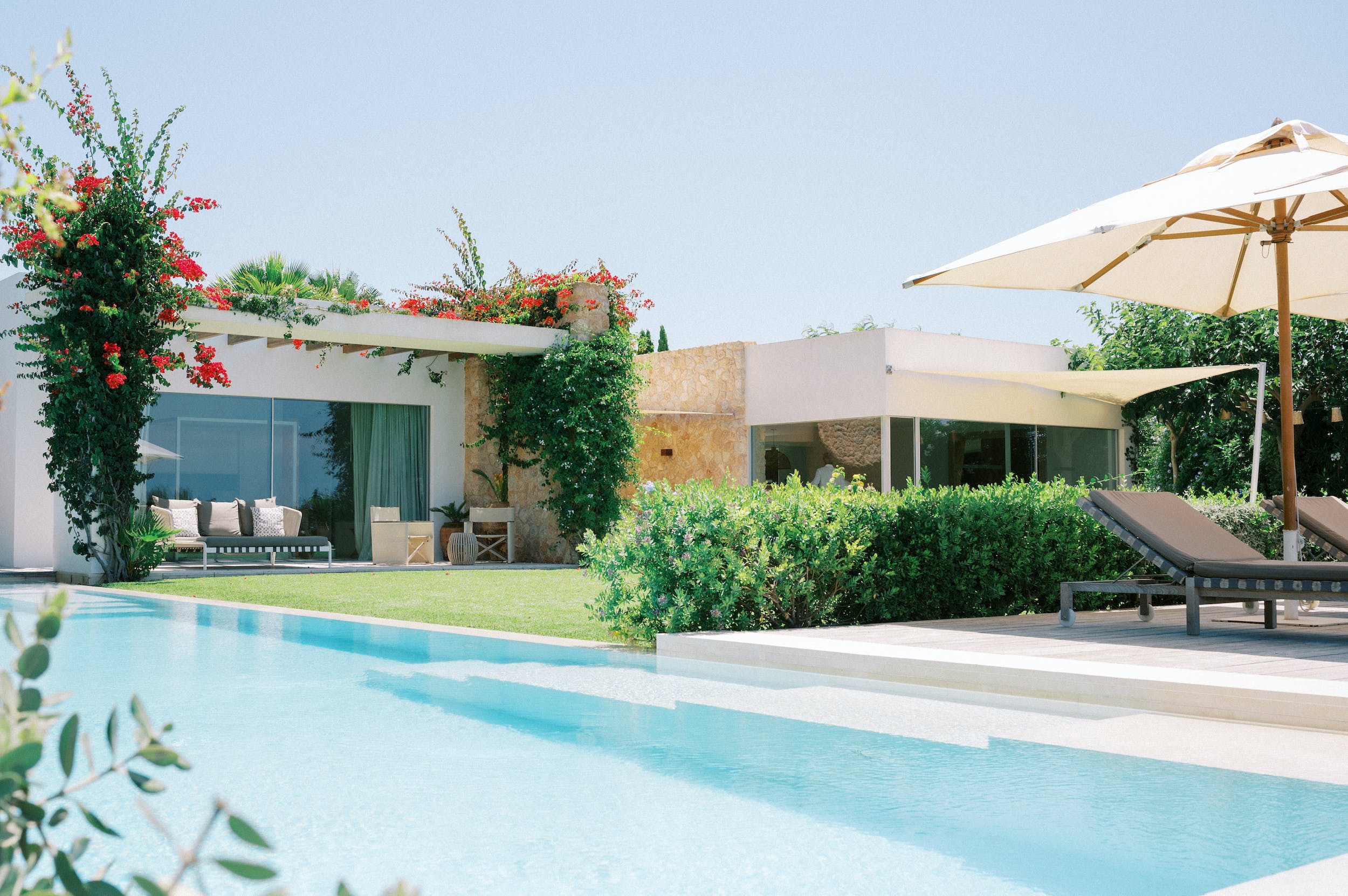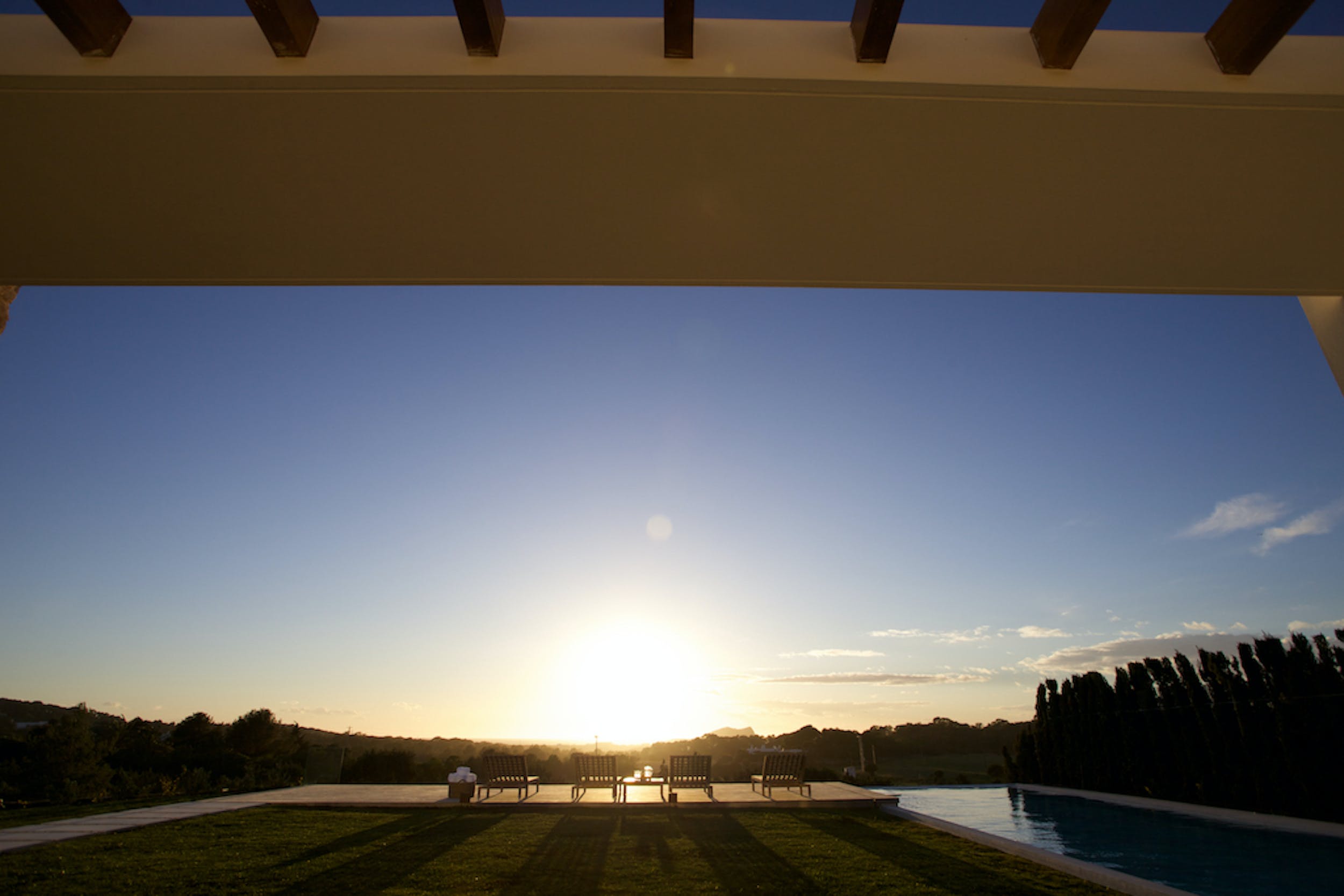 Amongst the manicured lawns and flower-filled gardens, you’ll discover a myriad of spaces in which to chill out or soak up the glorious Ibizan sunshine, plus a summer kitchen with barbeque.