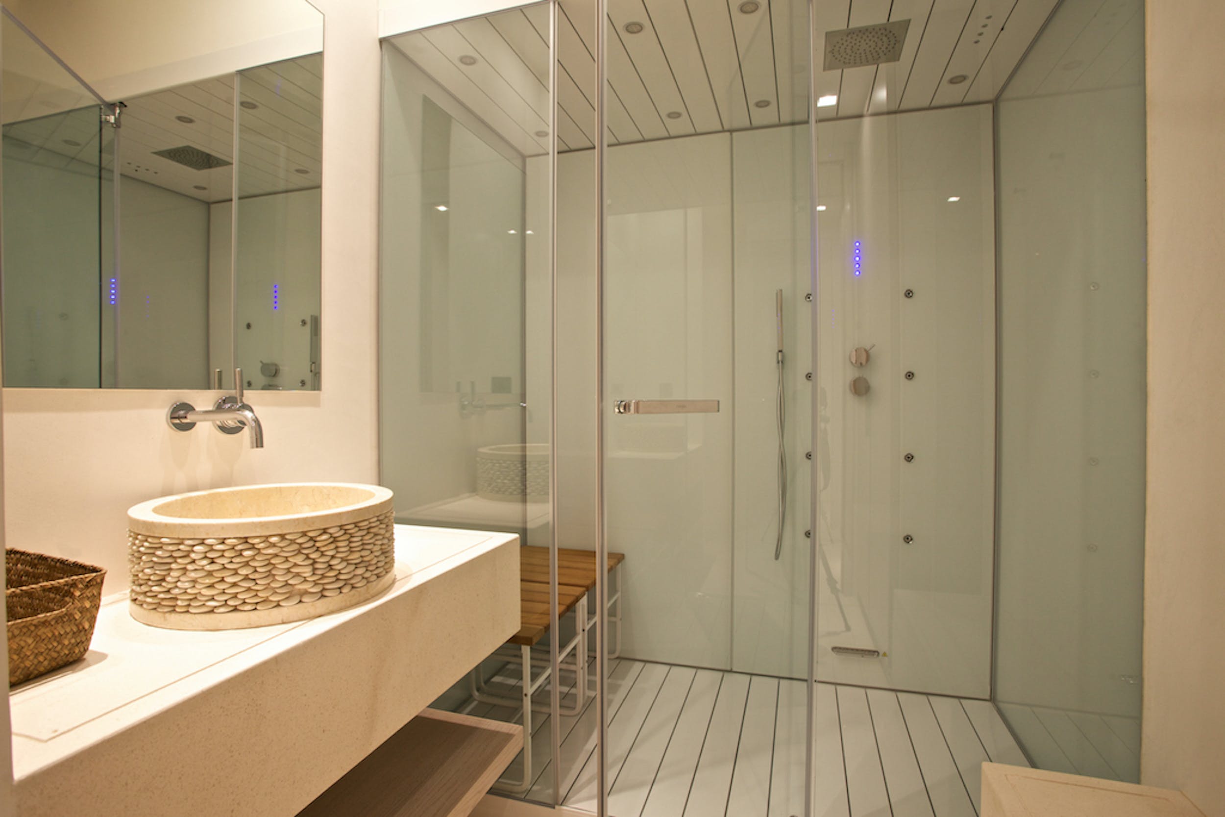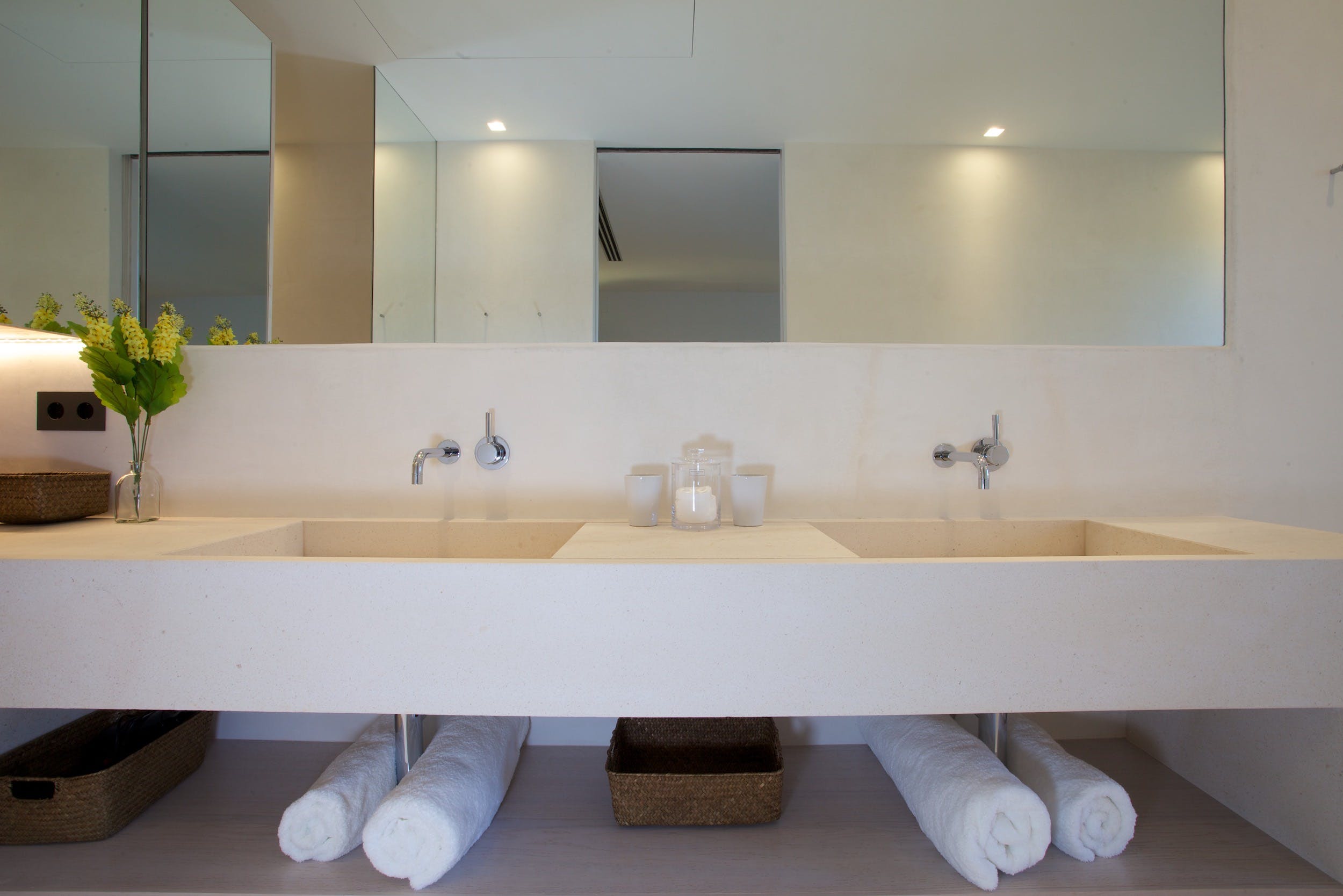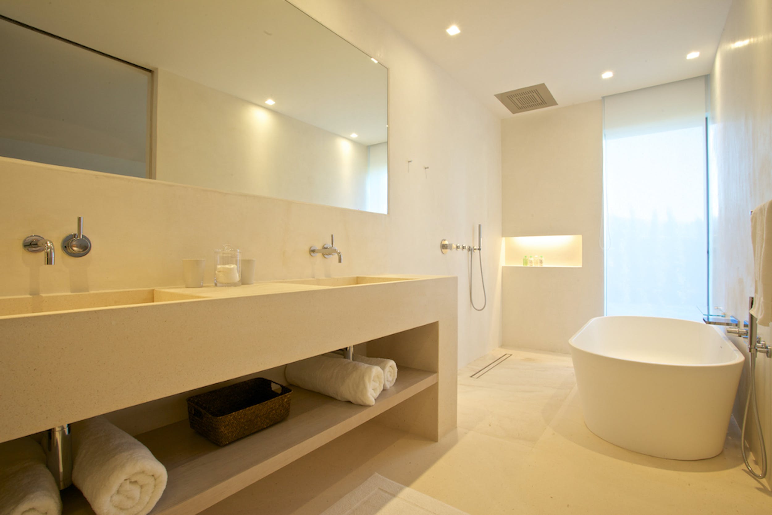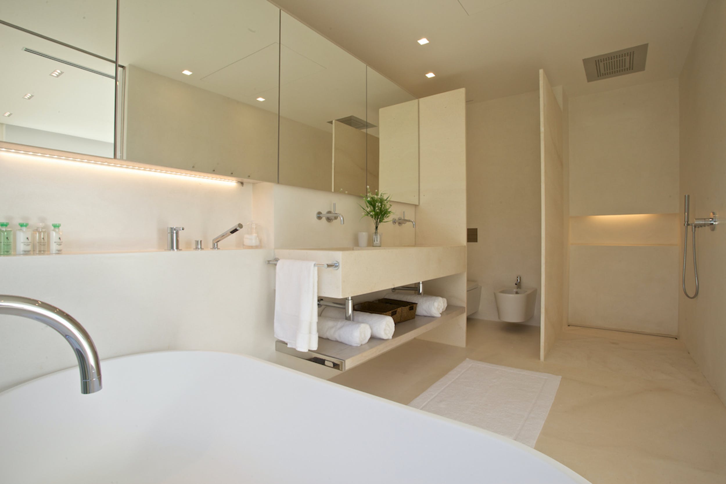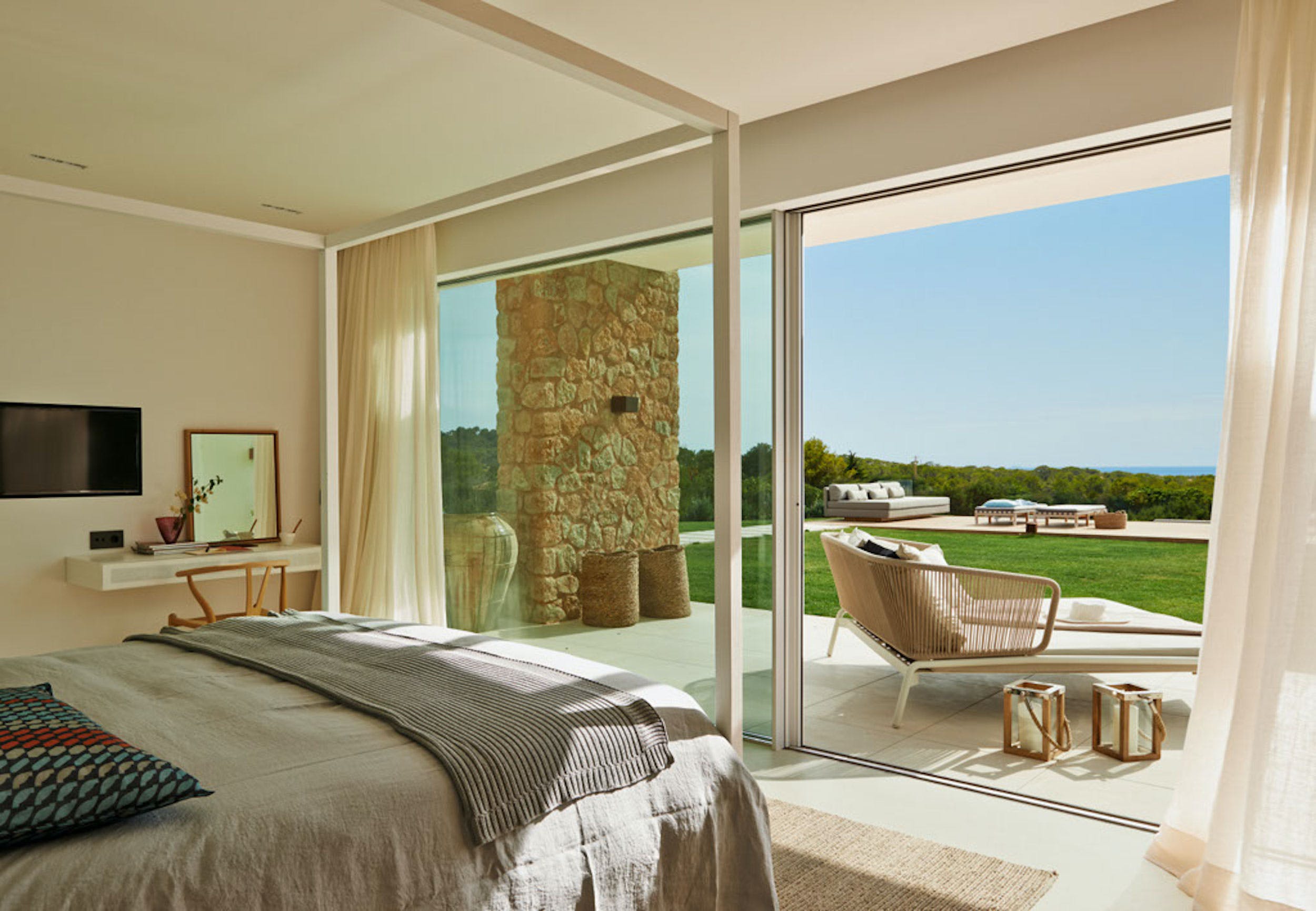 The same cool, crisp style continues through the five double bedrooms, each of which has a large, en-suite bathroom and access onto the terrace or garden. Four of the doubles can be split into a pair of twin beds for versatile guest accommodation.