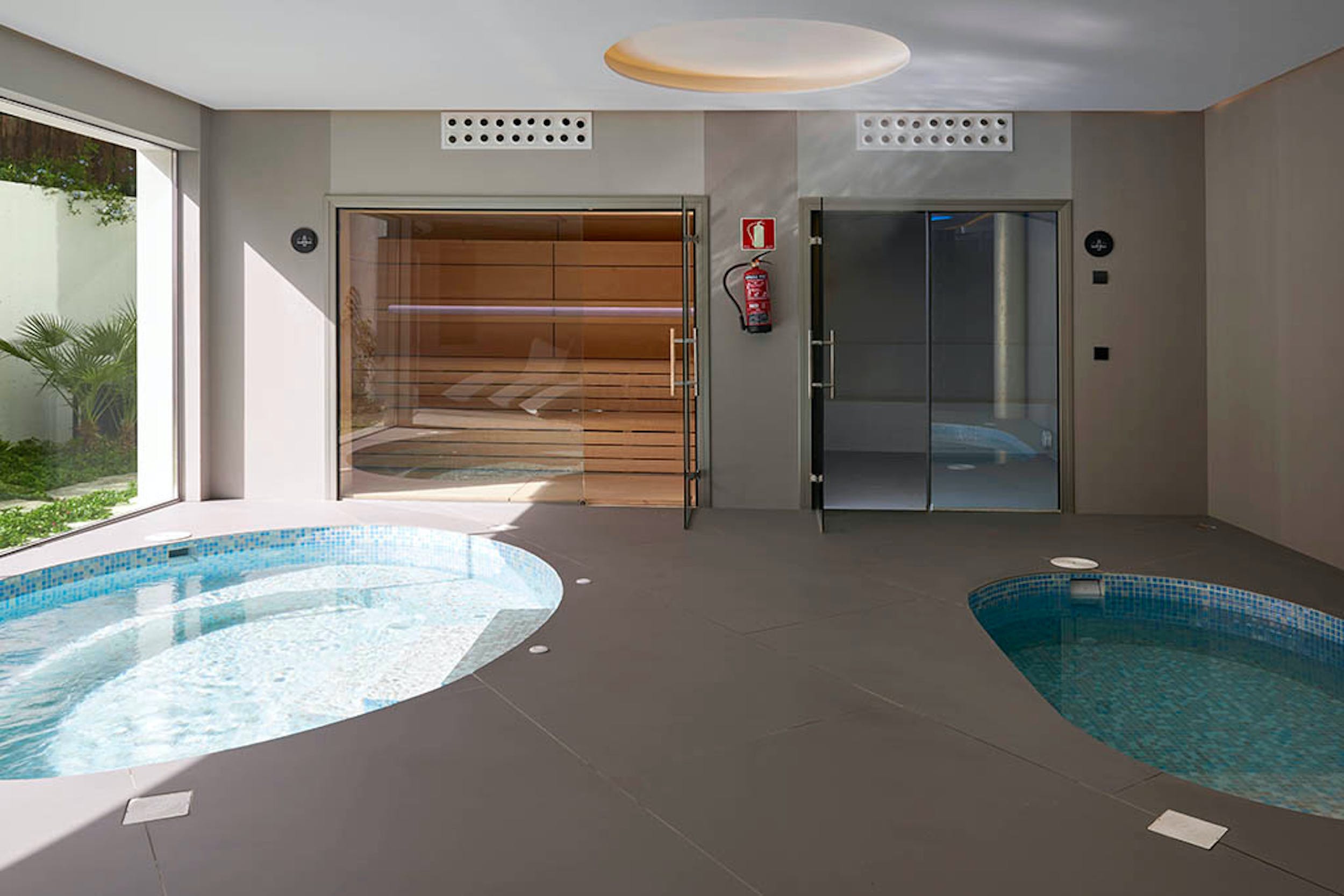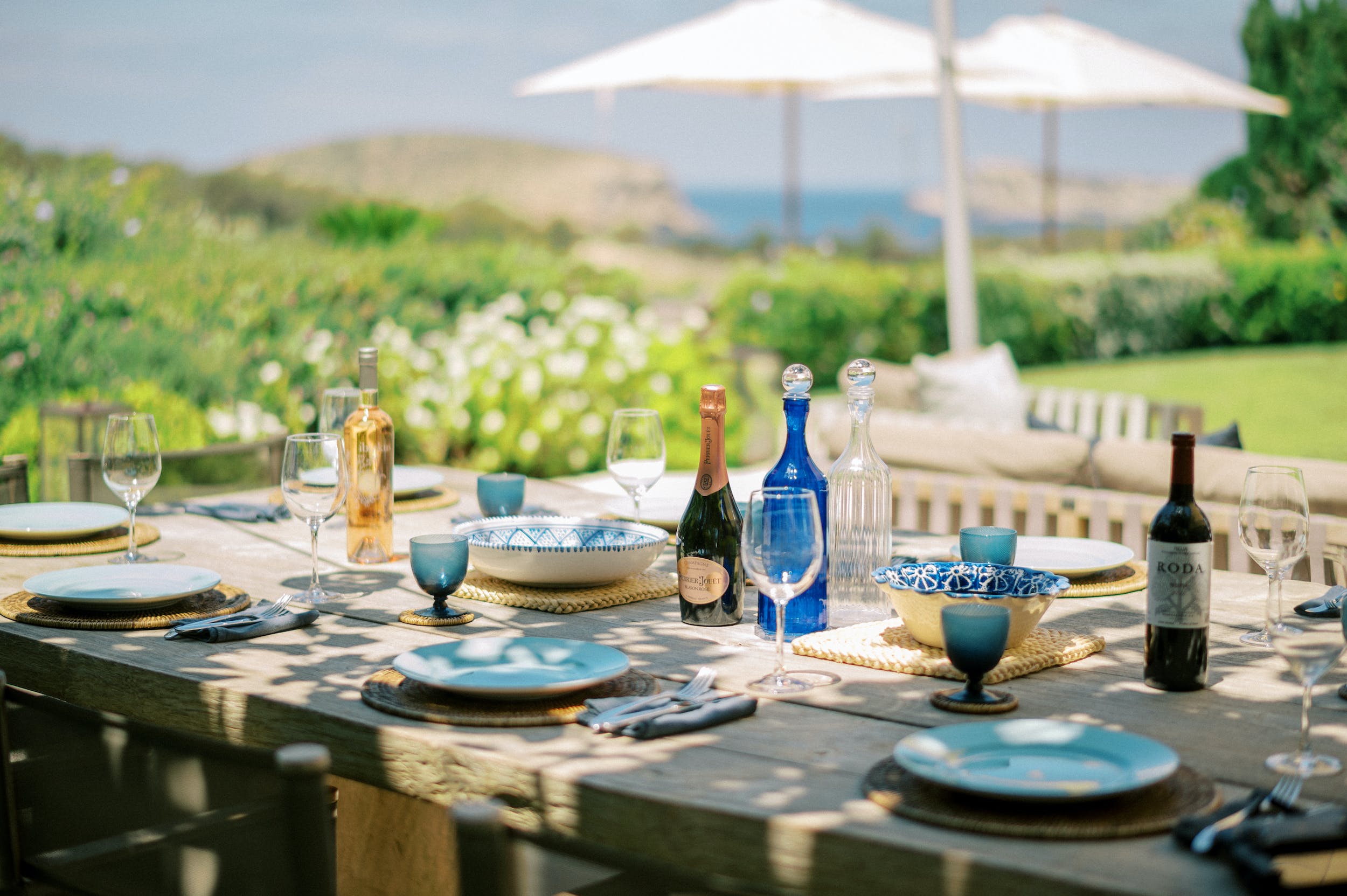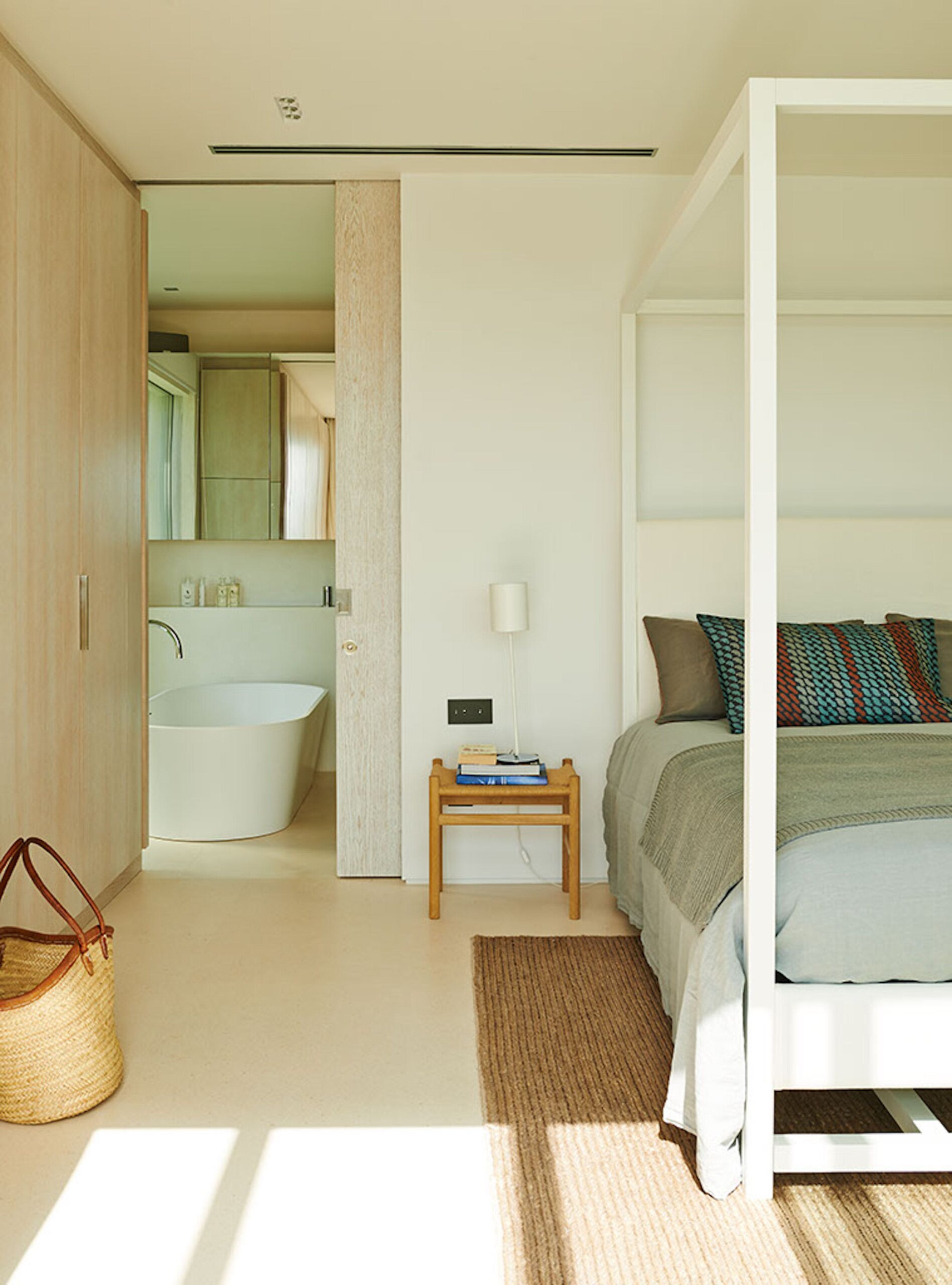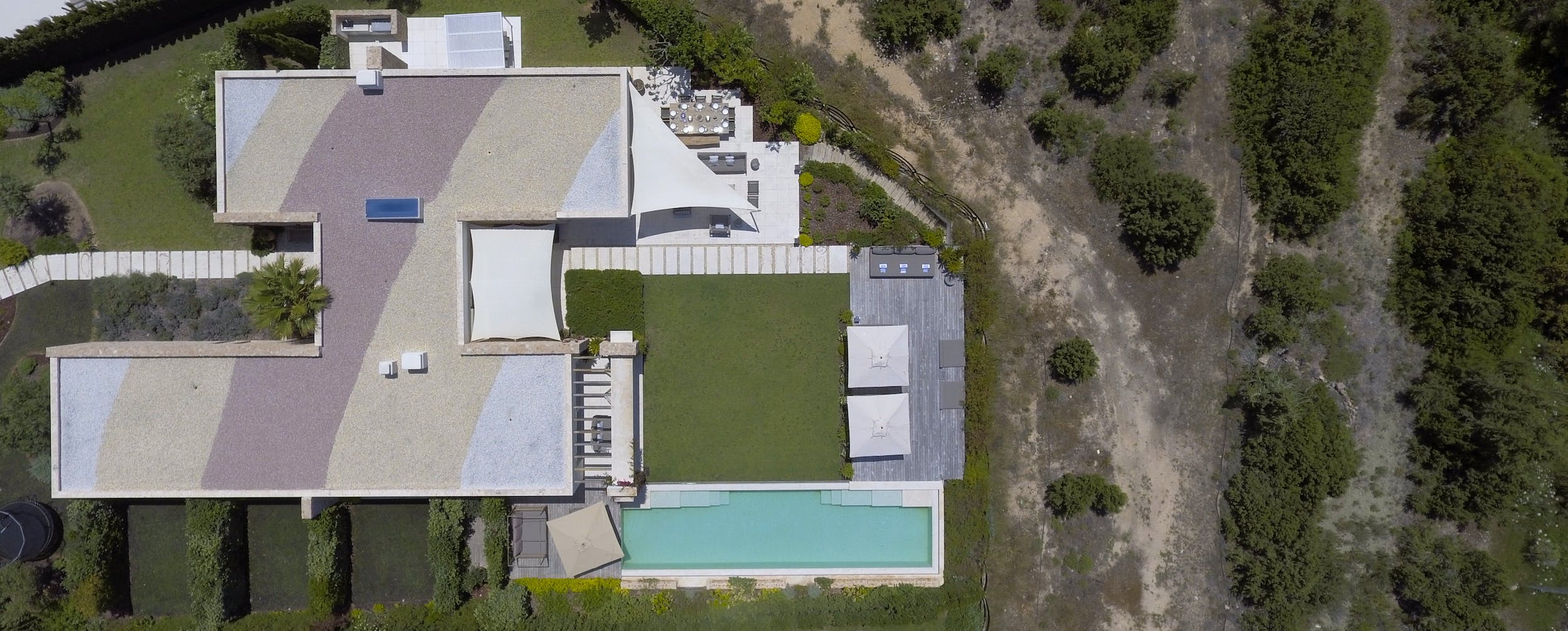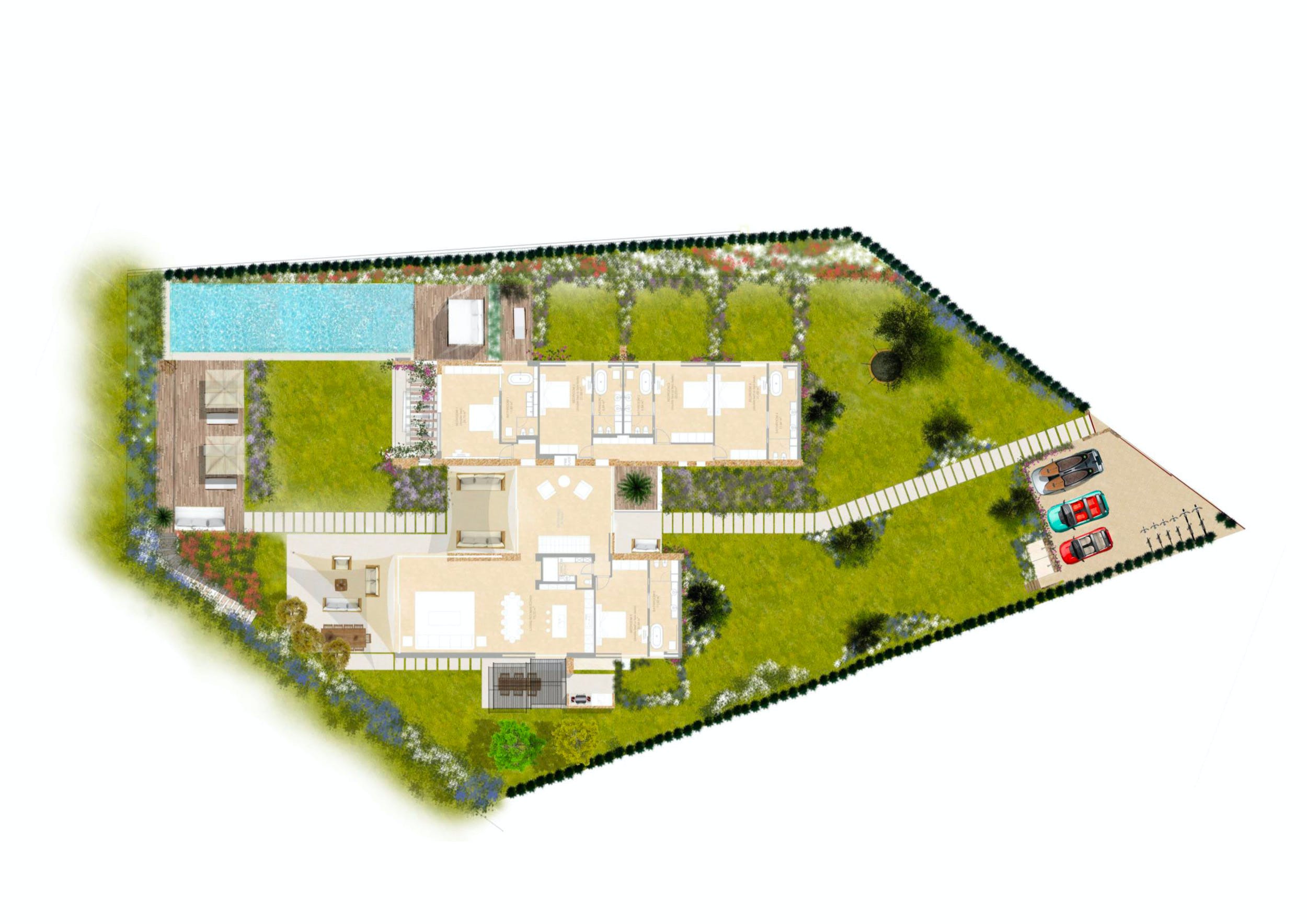 The same cool, crisp style continues through the five double bedrooms, each of which has a large, en-suite bathroom and access onto the terrace or garden. Four of the doubles can be split into a pair of twin beds for versatile guest accommodation.
