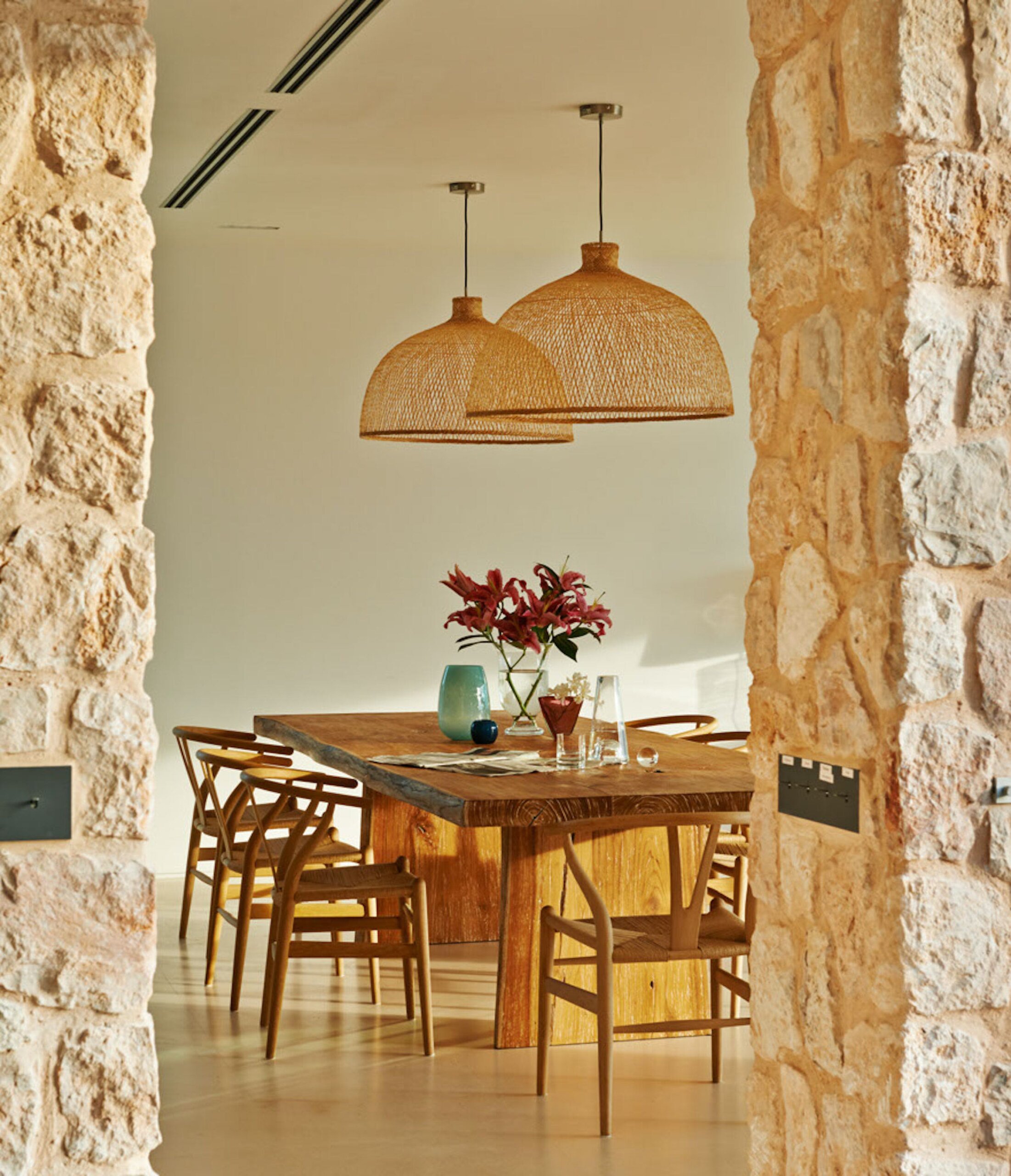 Inside, the polished floors, natural stone and bleached wood create a cool, calm living space; from the sleek kitchen, rustic dining table, relaxed sofa seating and open fireplace, this home is built for laid-back entertaining.