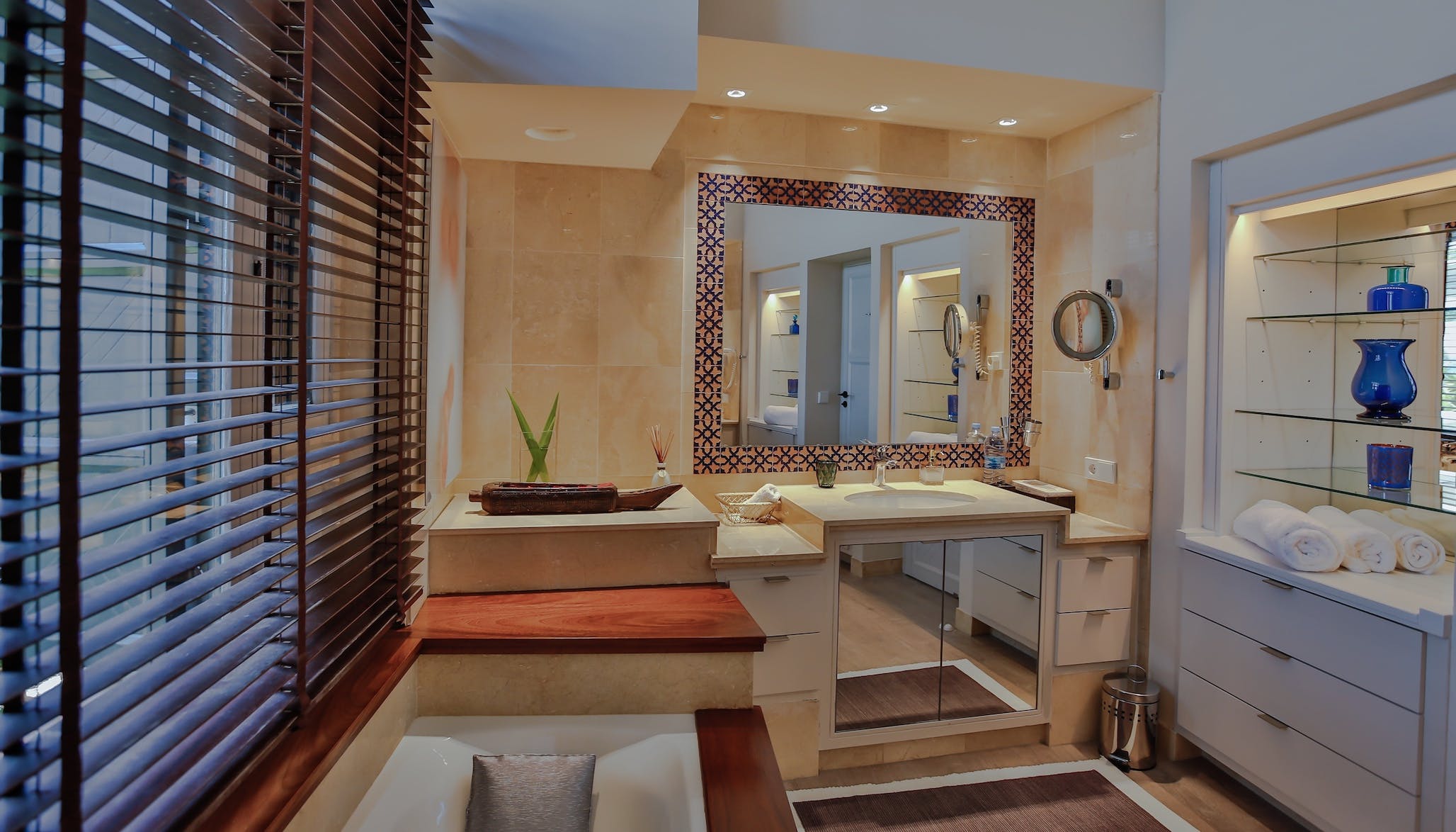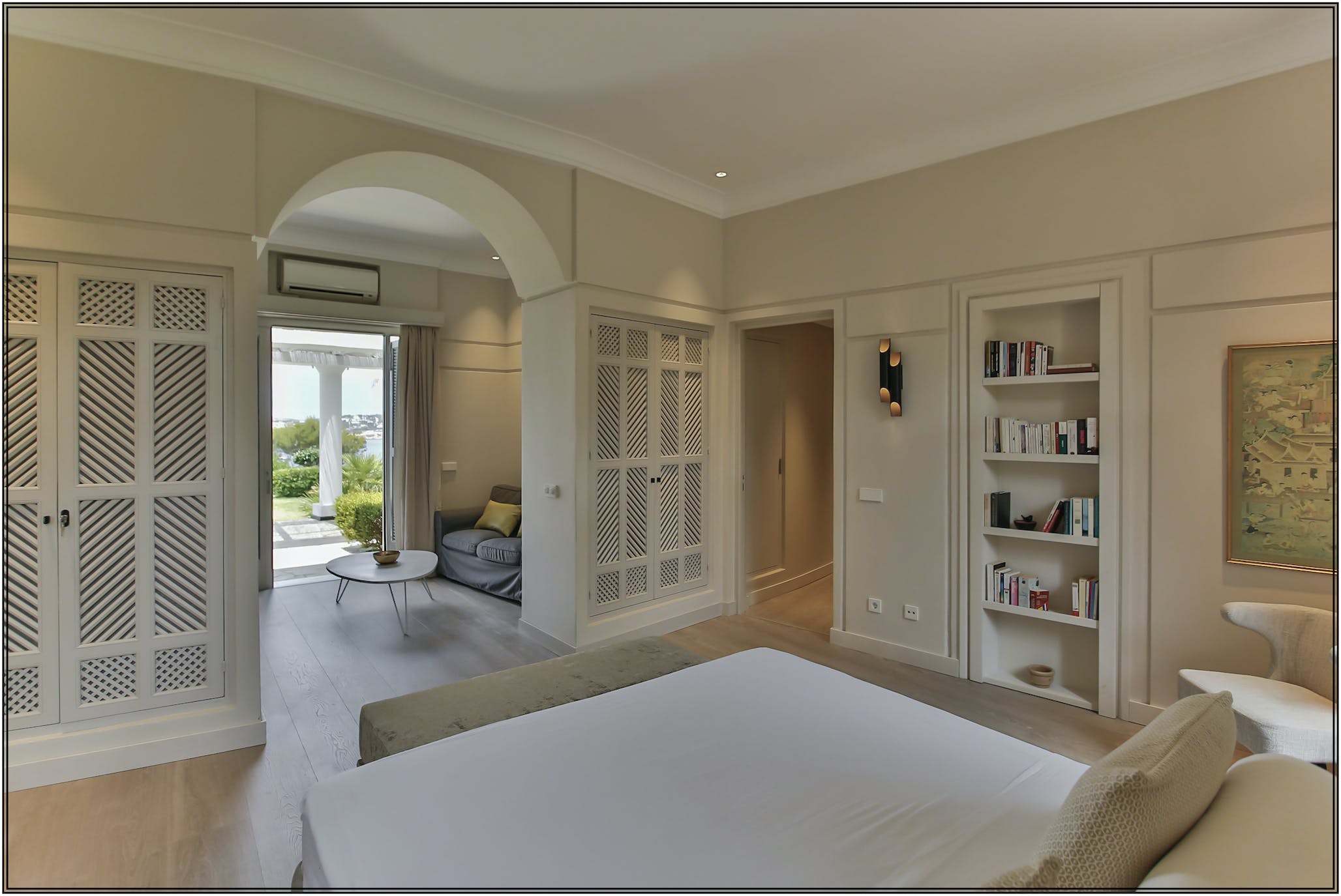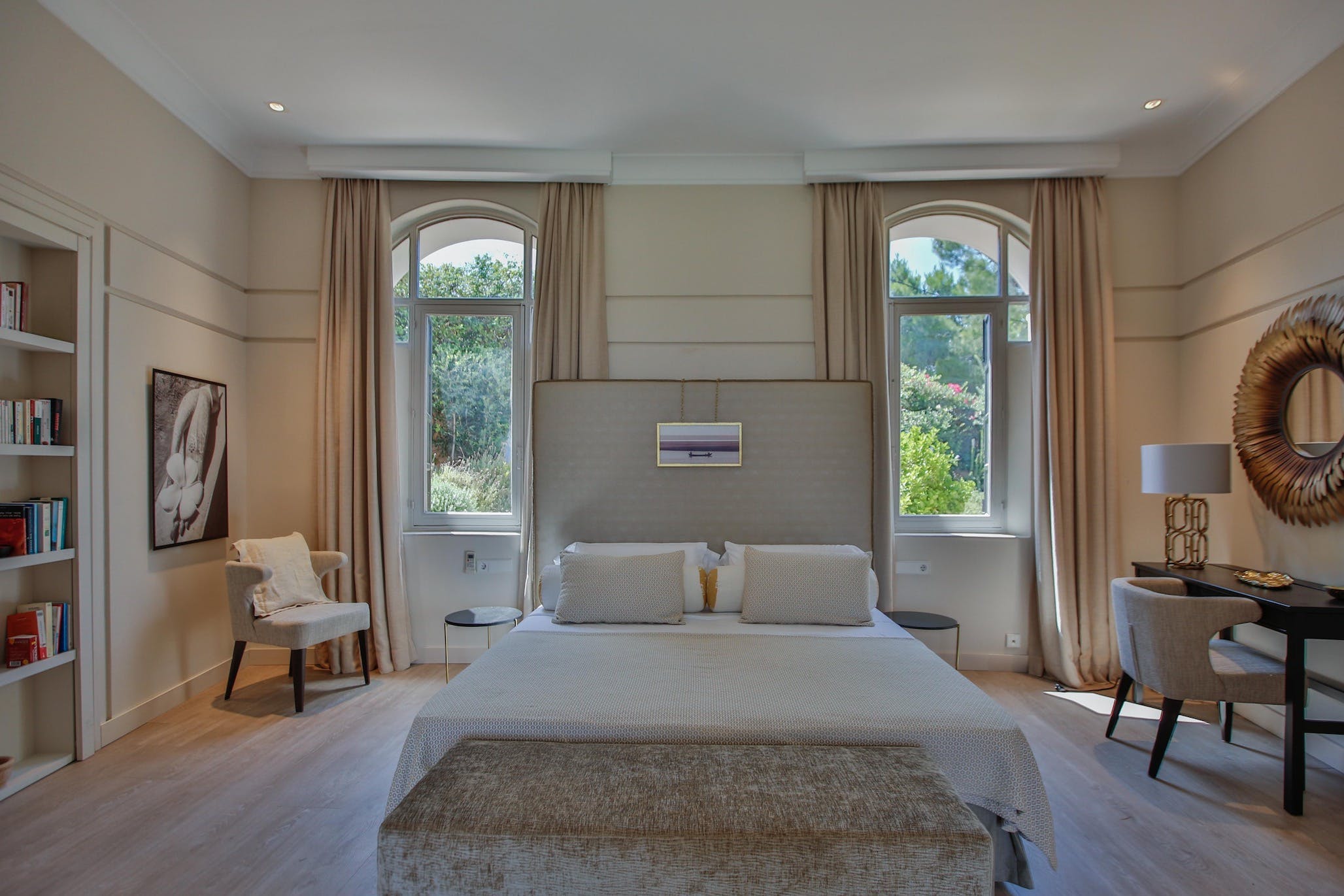 (Main house) King size bed, air conditioning, sitting area with desk and TV. Access to the pool and terrace. Private bathroom with bathtub with ocean views, his and hers sinks and walk-in shower.