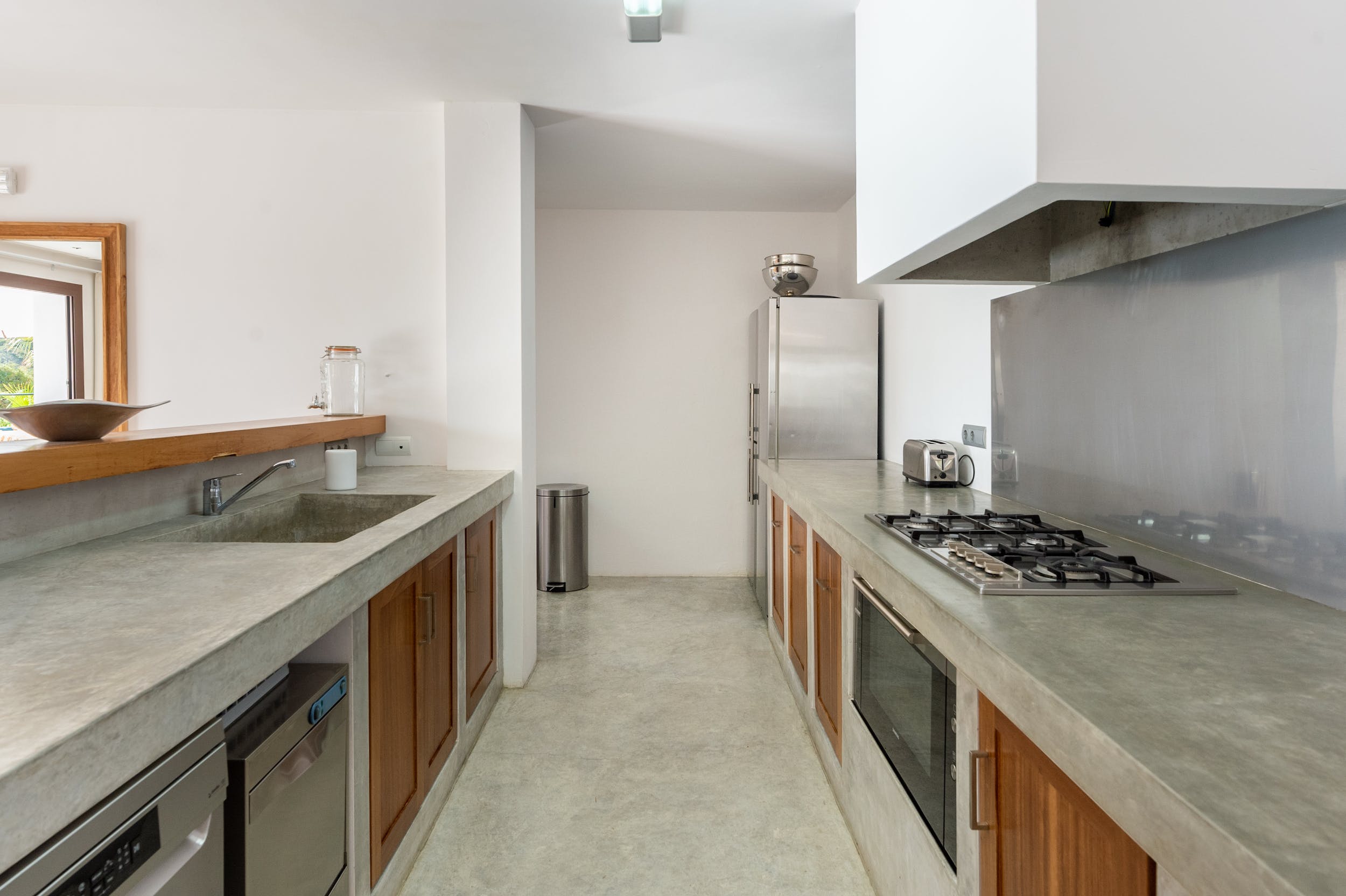 Inside, polished cement floors and white walls lend a minimalist style to the living areas and six double en-suite bedrooms.