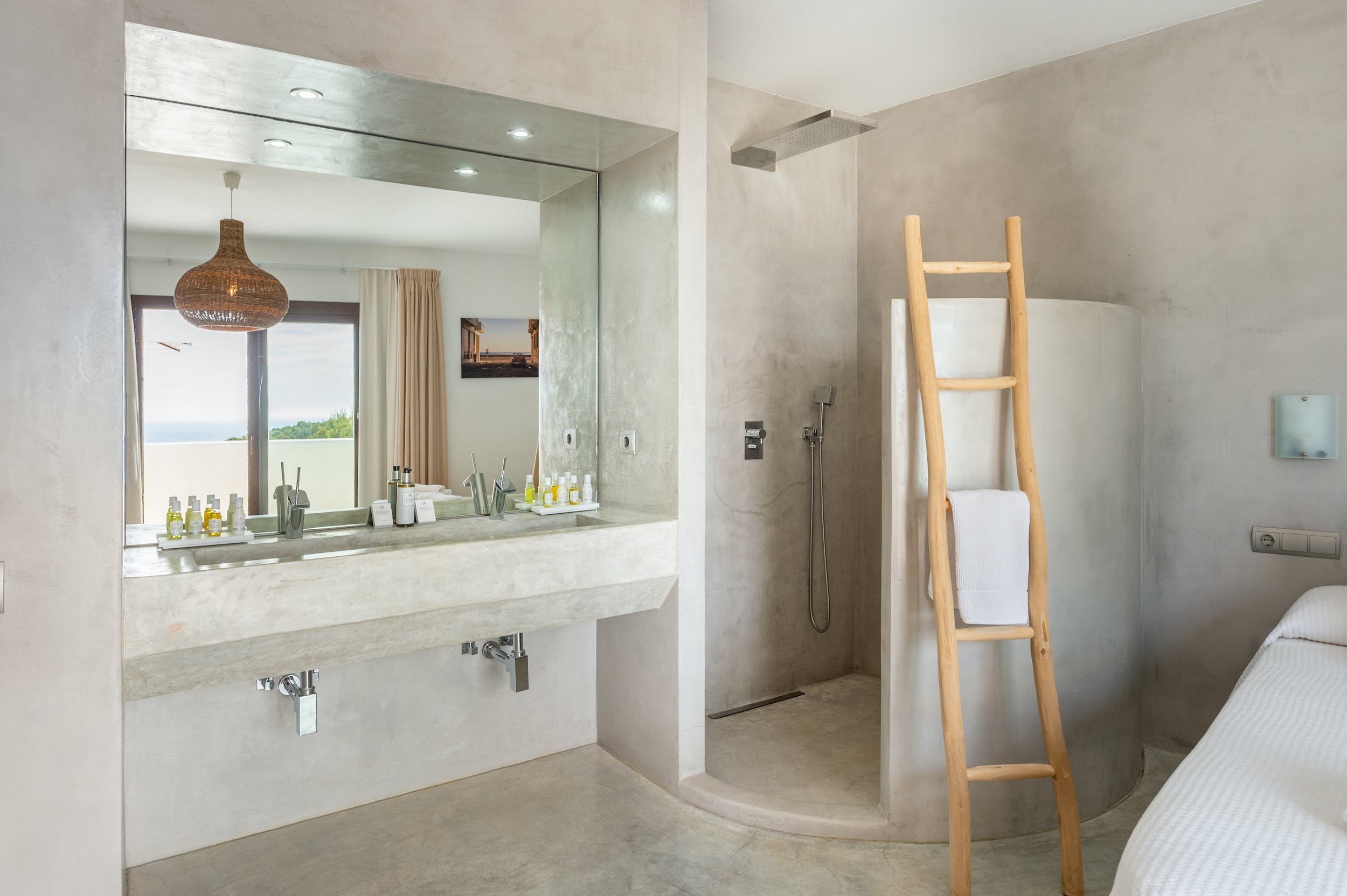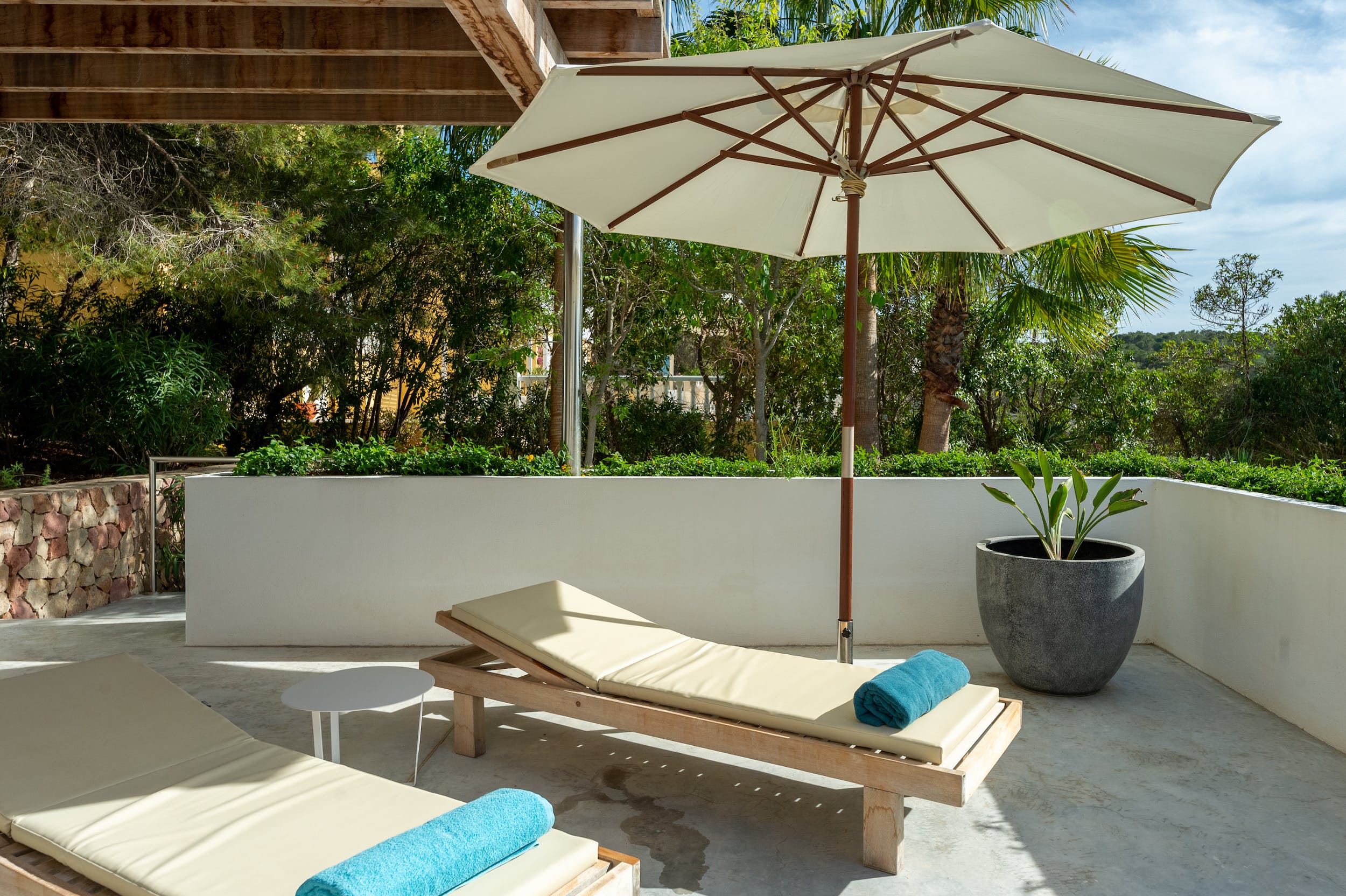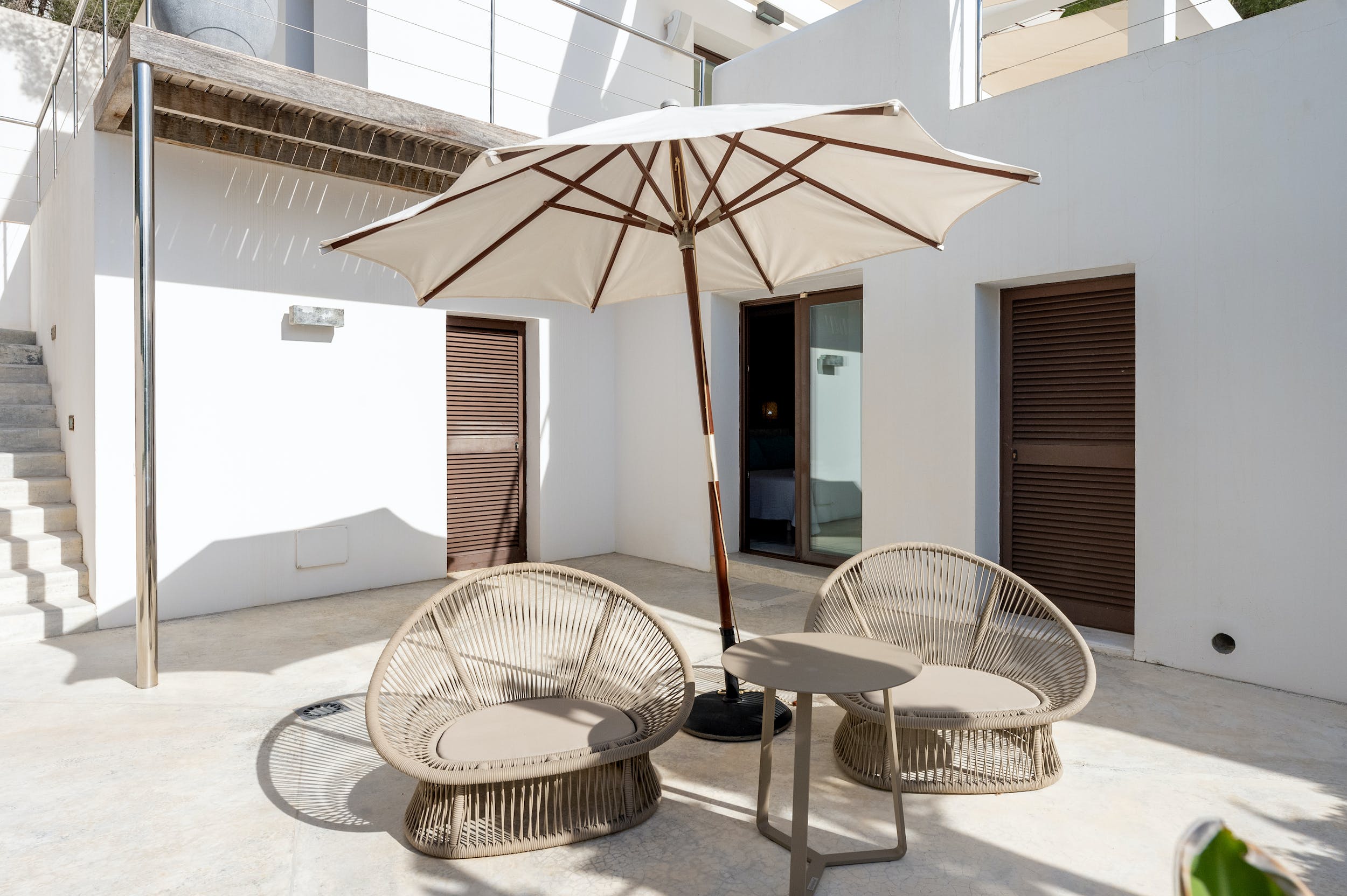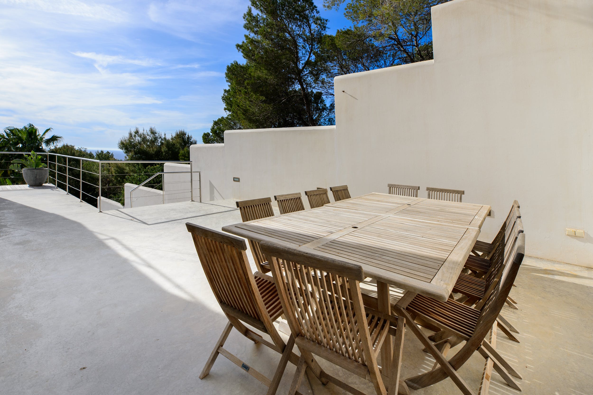 Beyond the terrace, the forested hillsides make way for the glittering blue Mediterranean sea, a blue horizon of Ibizan promise.