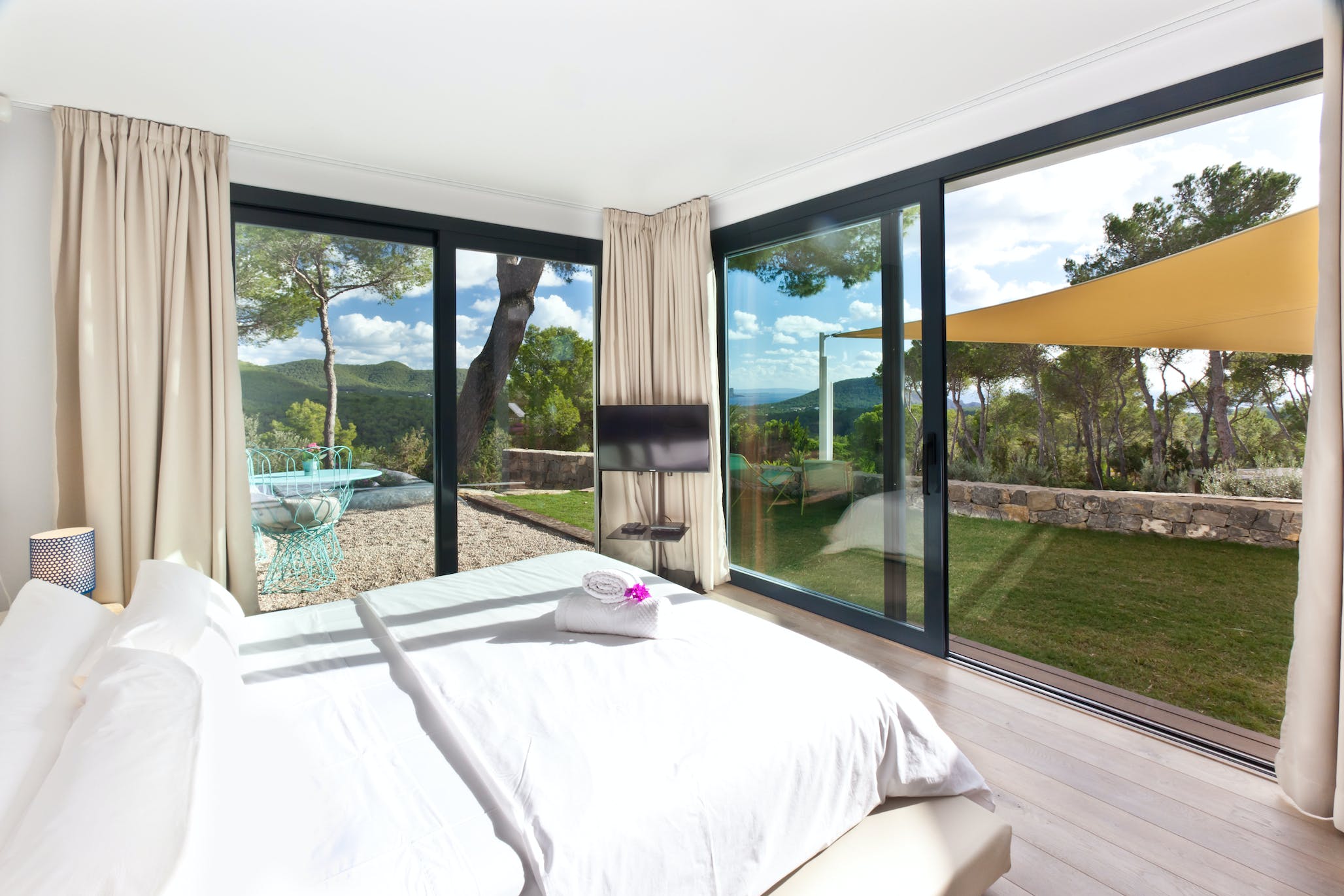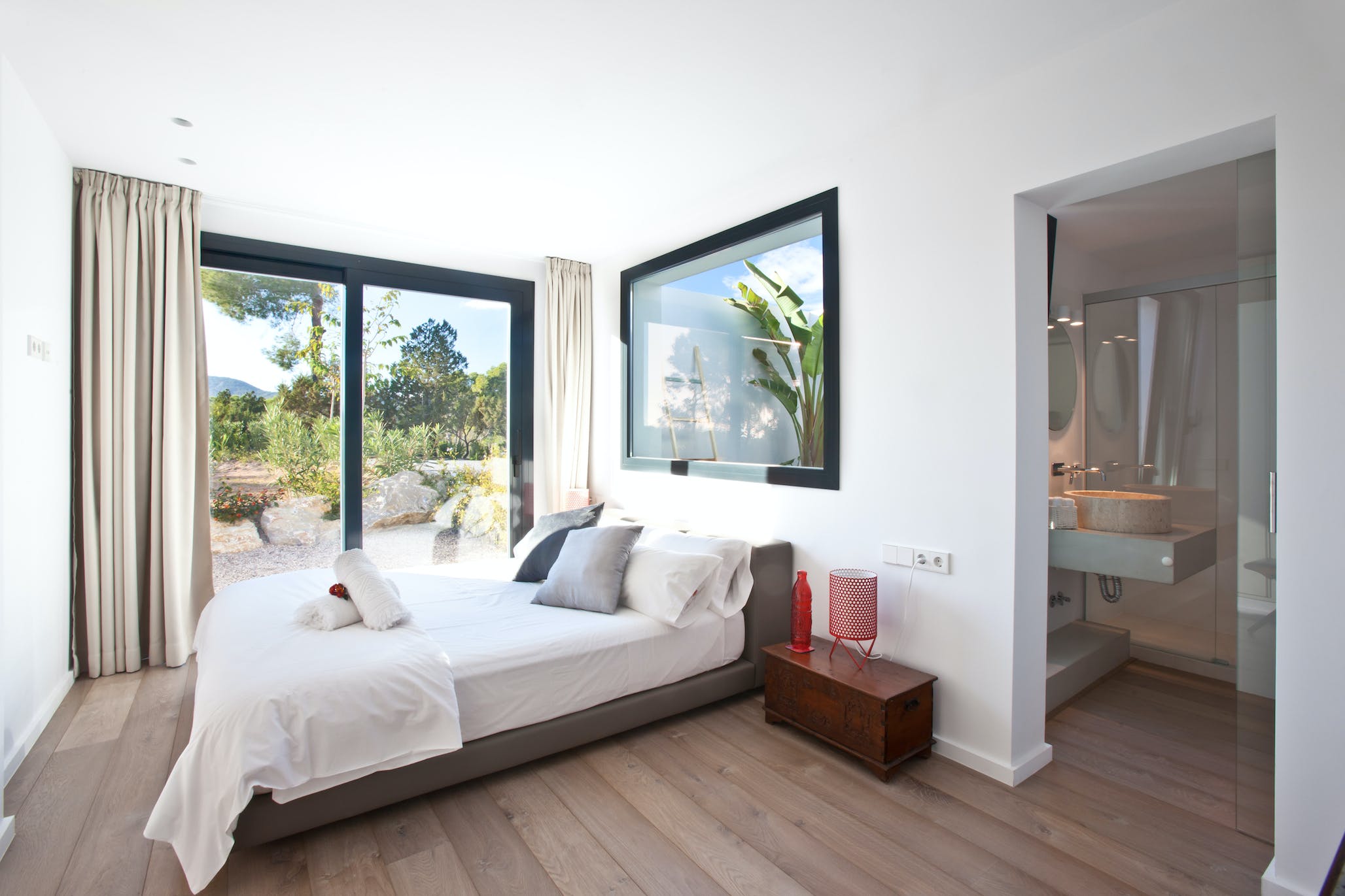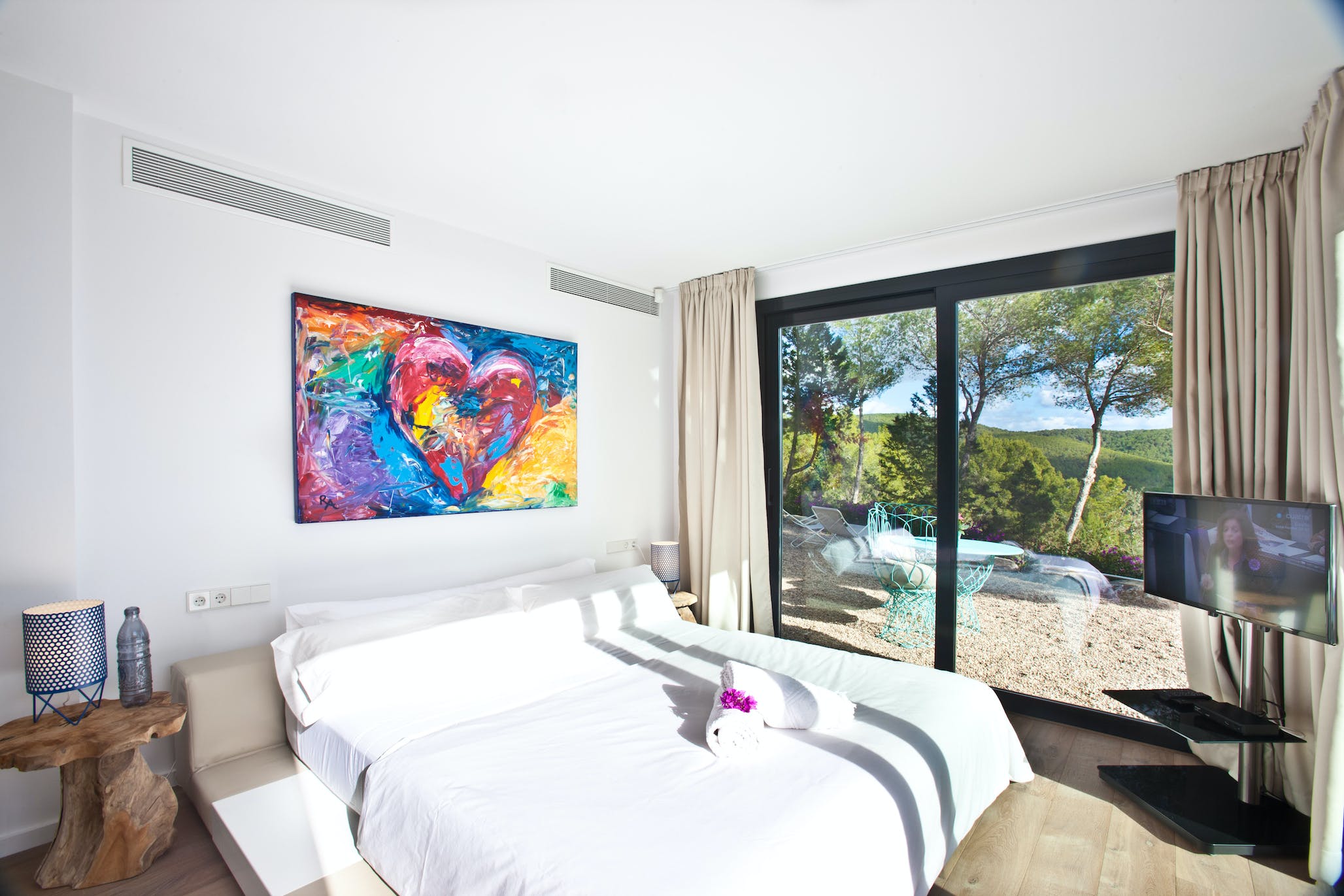 Super king size bed, air conditioning, TV, sea views, access to the garden and pool. En-suite bathroom with shower.