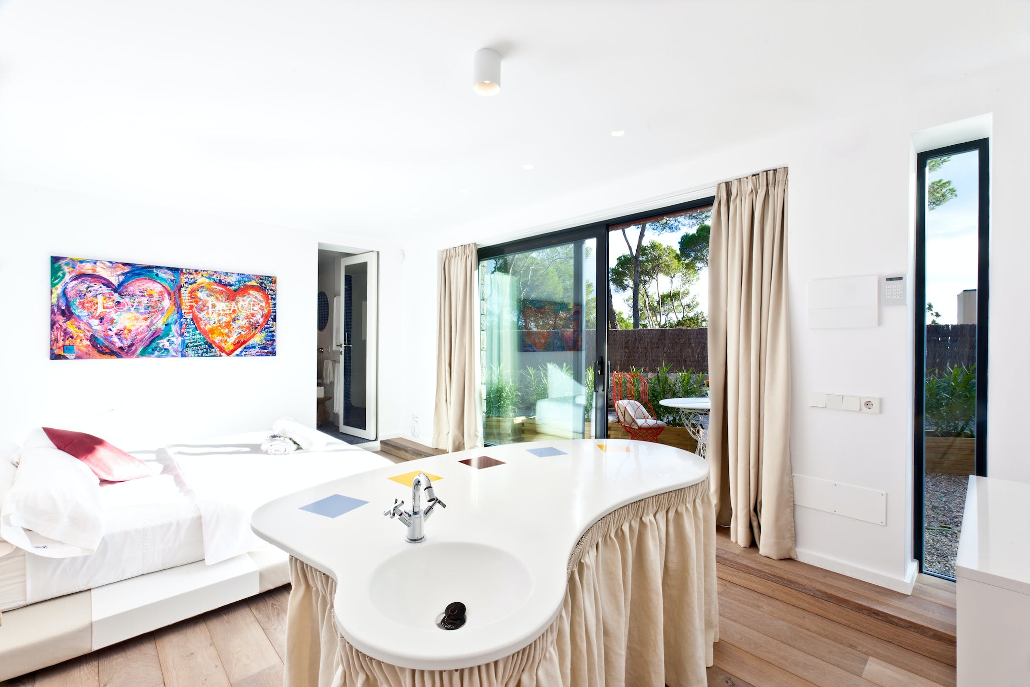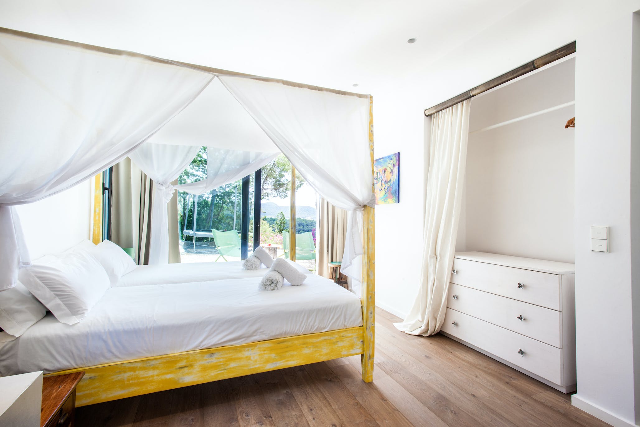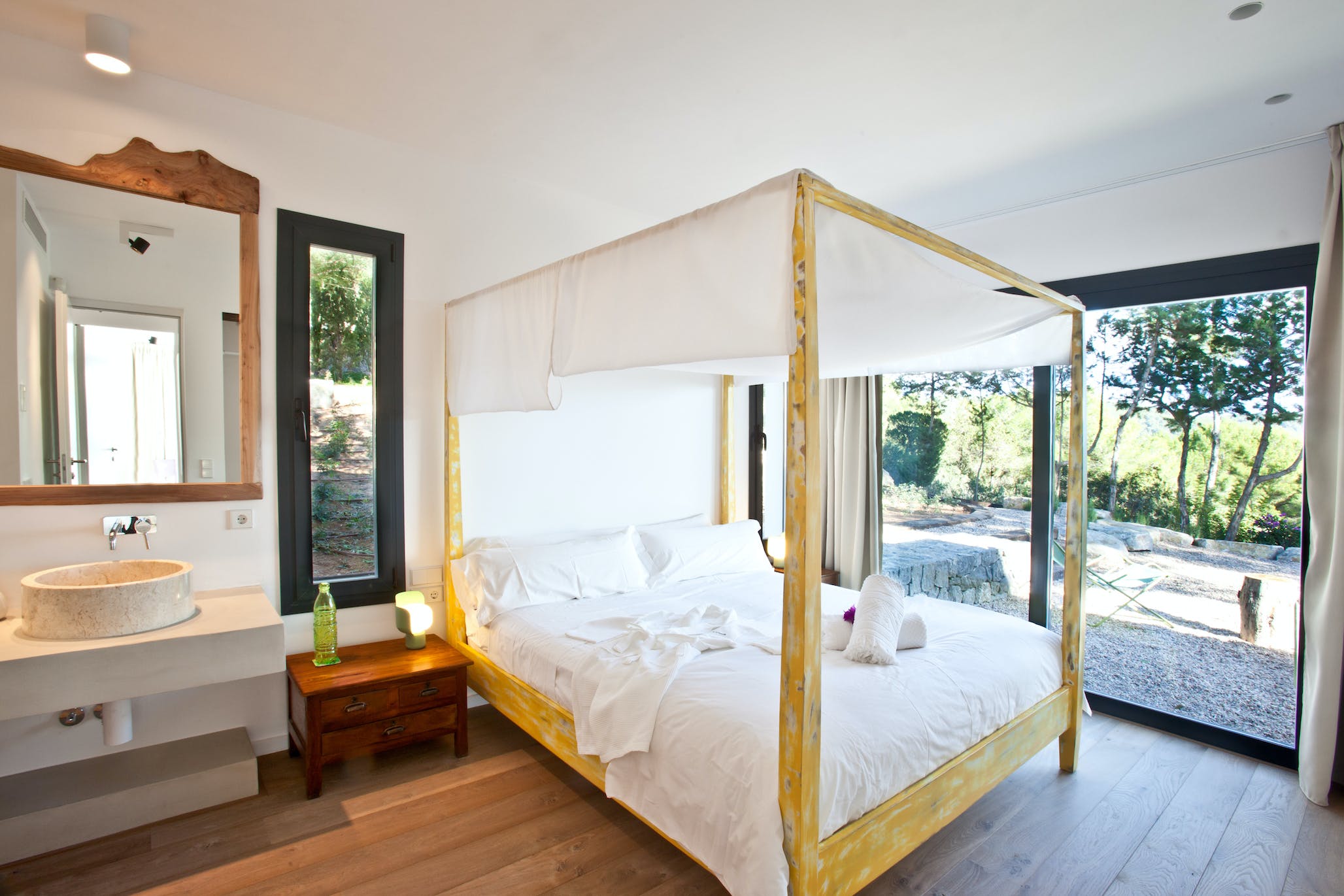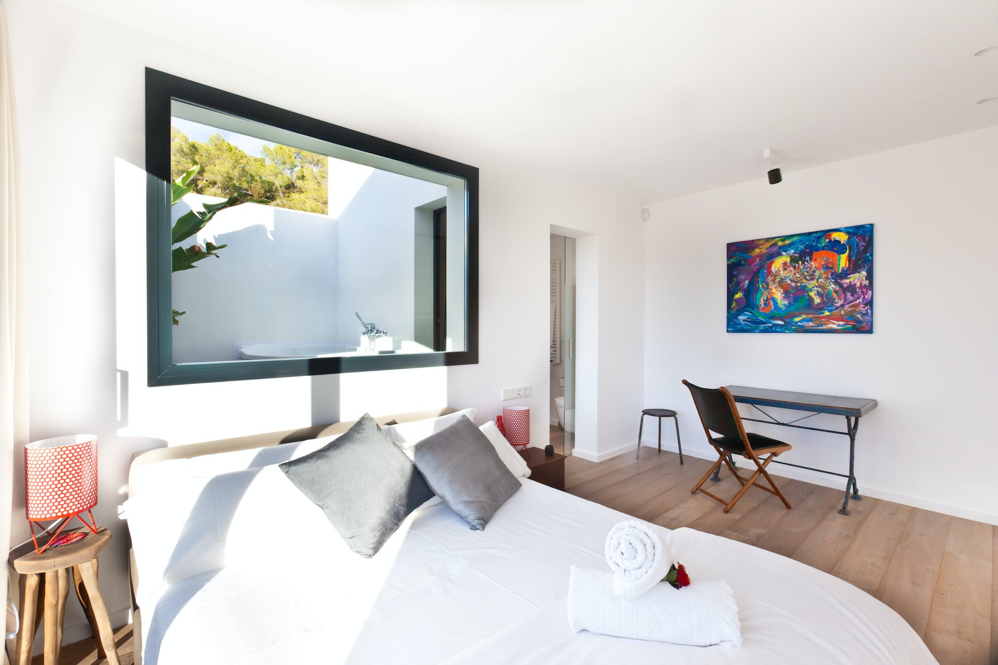 Super king size bed, air conditioning, TV, sea views, access to the garden and pool. En-suite bathroom with shower.