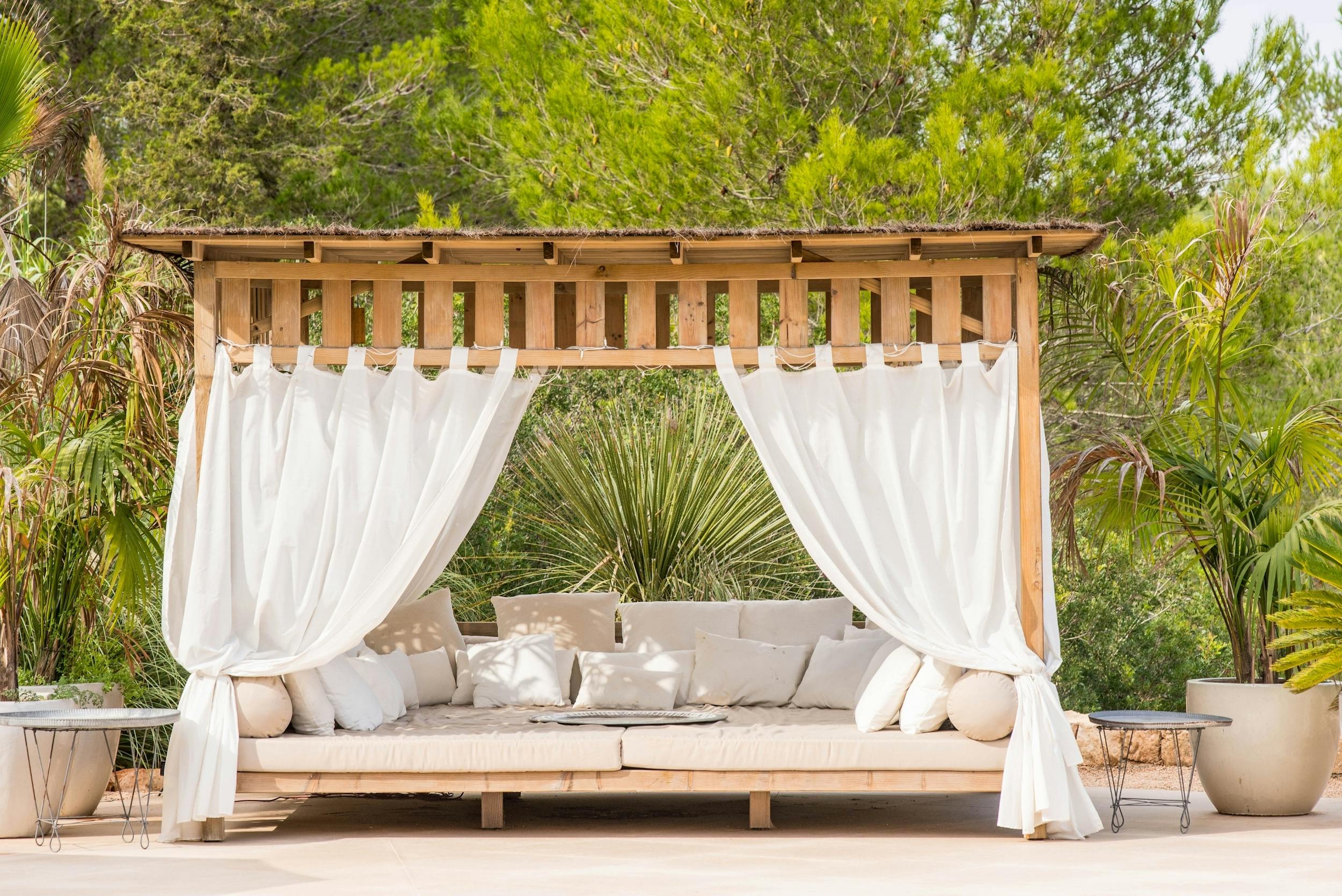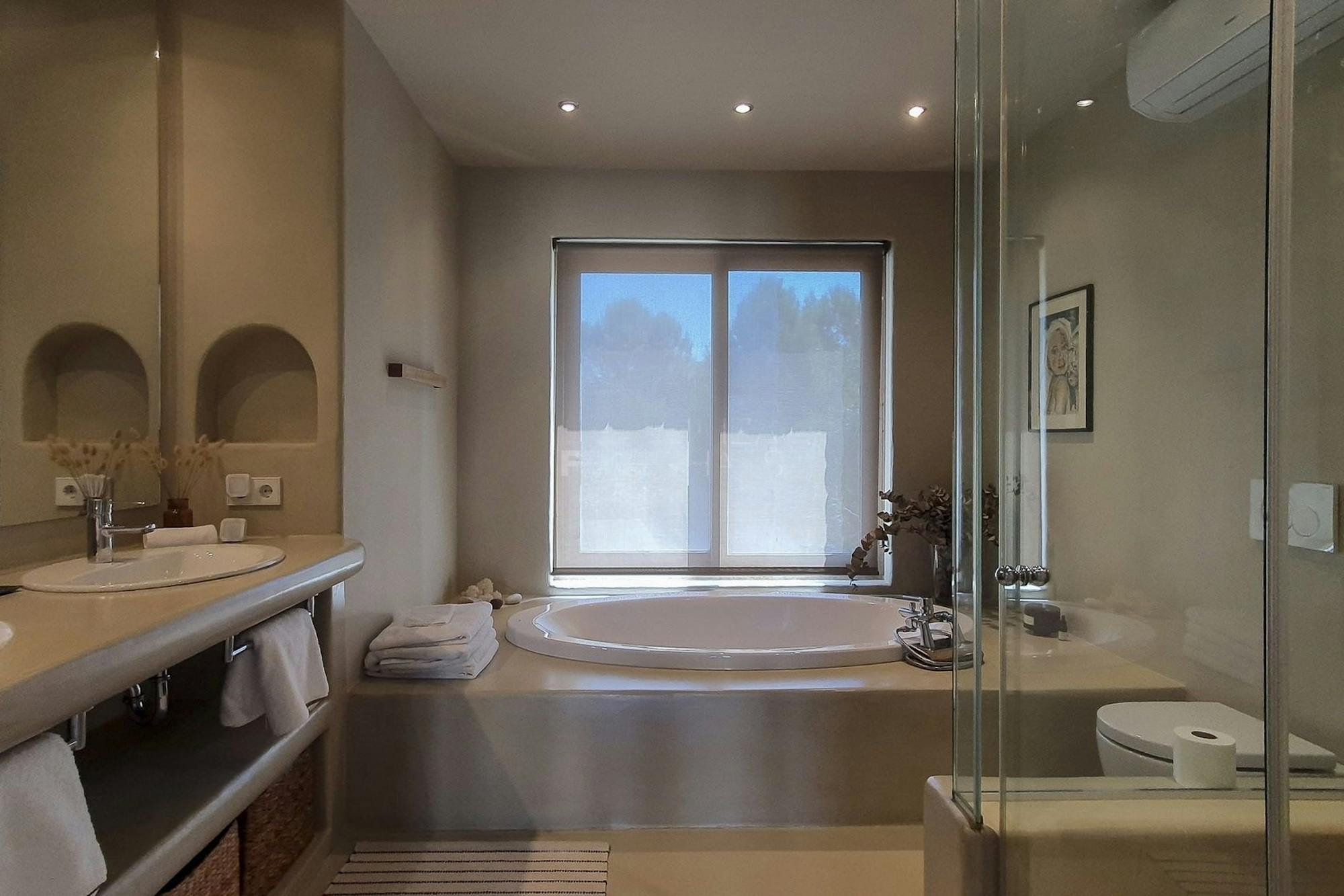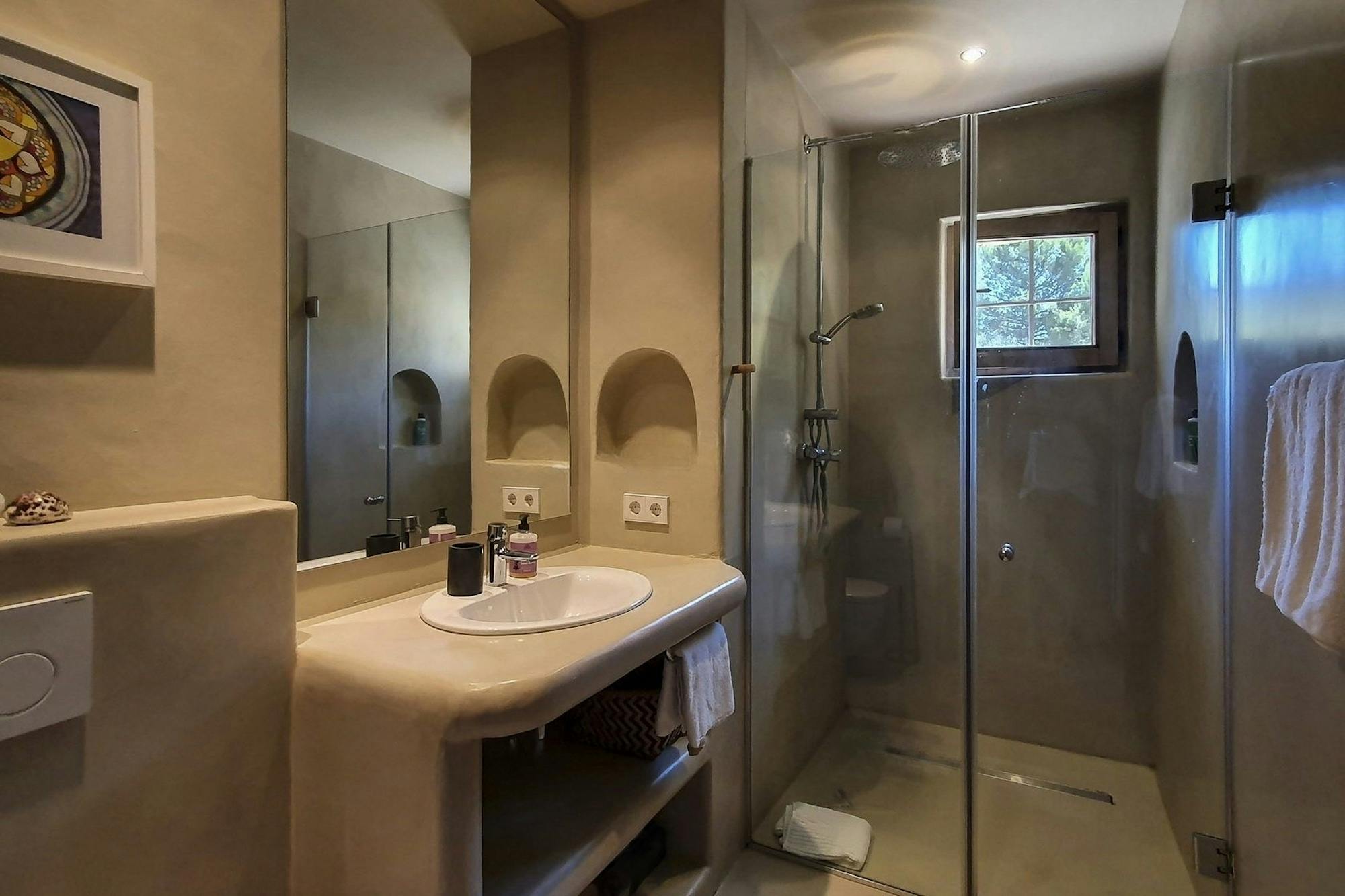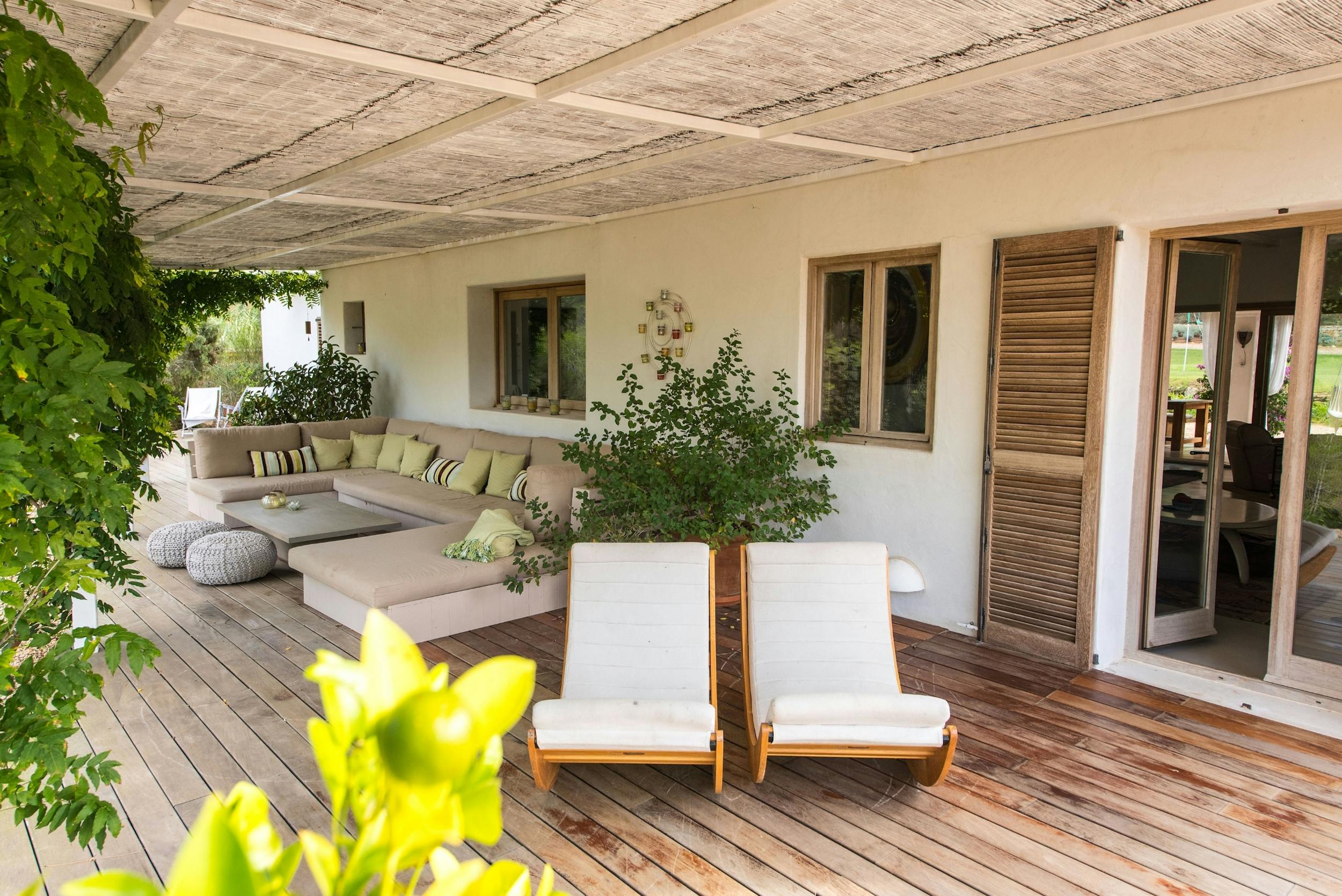 This countryside residence is hidden away in woodland, about 20 minutes (drive) from Ibiza Town. The villages of Santa Eulalia and Santa Gertrudis are a 10-minute drive away from the villa, via winding caminos.