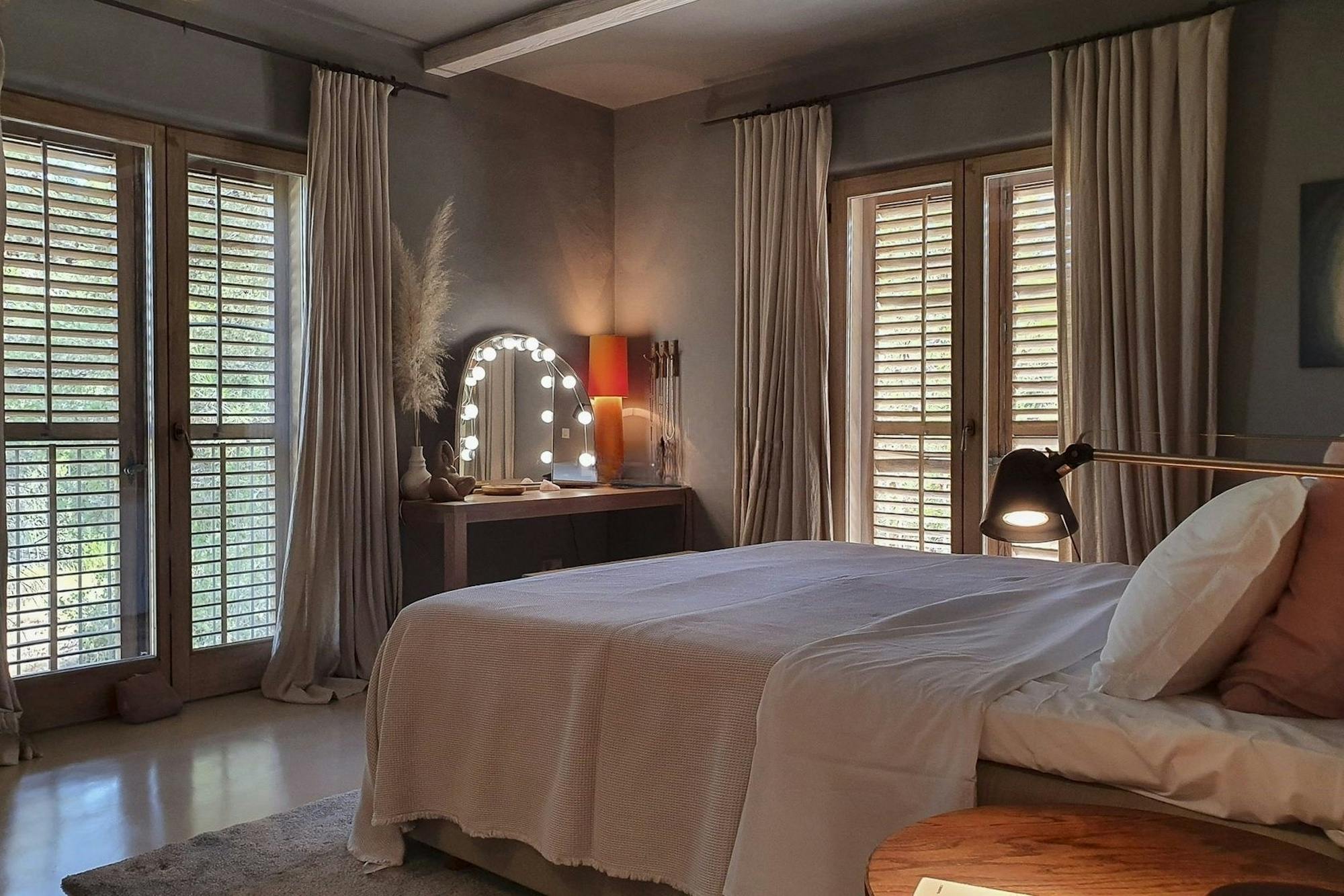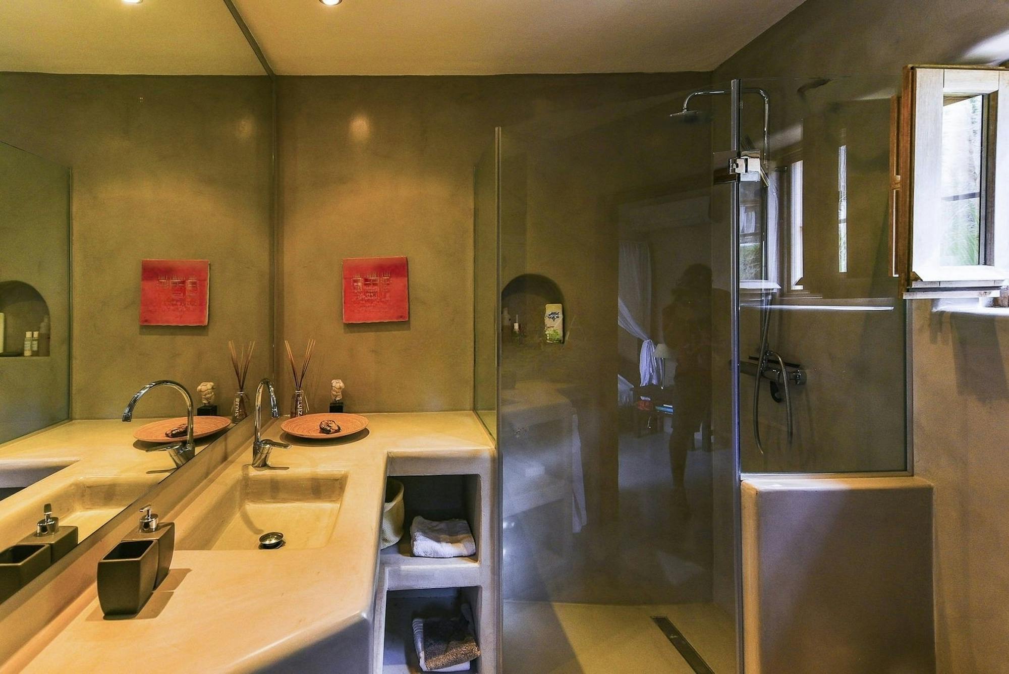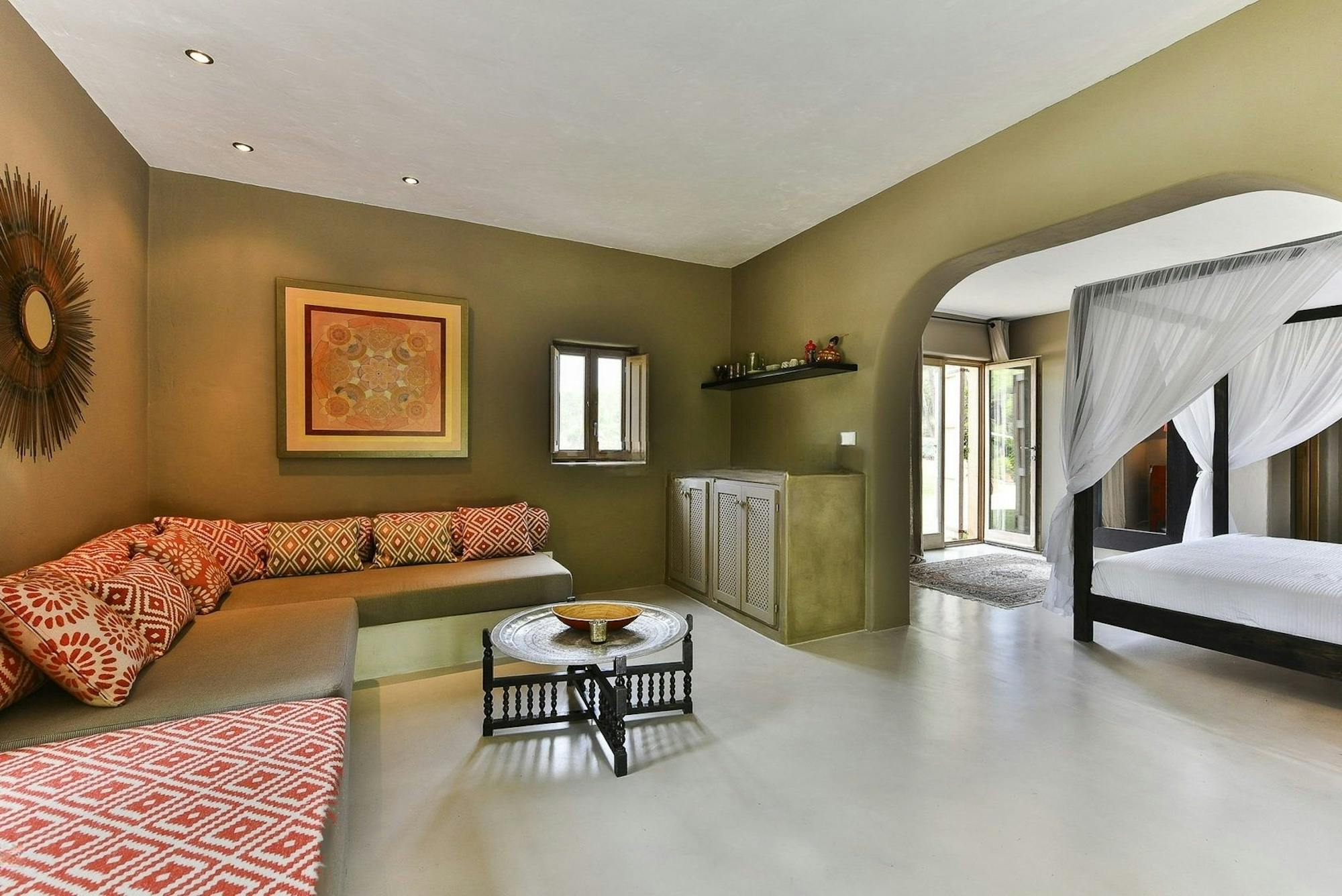 Guest House – Accessed from the garden with private entrance and opens onto a covered terrace seating area; inside there’s a king size 4-poster bed, a lounge area with Berber-inspired seating, coffee-making facilities, and an en-suite bathroom with shower.