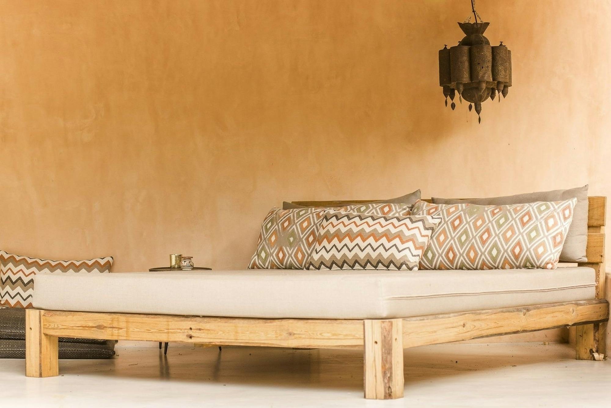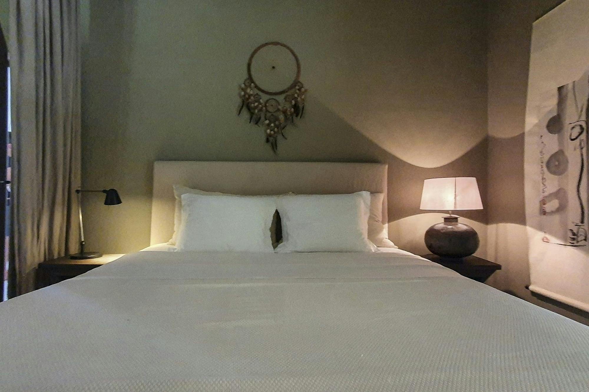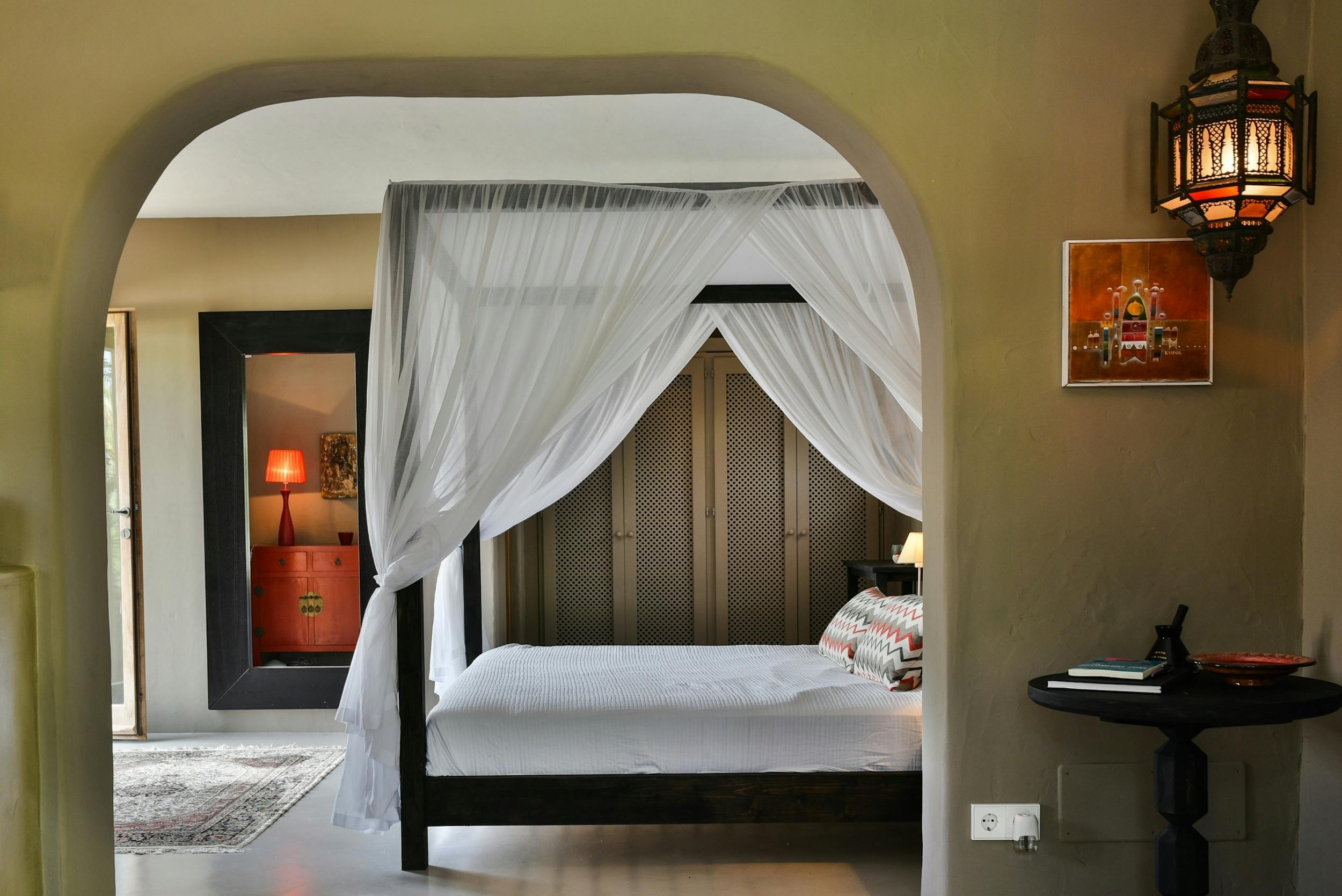 Guest House – Accessed from the garden with private entrance and opens onto a covered terrace seating area; inside there’s a king size 4-poster bed, a lounge area with Berber-inspired seating, coffee-making facilities, and an en-suite bathroom with shower.