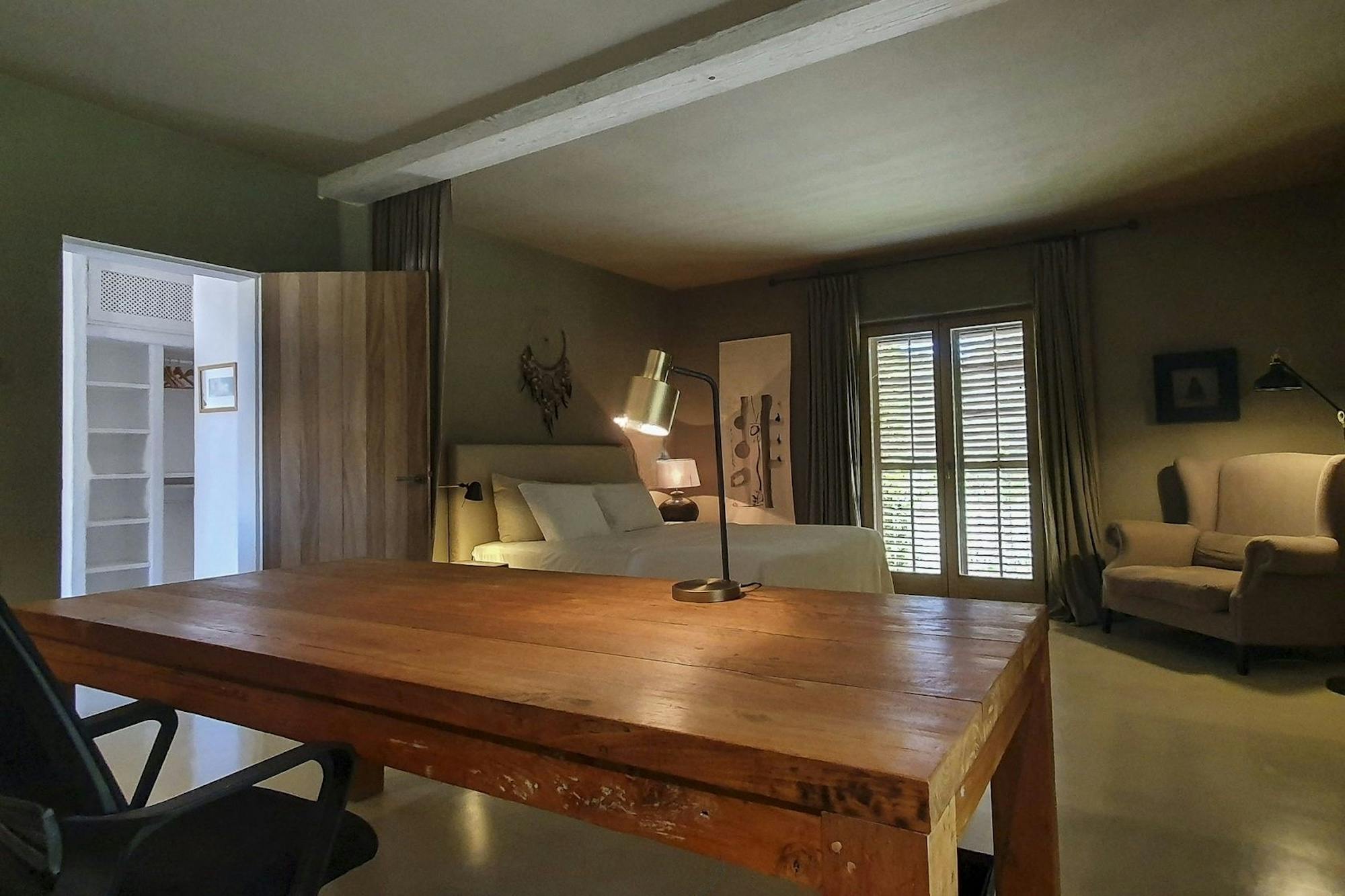 Minimalist and modern, with original stone walls and beamed ceilings, this relaxing stay is decorated in eggshell white hues and nature-inspired details, including live-edged wood furniture. The open-plan living room has a large built-in corner sofa with dove-grey cushions, a flatscreen TV, working fireplace, leather armchairs and large sliding glass doors that open onto an outdoor lounge and dining terrace, featuring inviting sofas and a rustic wooden dining table that seats up to 10 guests.