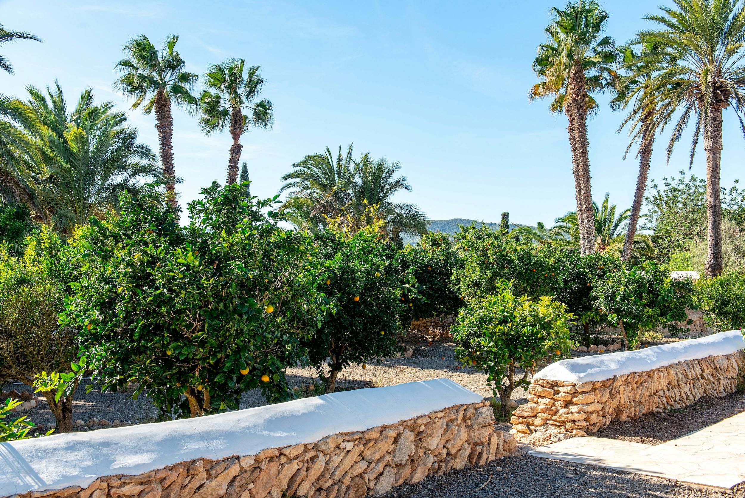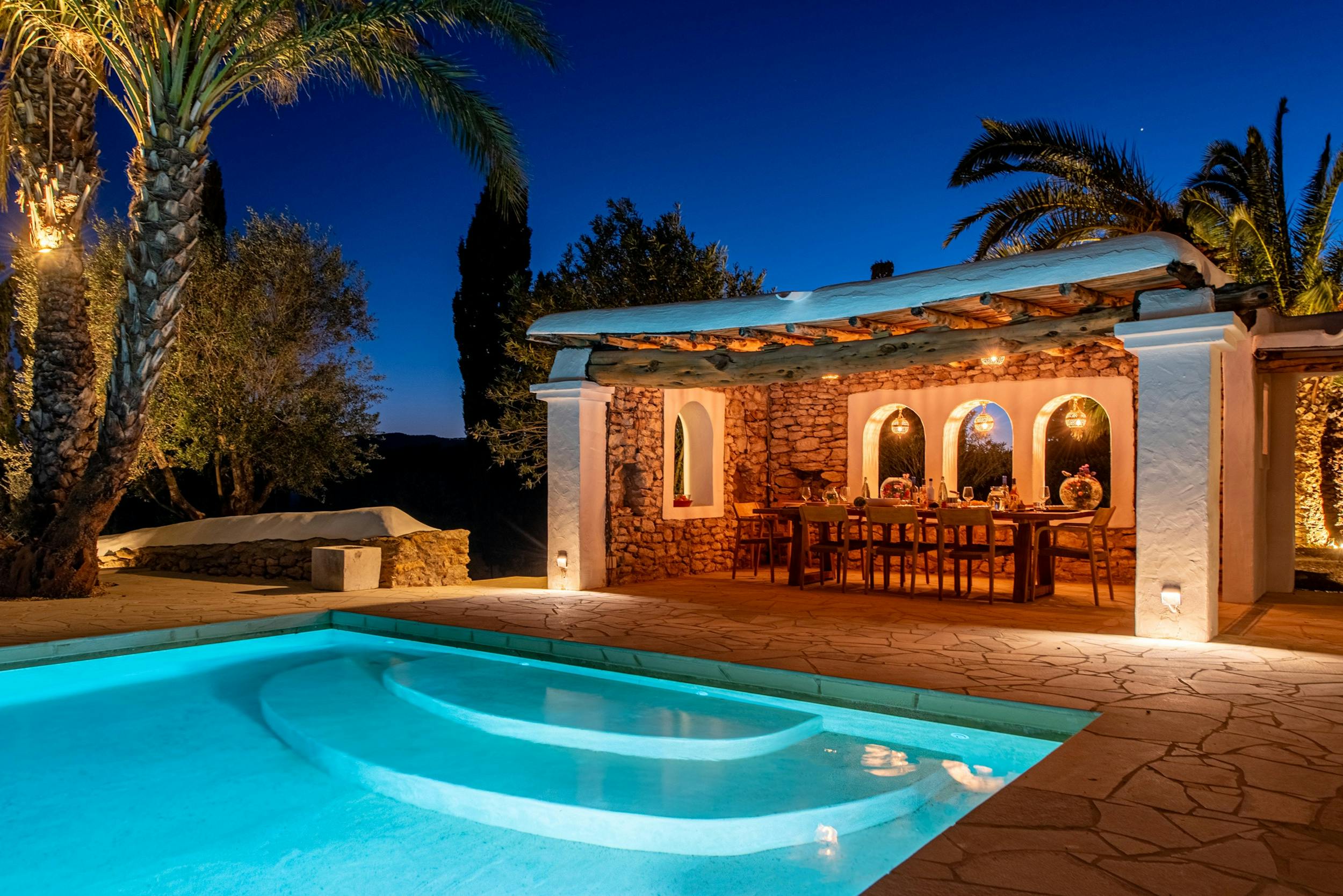 The generously sized pool (16m x 6m), equipped with a saltwater system for skin and hair-friendly enjoyment, is a striking feature of the property. Nestled amidst a charming orchard of citrus, olive trees, and palms, the lavish pool area offers shaded outdoor dining, a spacious terrace with eight sun loungers for relaxation, and a daybed positioned at the pool’s end, providing a perfect vantage point for admiring the sunset skies. Abundant foliage ensures privacy across the expansive 8000m² plot, offering cool respite on warm summer days.