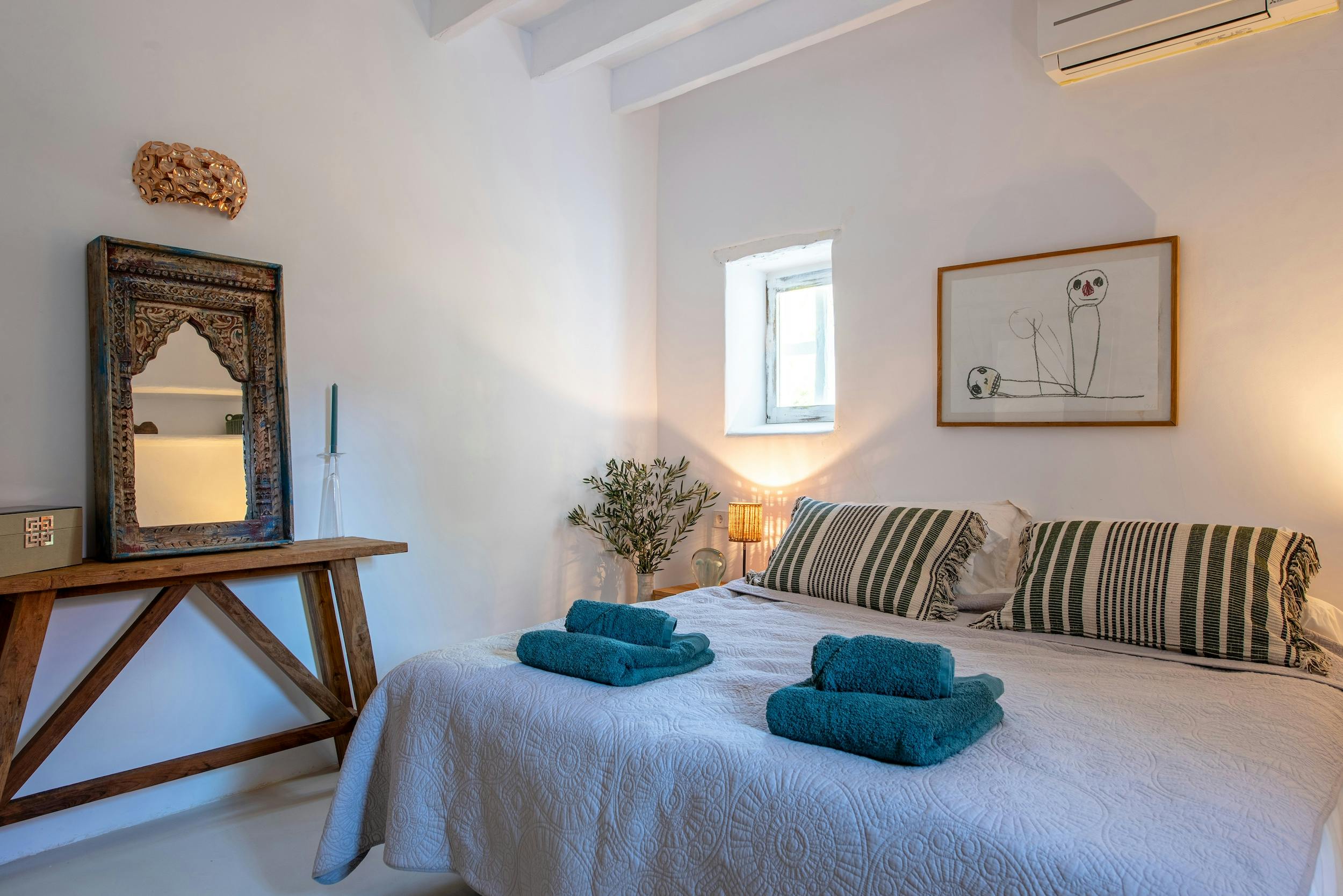 Upper Floor – Superking size bed, en-suite bathroom, air-conditioning, walk-in wardrobe / dressing room, living area and balcony.