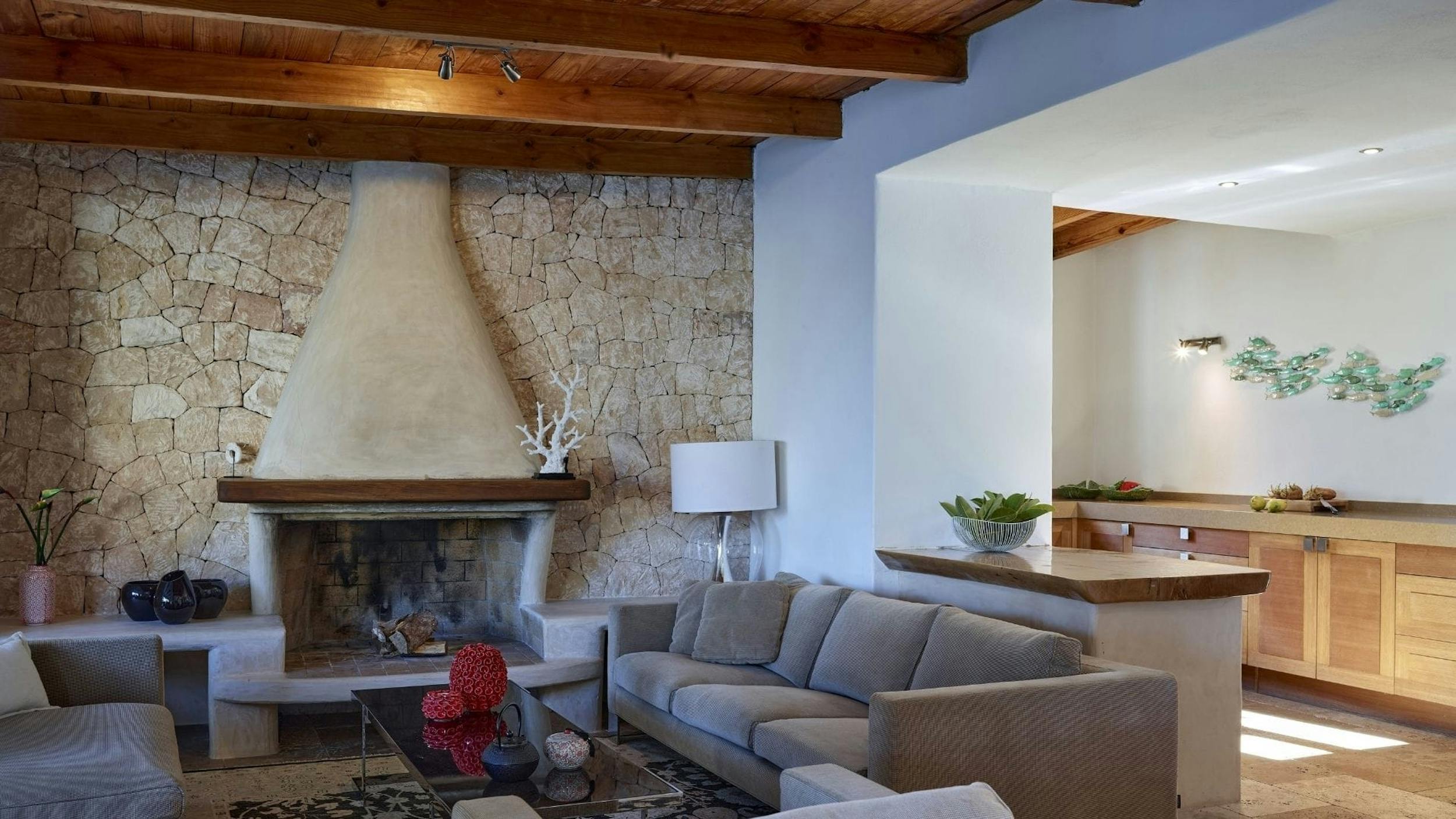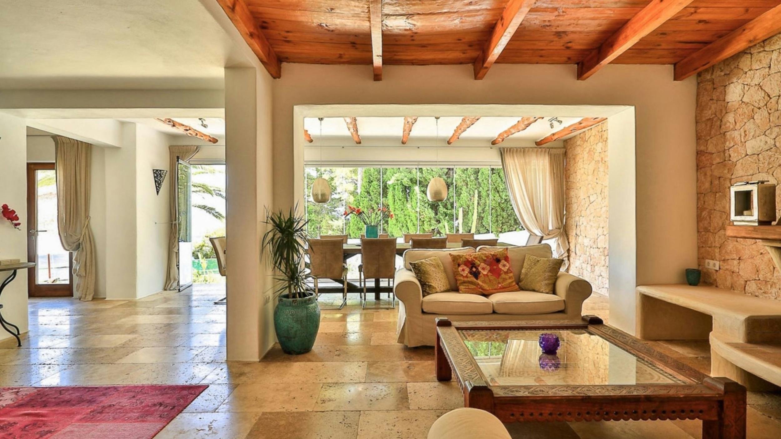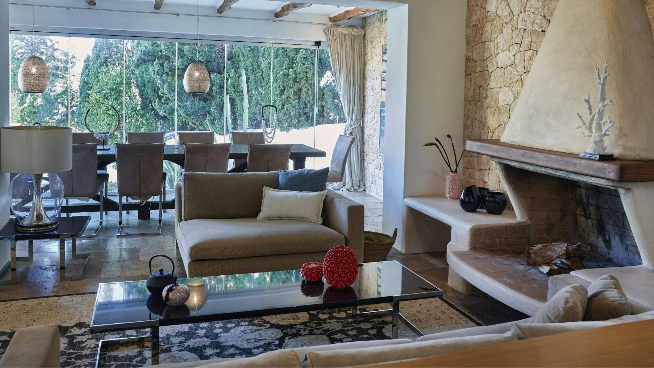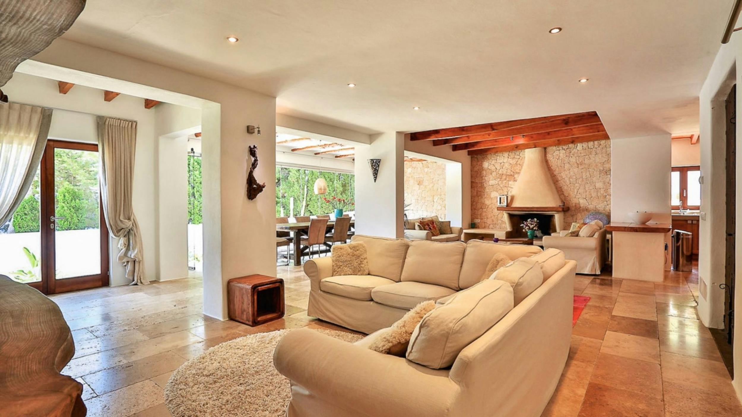 The interiors of Can Sol are an artful blend of typical Ibicencan architecture and modern comforts. Natural materials, exposed stone walls, and neutral tones create a sophisticated rustic style.