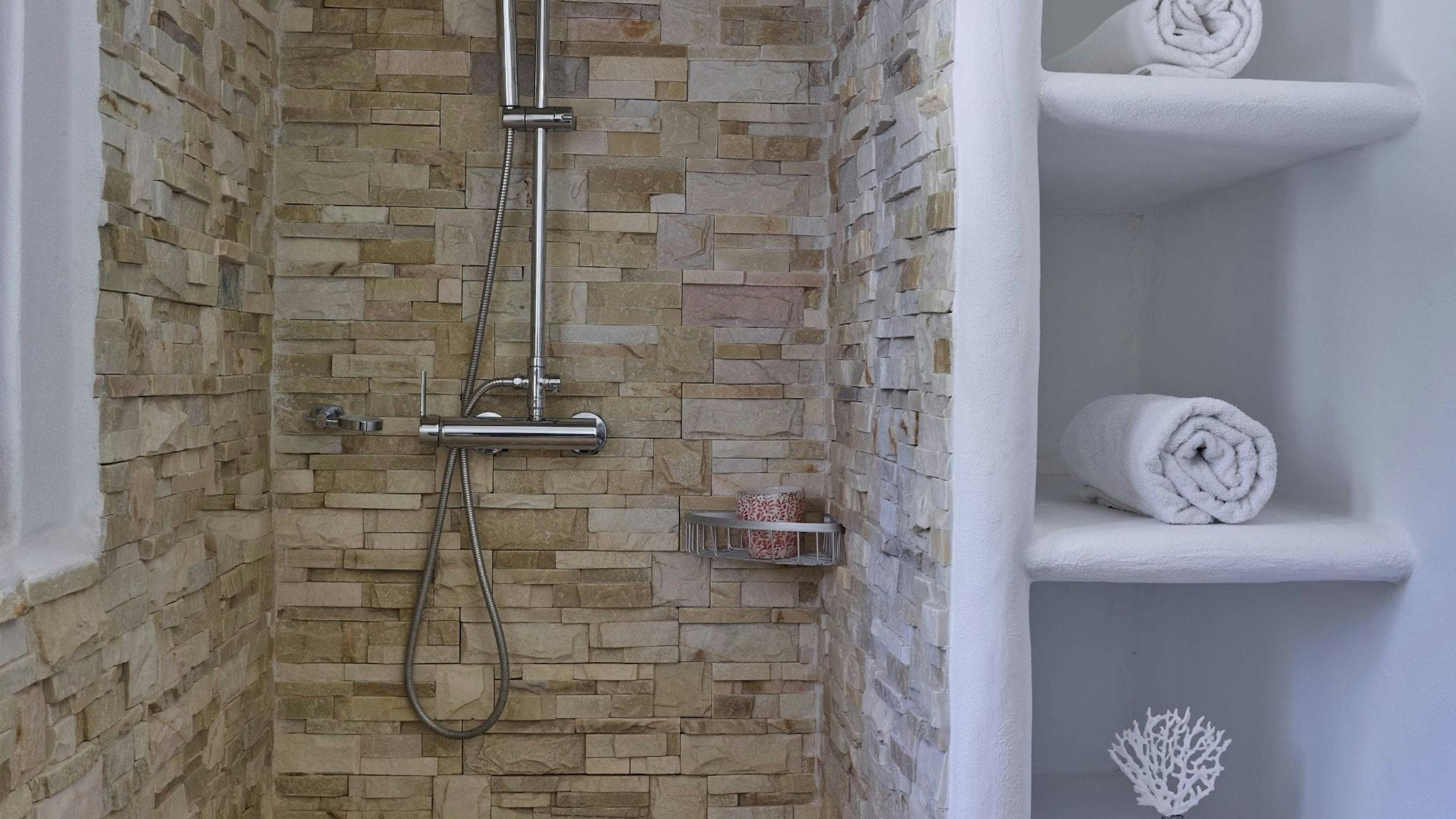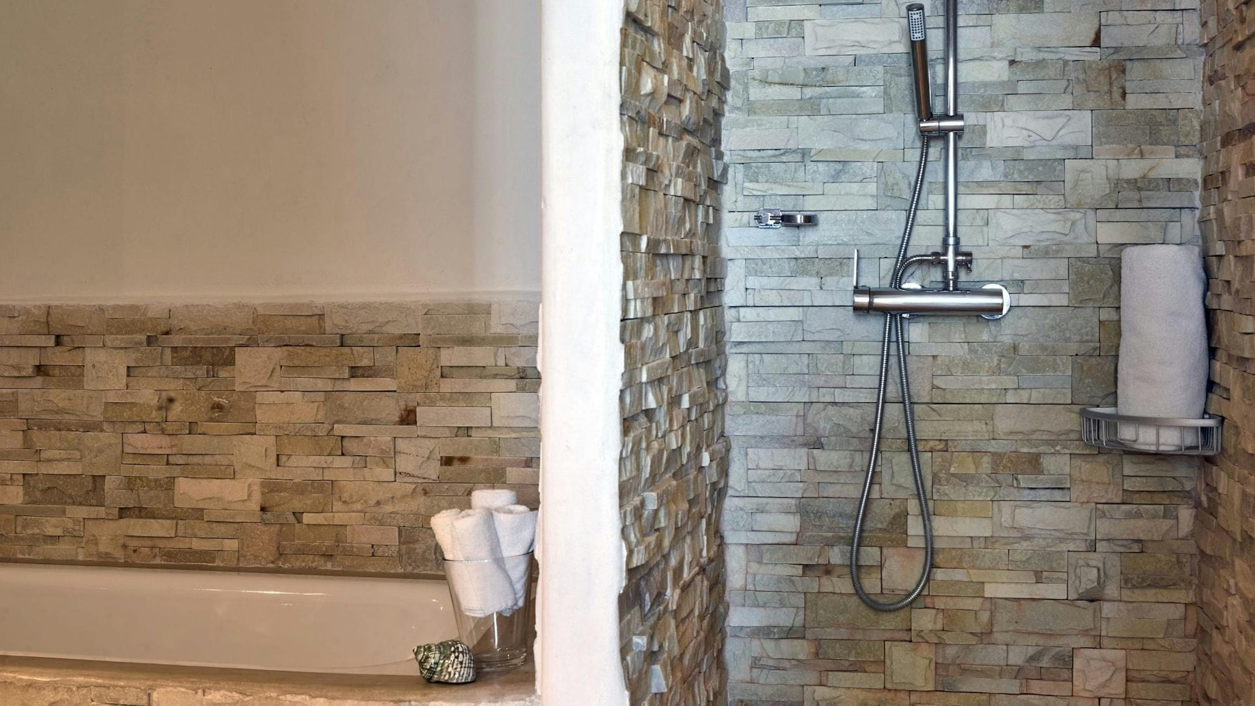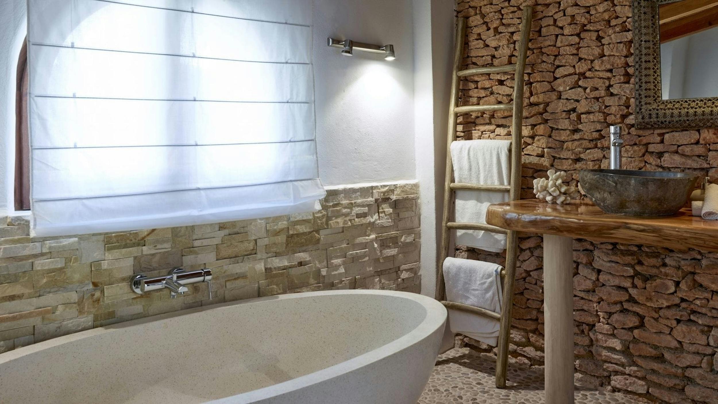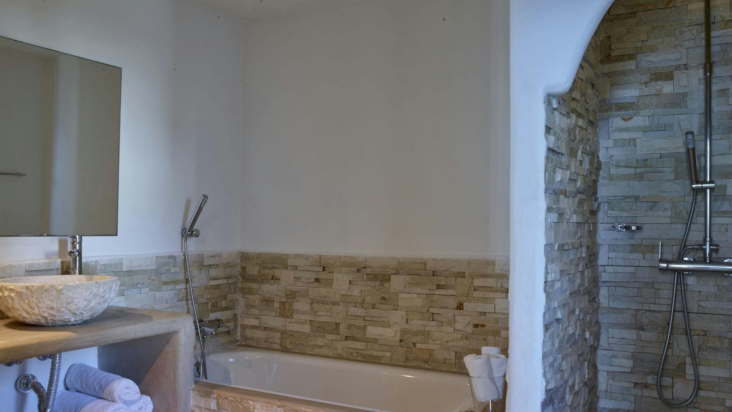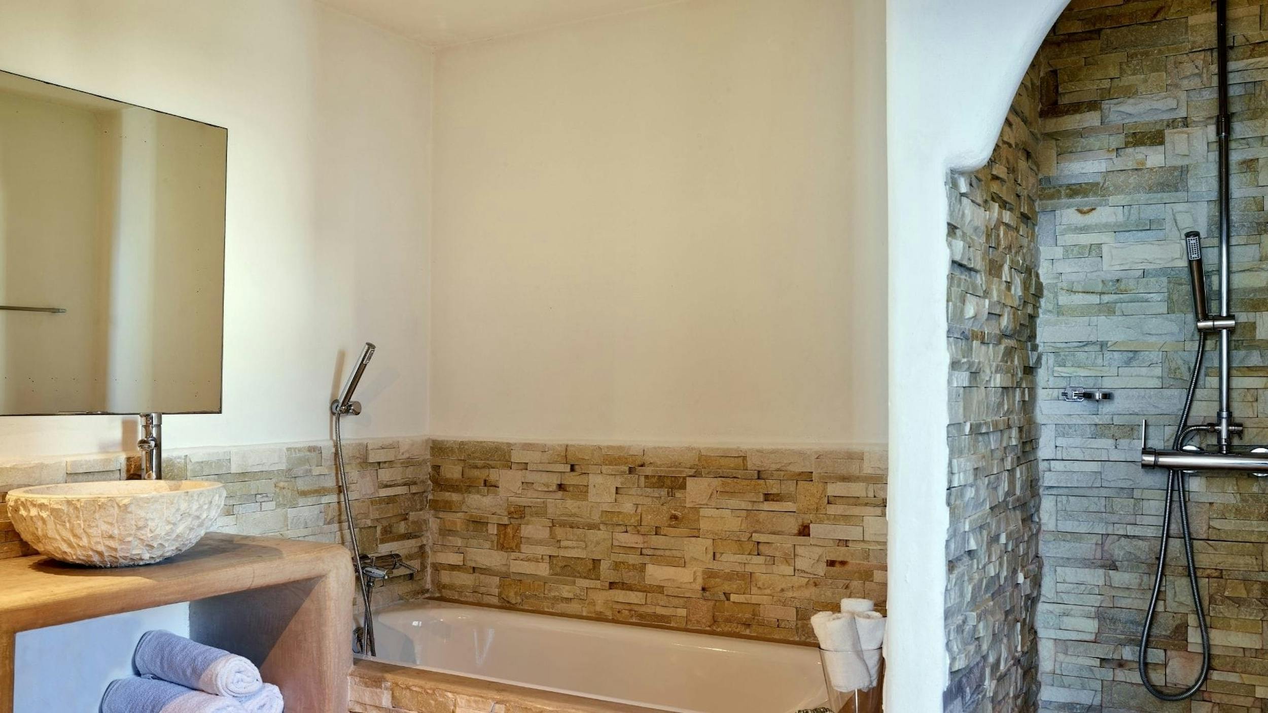 King Size bed, with a huge en-suite bathroom featuring a free standing bath, a walk in shower and beautifully restored stone walls and stone double washbasins. The bedroom benefits from a walk in wardrobe, air conditioning and a breathtaking sea view.