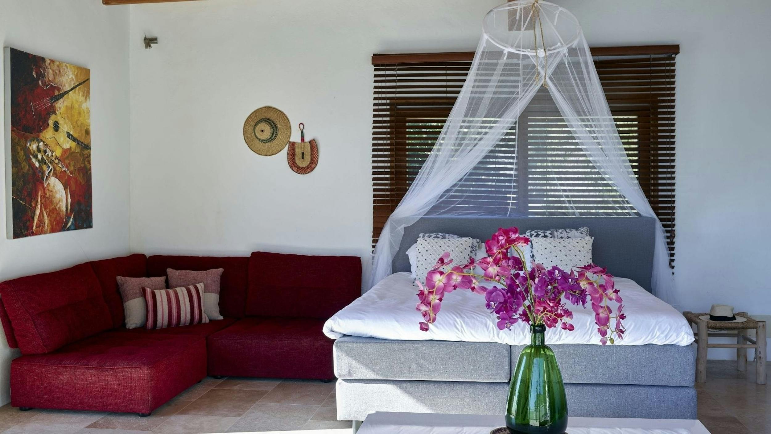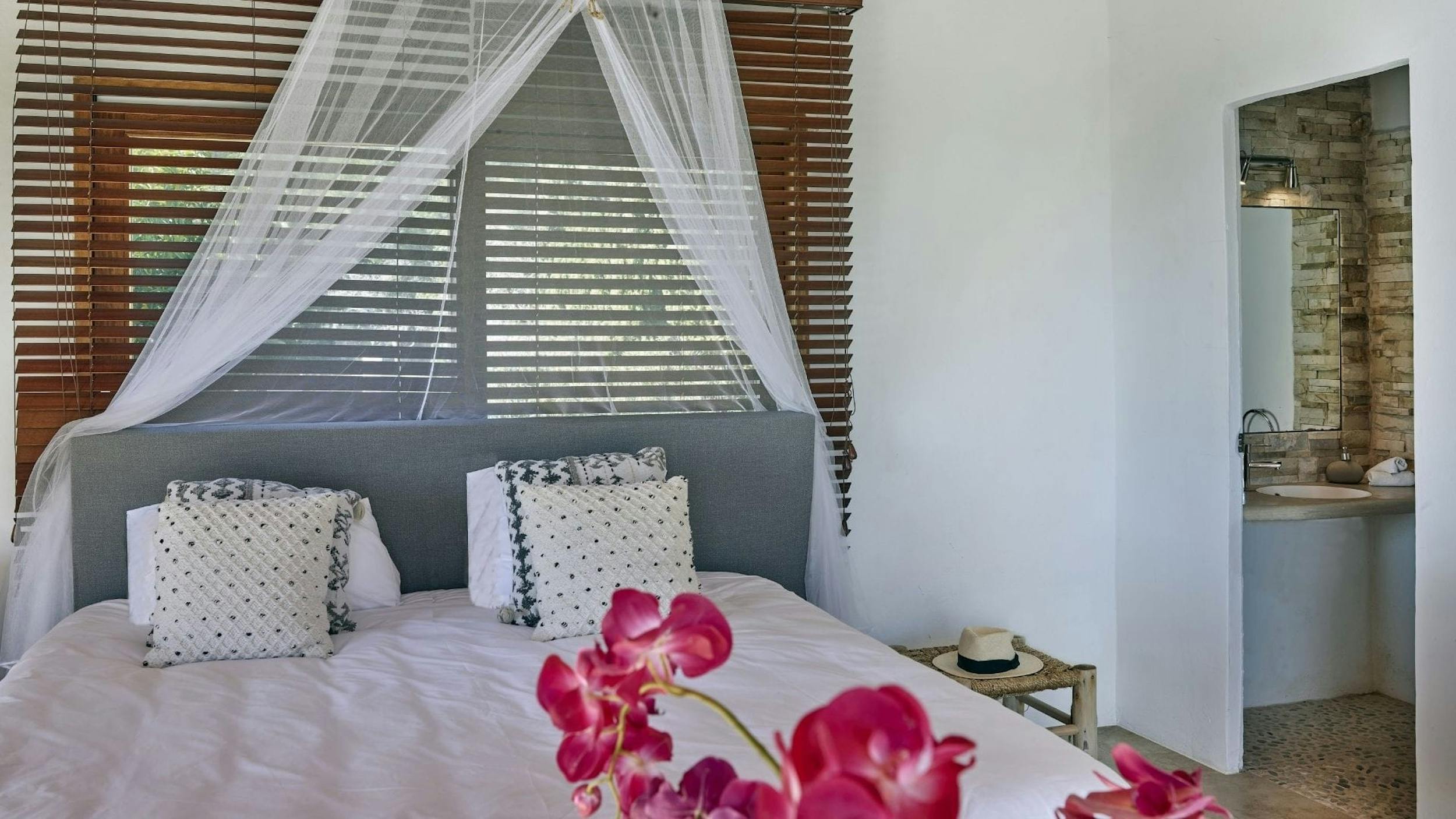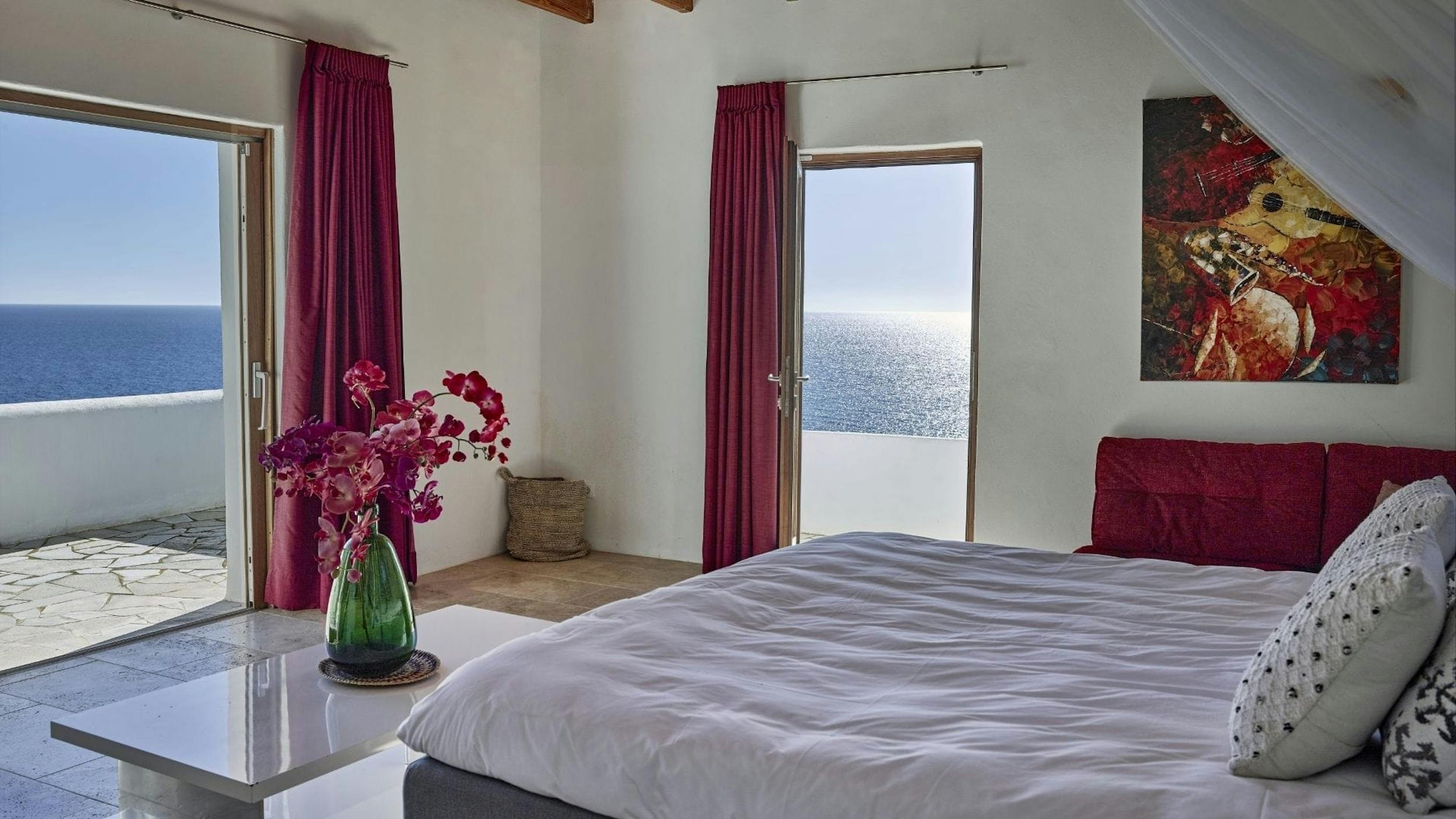 Guest apartment – Nestled apart from the main residence, this cozy guest apartment offers a secluded haven with its own exclusive sun terrace, perfect for those desiring extra privacy. Complete with an en-suite bathroom, ample storage, air conditioning, and a comfortable king size bed, this room ensures both comfort and convenience. Step through the doors onto the private terrace, where soaking in the breathtaking vista becomes an endlessly rejuvenating experience.