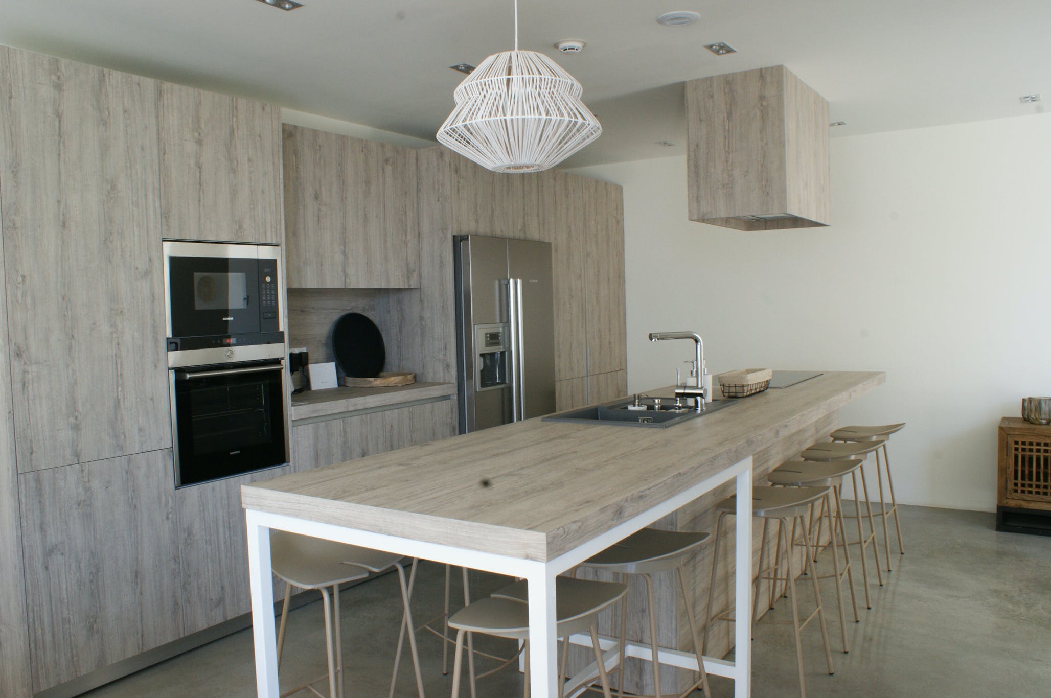 A sociable dining space, with table seating eight and barbeque, also sits alongside the pool, with sliding doors opening onto the interior, where a lounge area and well-equipped kitchen in light, natural wood create a charming entertaining space. All areas of the house are fully air-conditioned and have access to WiFi.