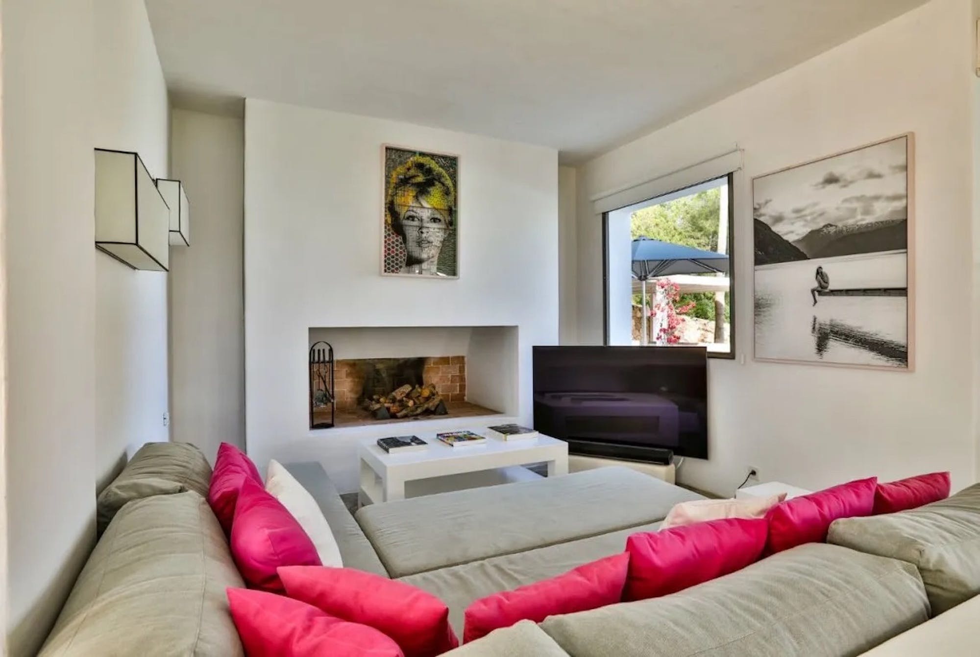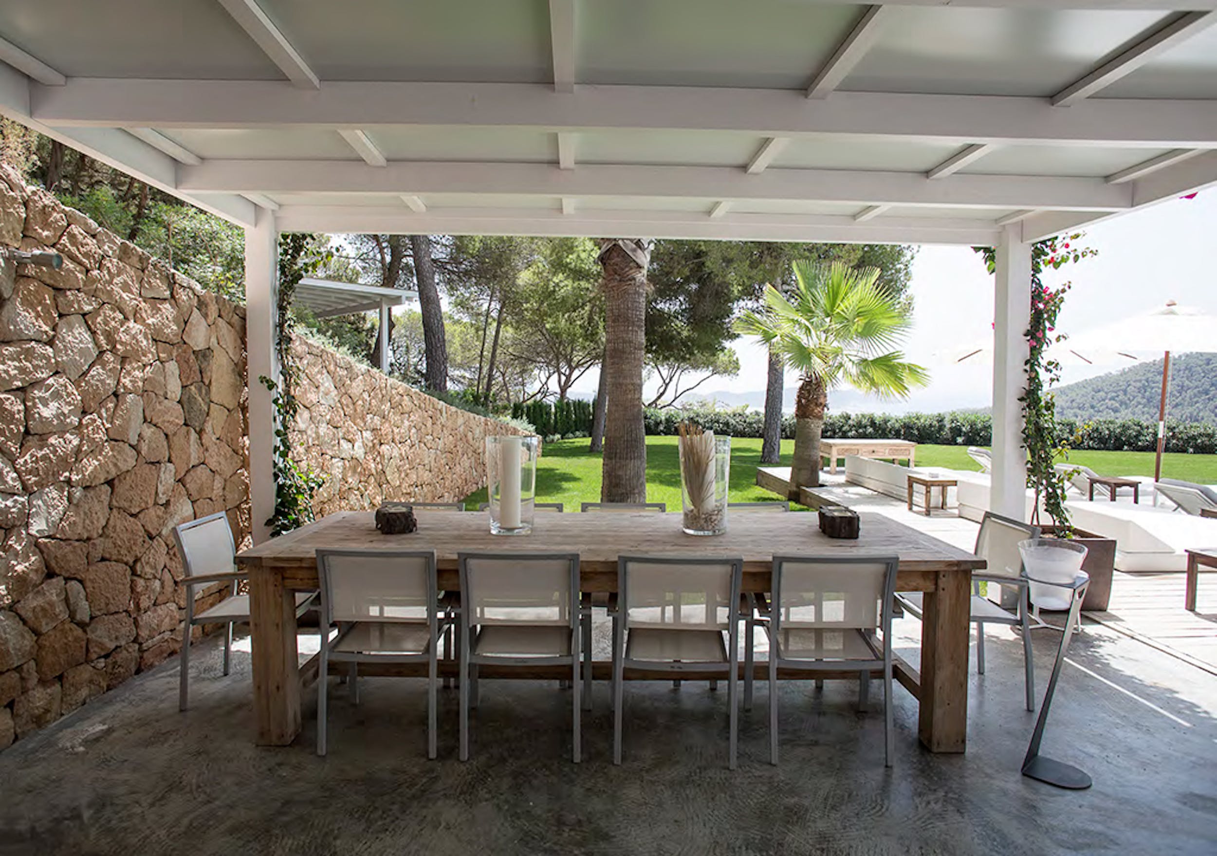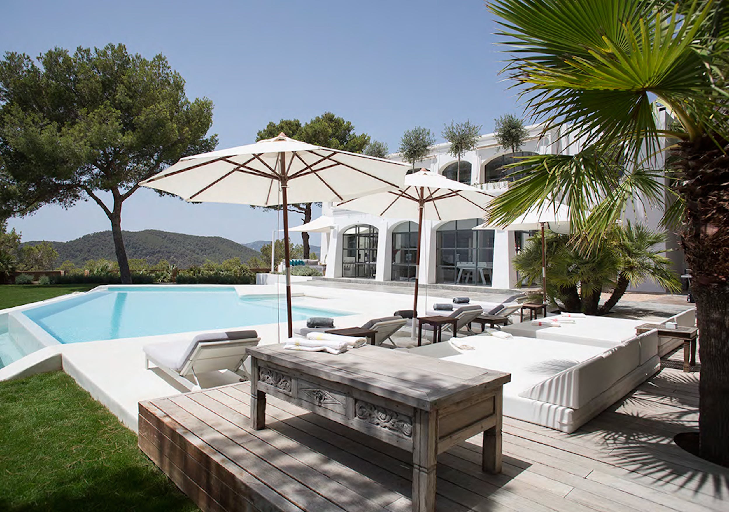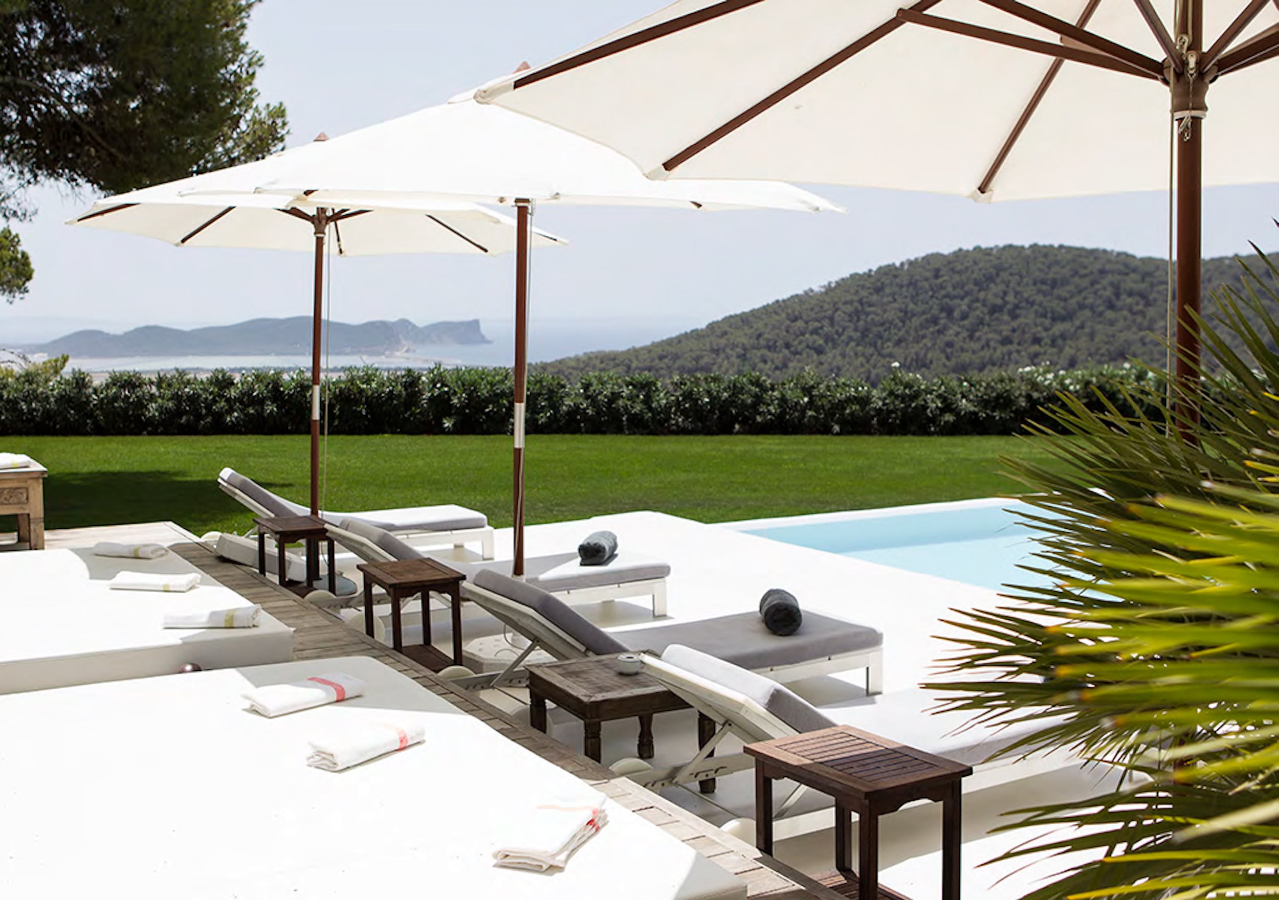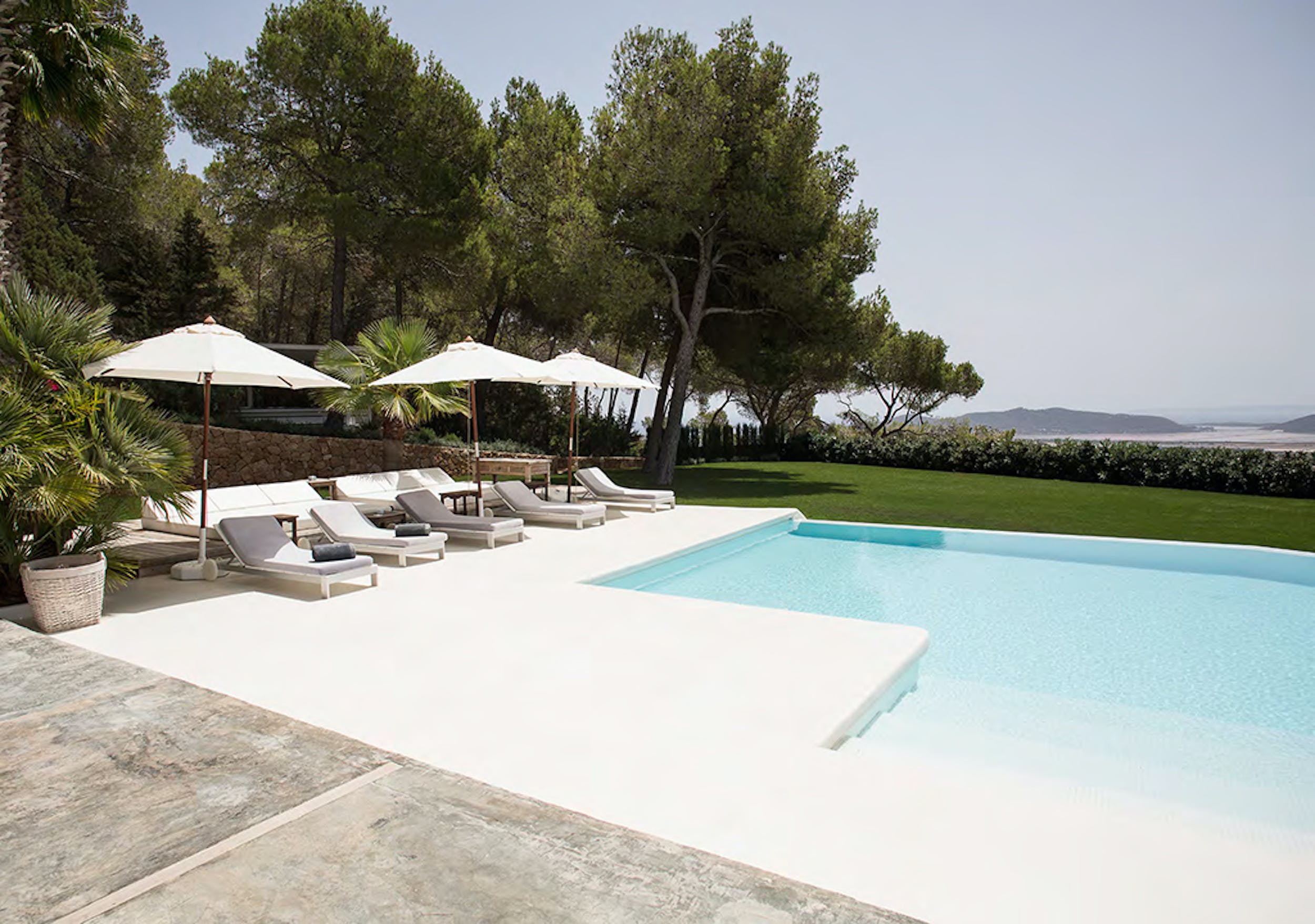 Outside features a beautiful large infinity pool (14m x 8m) and a luscious green lawn, where you can enjoy the sweeping views of the sea and Formentera in the back ground. By the pool there is a shaded poolside dining area which has a gas BBQ and seats 12 people. Single sun beds are available on the spacious terrace by the pool, and in shaded areas.
