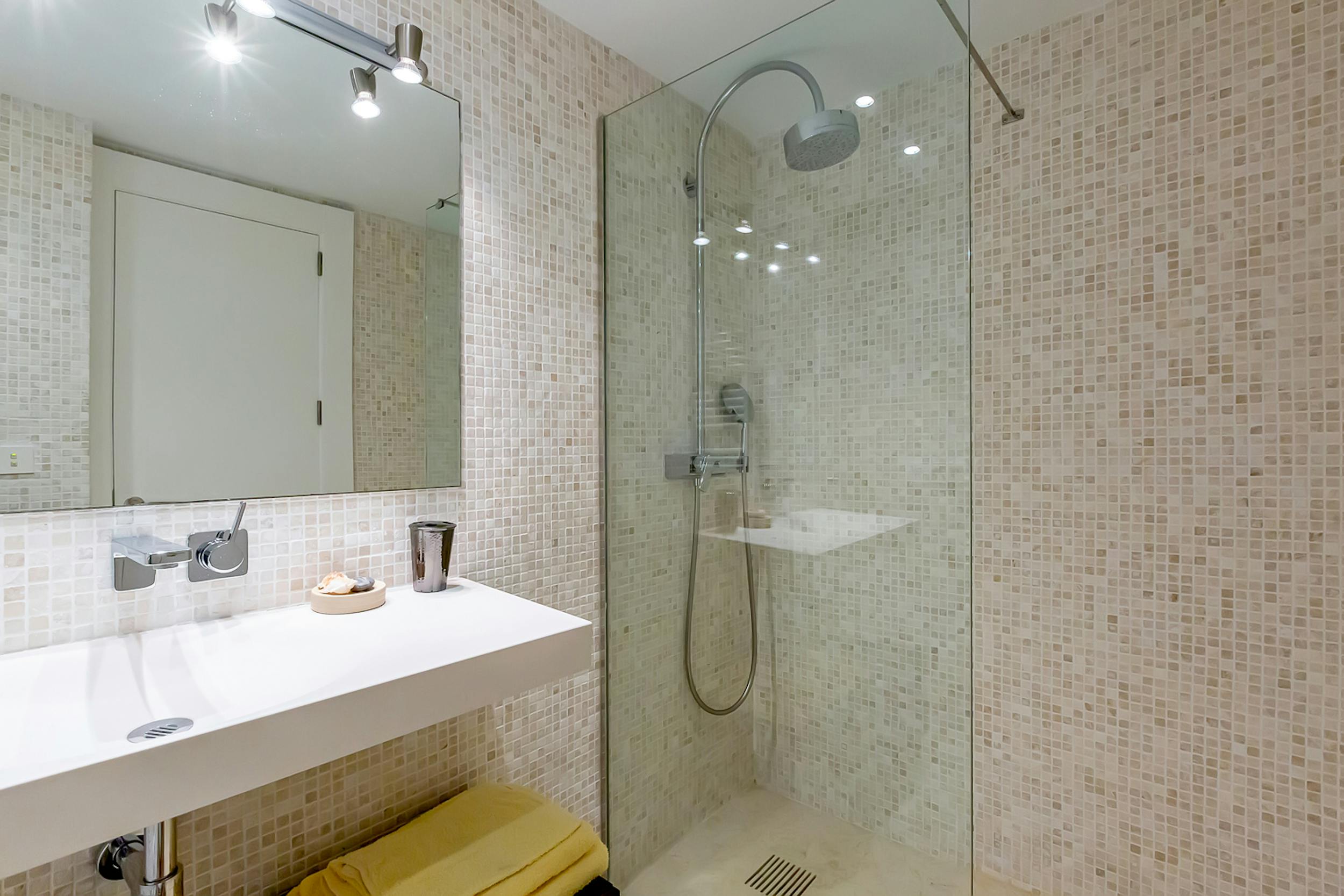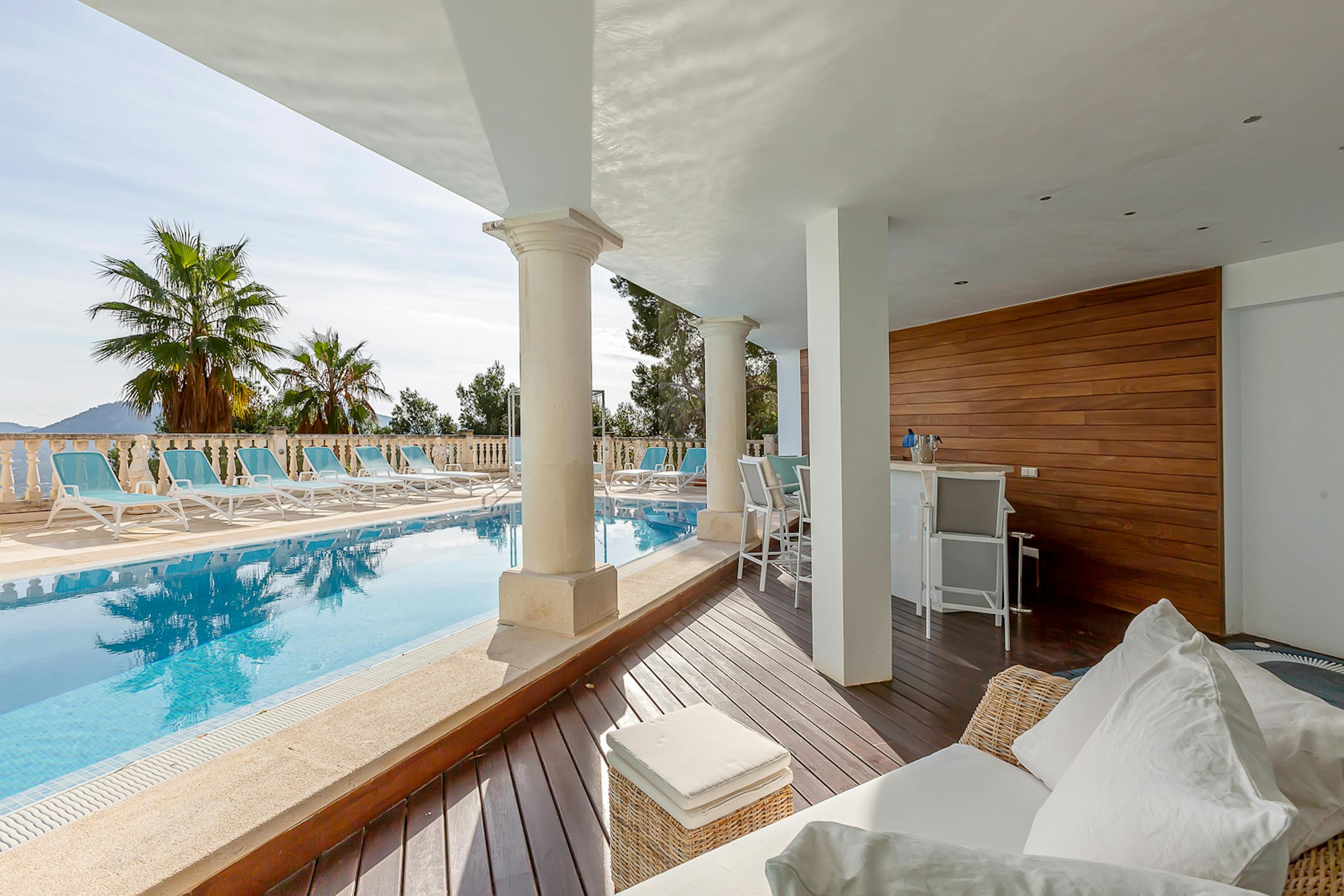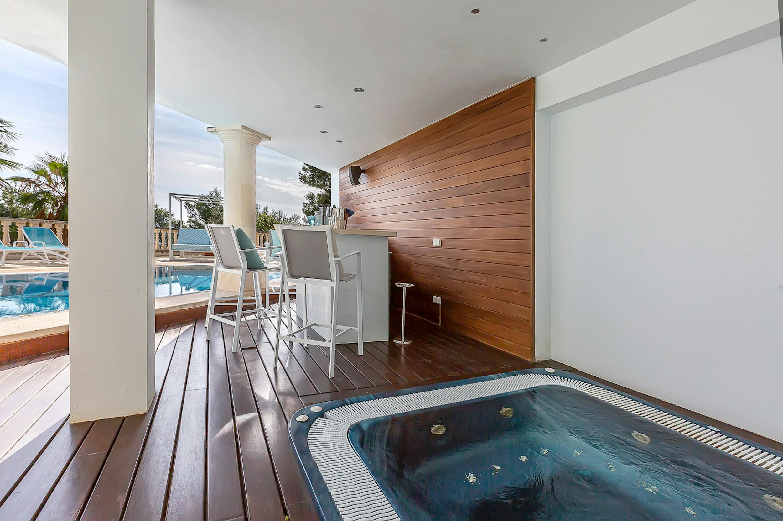 The mosaic-tiled pool, cushioned loungers, and Bali beds are the heart of outdoor relaxation. Adjacent, a covered terrace hosts a jacuzzi and bar, while a nearby fitness room, steam room and Finnish sauna offer options for detoxing or staying active. There is also a changing area with separate shower and bathroom and an additional private shower by the sauna and steam room.