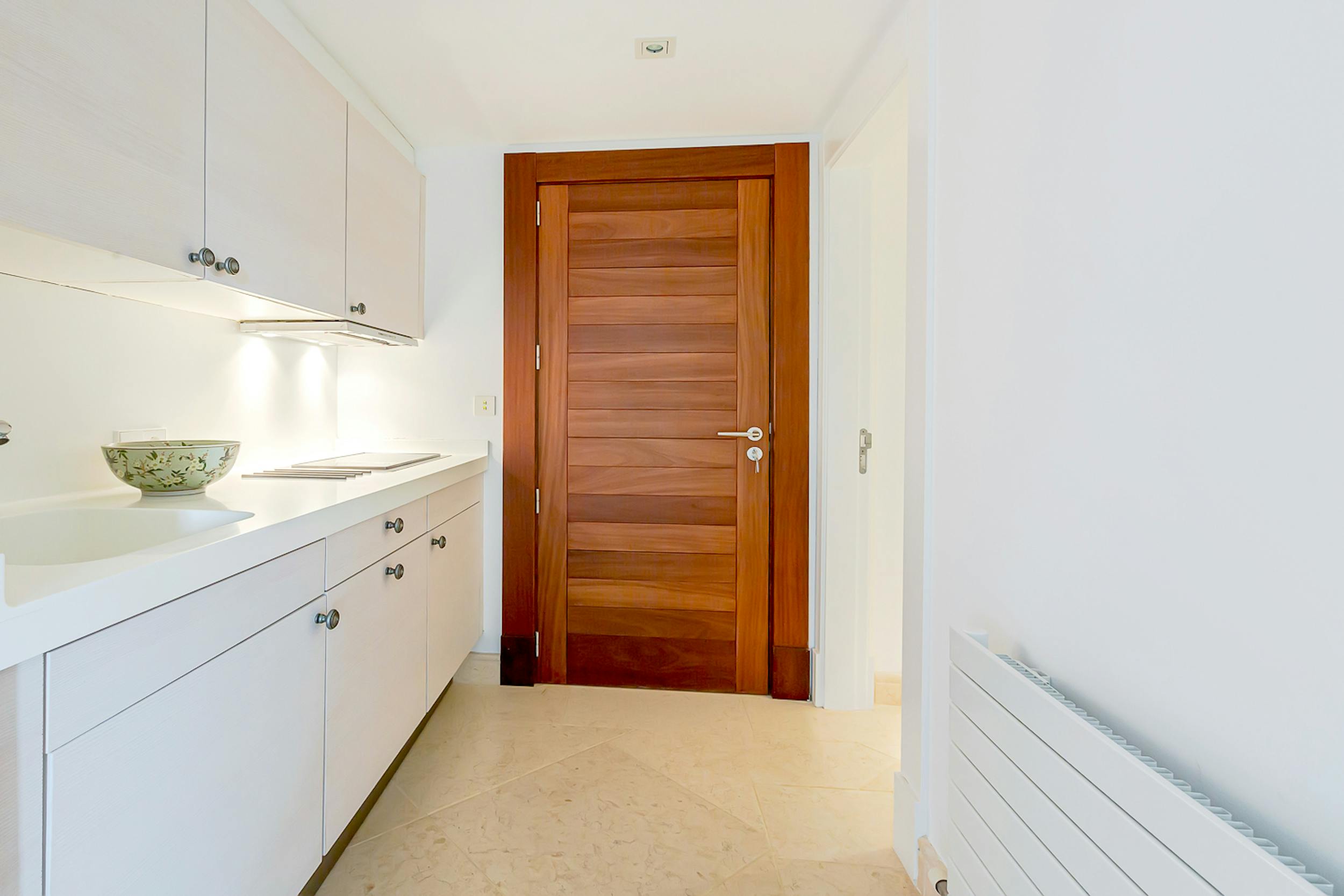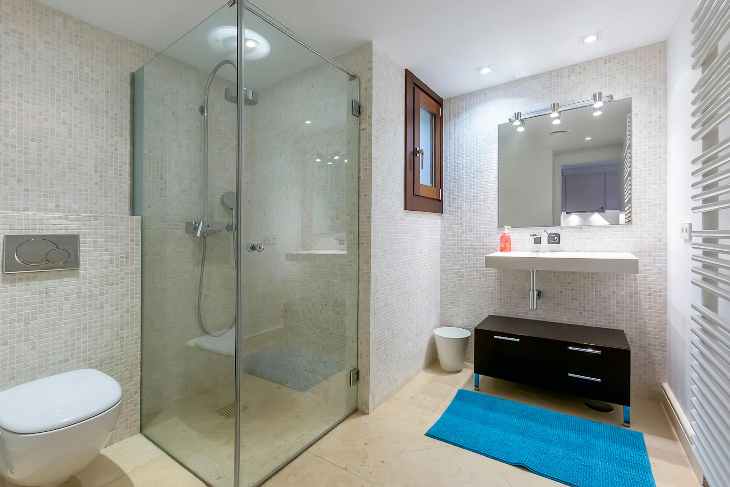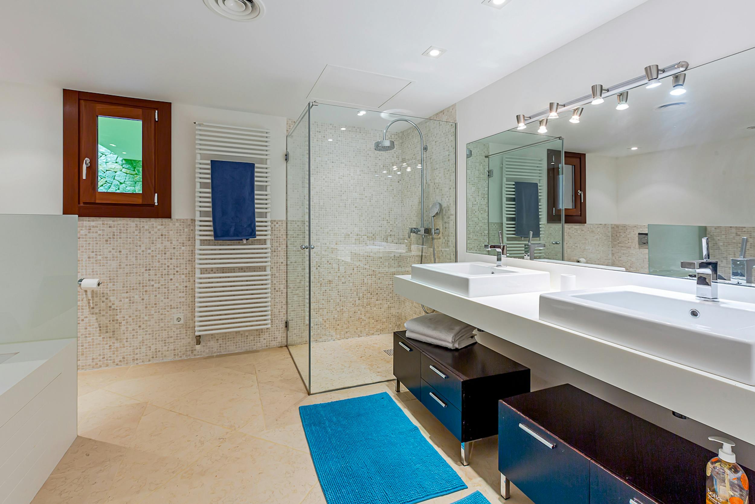 The mosaic-tiled pool, cushioned loungers, and Bali beds are the heart of outdoor relaxation. Adjacent, a covered terrace hosts a jacuzzi and bar, while a nearby fitness room, steam room and Finnish sauna offer options for detoxing or staying active. There is also a changing area with separate shower and bathroom and an additional private shower by the sauna and steam room.