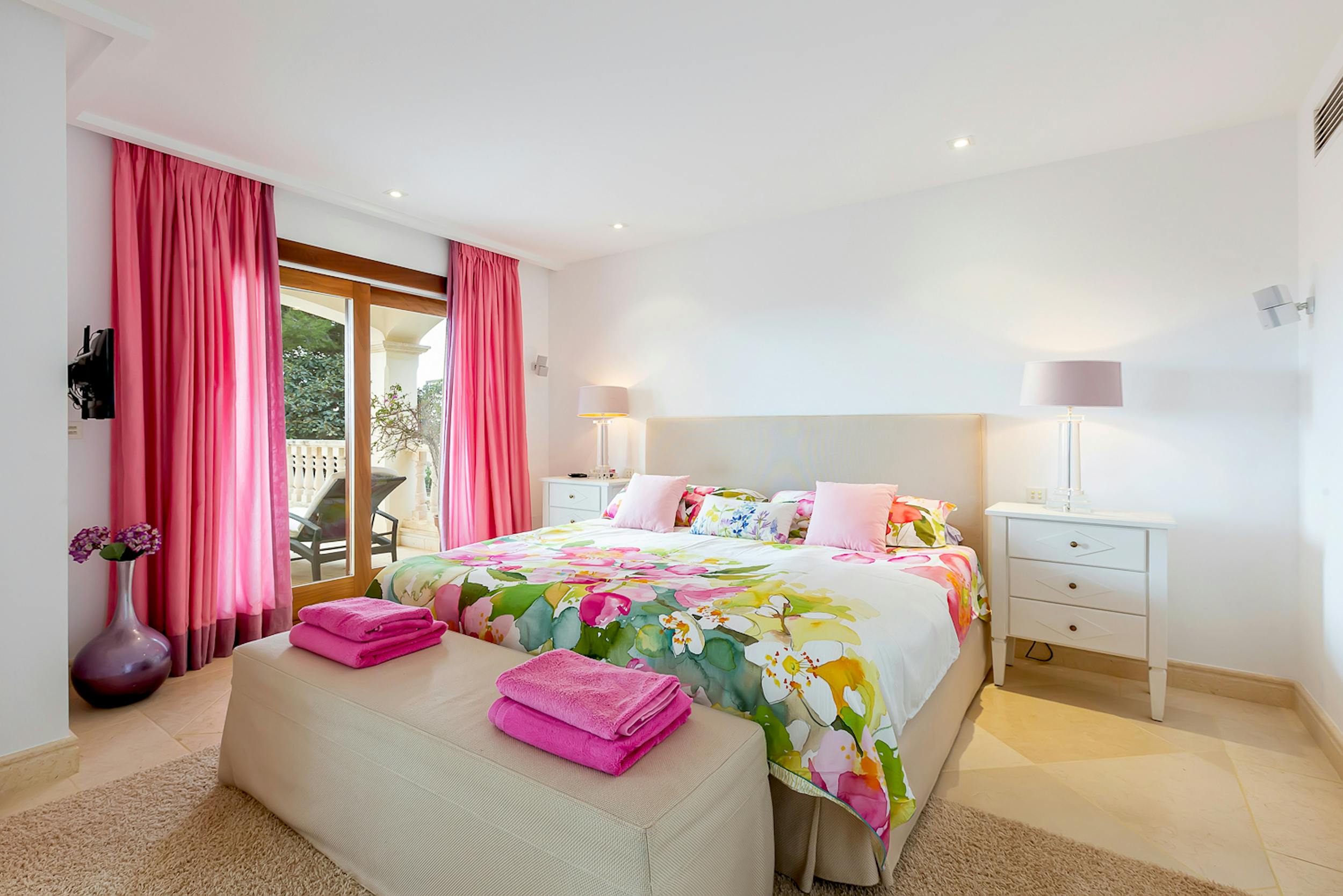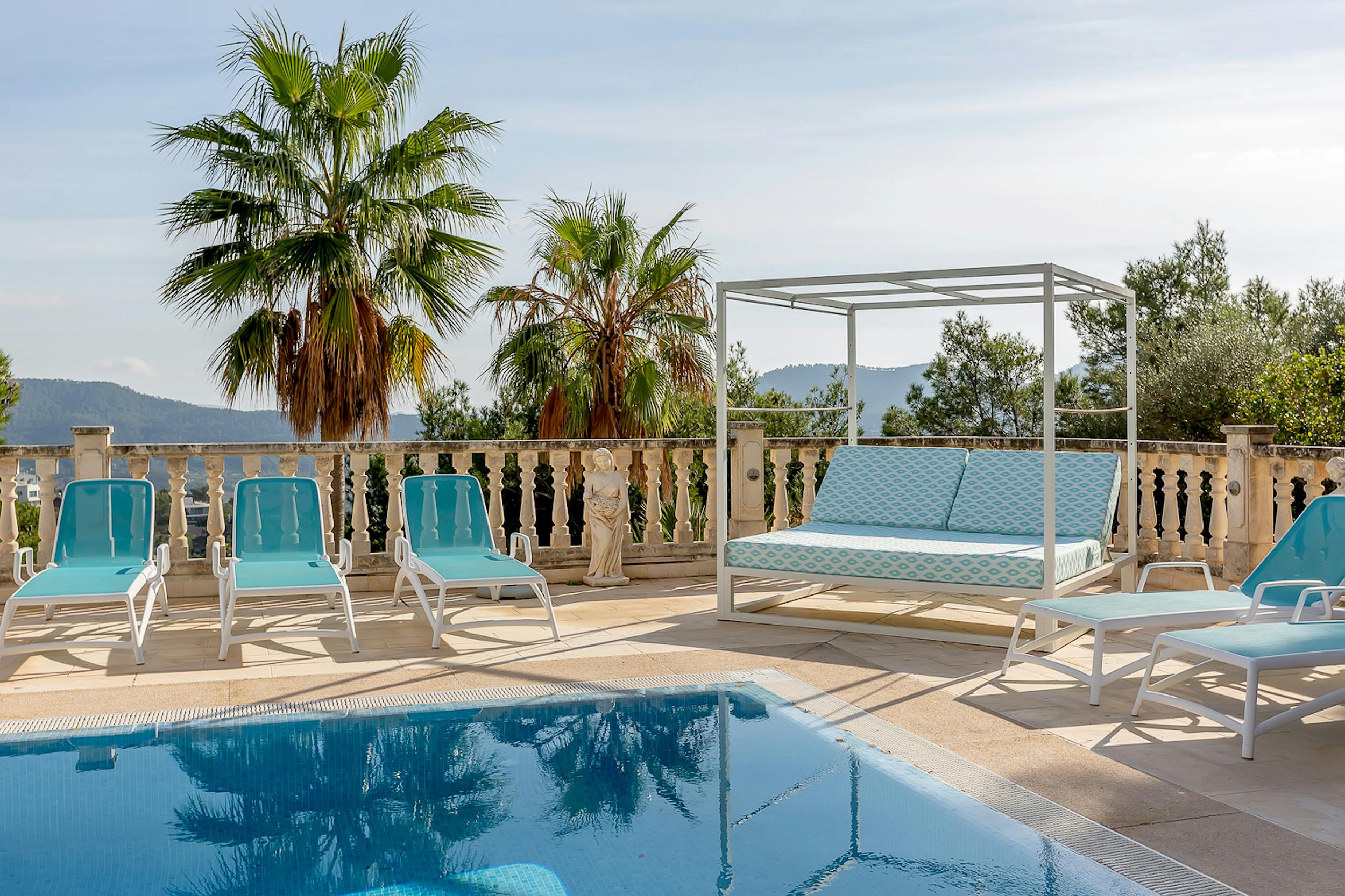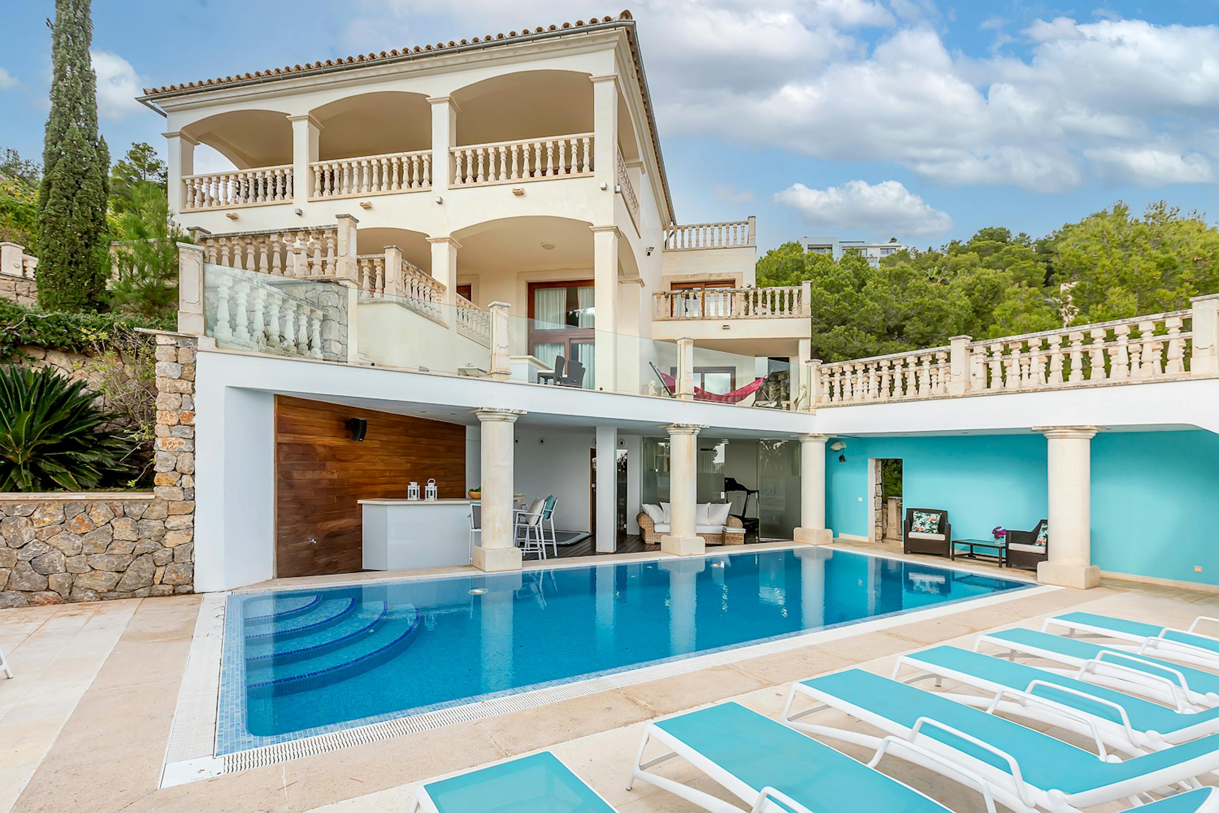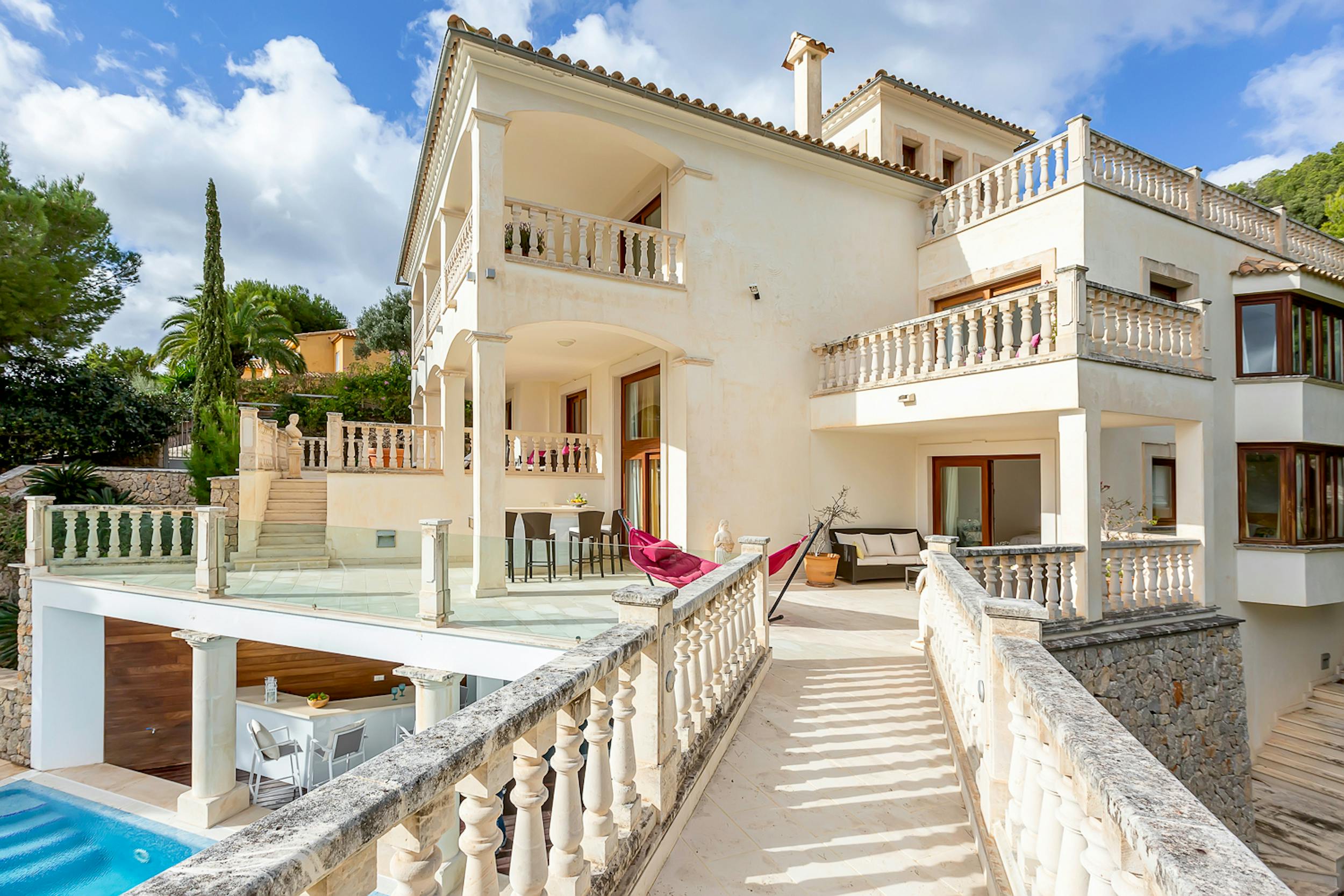 Celeste Sogni offers breathtaking views of one of Mallorca’s most picturesque bays. Designed with classical elegance, it features cascading levels, lush gardens, and a sunny pool area. Balustraded staircases, vibrant interiors, and relaxed furnishings create a serene yet stylish escape, ideal for soaking up the island’s charm.